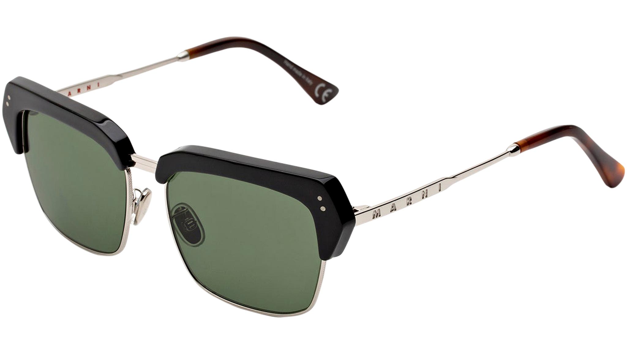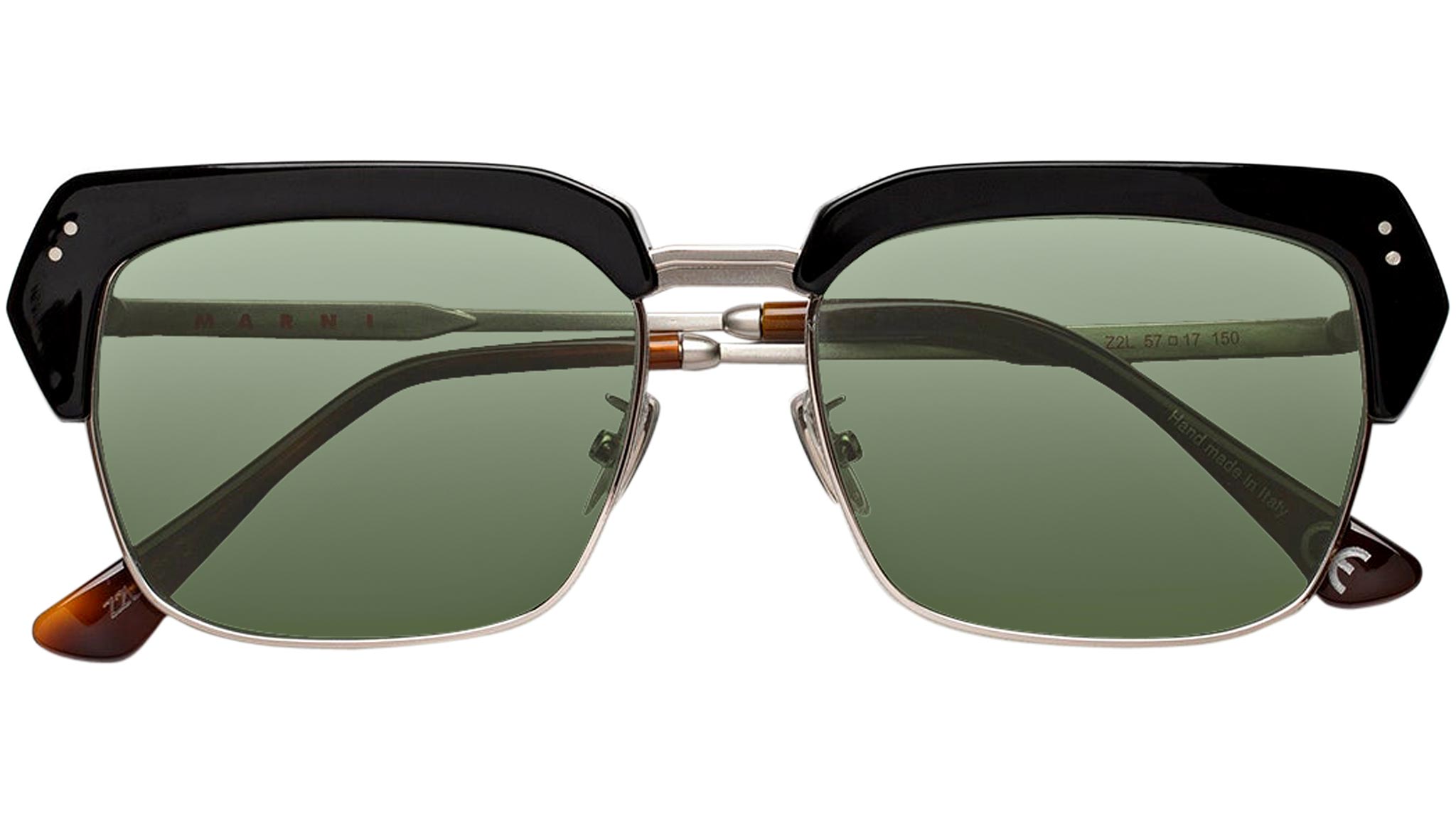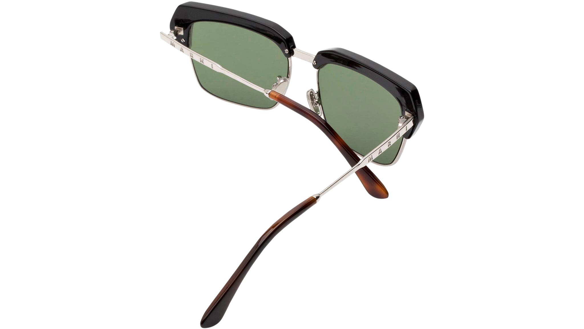 Designed exclusively for Marni, Three Gorges is a metal and acetate frame conceived as a bold contemporary interpretation of classic 1950s-style models. The shape features a thick acetate brow mounted on top of sleek metal rims, with a sturdy nose-bridge and temples. This version features a black acetate matched with silver metal finish and bottle green lenses. Sizes: R Lens Width: 55 mm. Frame Front: Frame Side: 145 mm. Product Code Size R: Z2L
