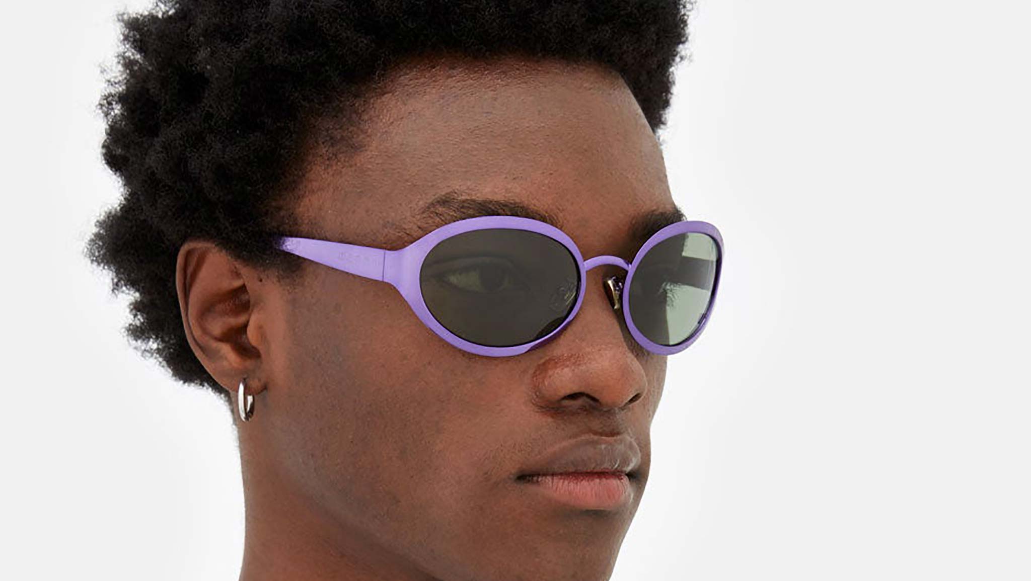 Designed exclusively for Marni, To-Sua is an innovative shape that welcomes the return of metal frames. An oversized design, To-Sua revisits the classic oval frames with a fresh sportswear-inspired approach. Thick metal rims have been moulded to form a wrap-around shape, for a quirky and unexpected piece of eyewear that merges high-tech design with contemporary style. This model is available in a purple metallic finish and wrap-around green lenses. Sizes: R Lens Width: 65 mm. Frame Front: Frame Side: 125 mm. Product Code Size R: 4UD