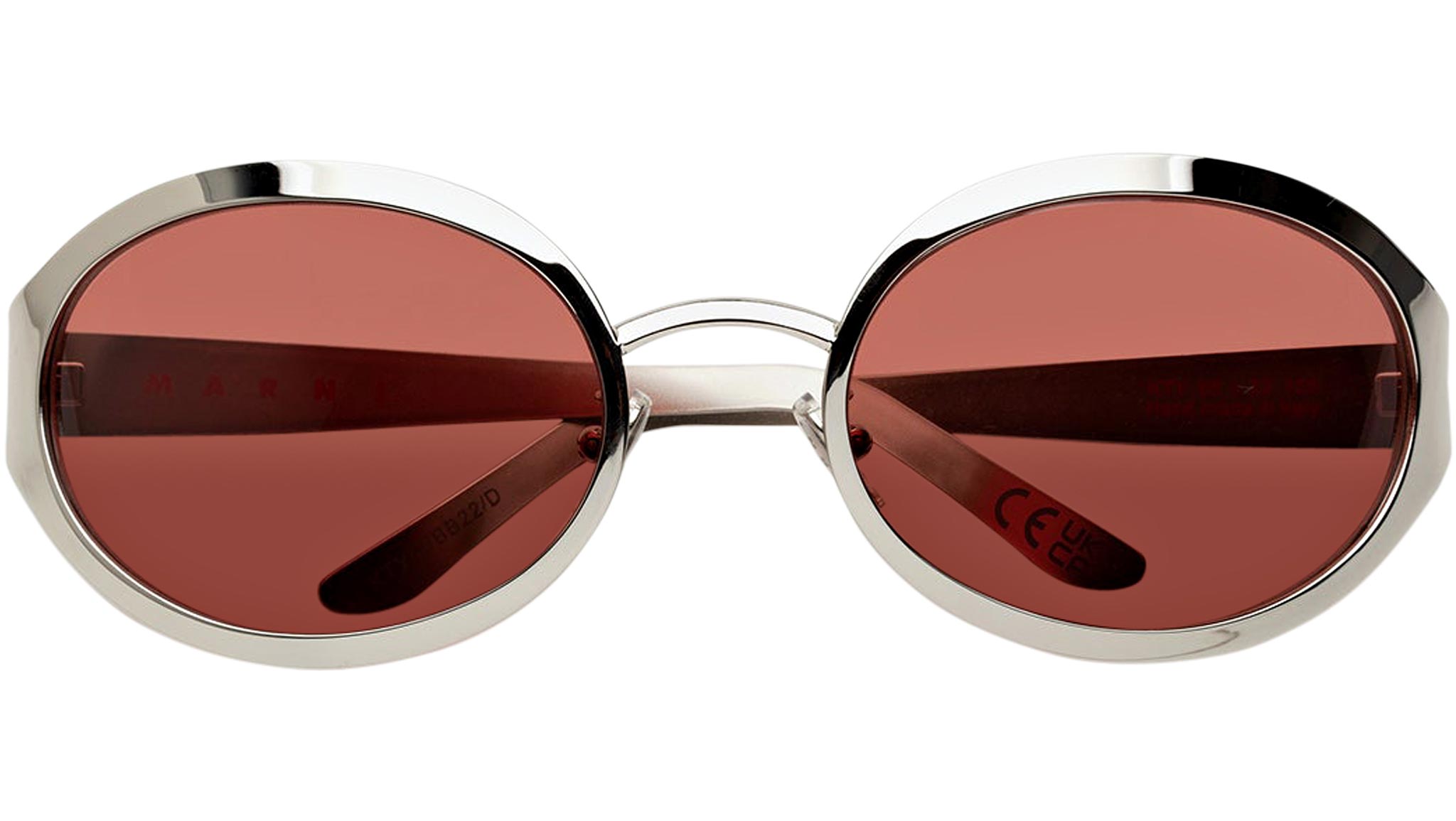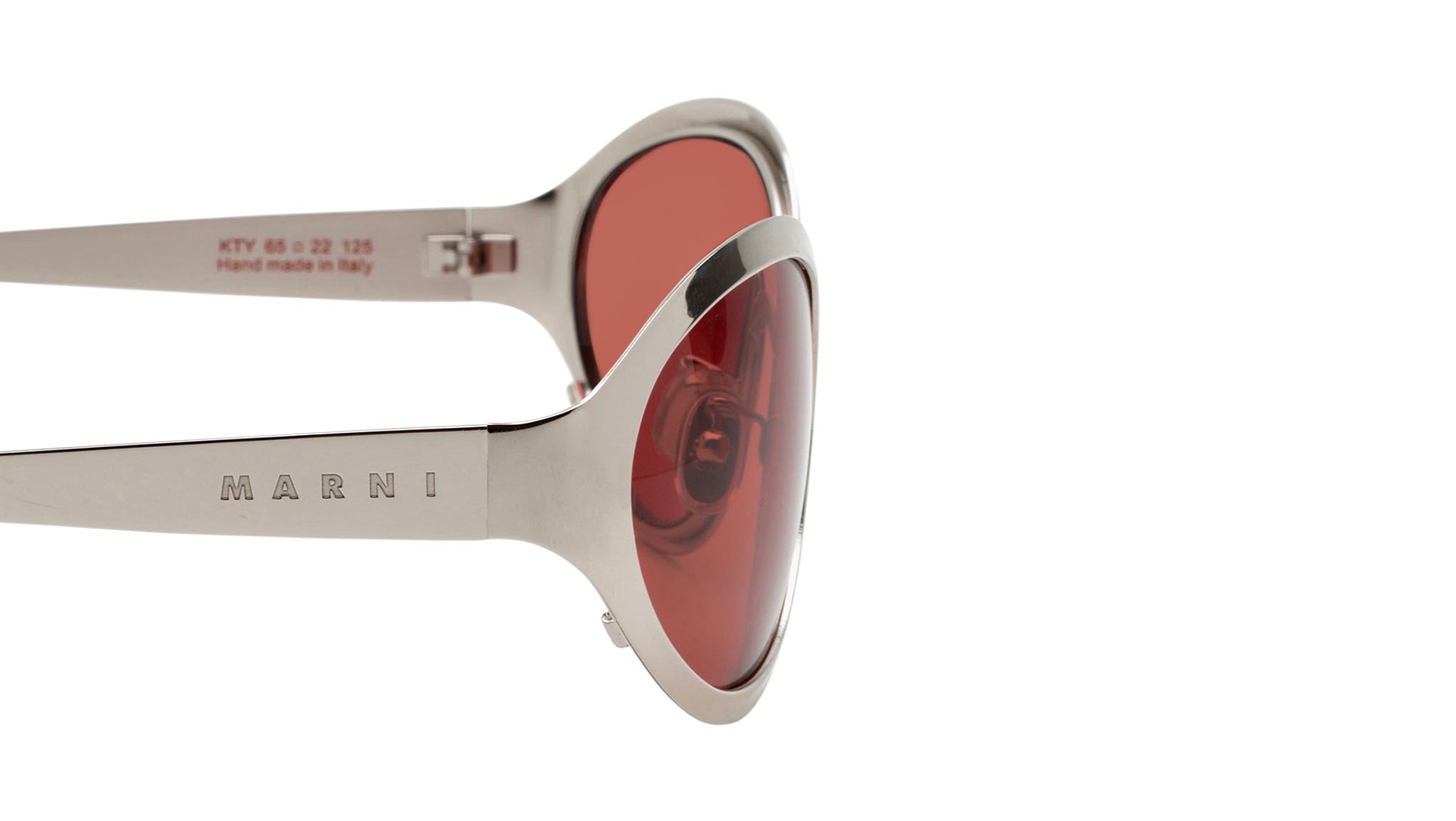 Designed exclusively for Marni, To-Sua is an innovative shape that welcomes the return of metal frames. An oversized design, To-Sua revisits the classic oval frames with a fresh sportswear-inspired approach. Lightweight and ultra-chromed metal rims have been moulded to form a wrap-around shape, for a quirky and unexpected piece of eyewear that merges high-tech design with contemporary style. This model is available in a silver metallic finish and wrap-around bordeaux lenses. Sizes: R Lens Width: 65 mm. Frame Front: Frame Side: 125 mm. Product Code Size R: KTY