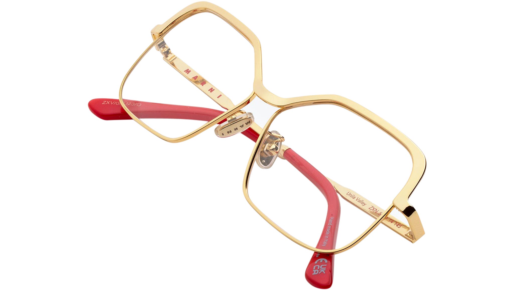 Designed exclusively for Marni, Unila Valley is an oversized silhouette characterized by a precise geometric shape. Its distinctive squared lenses are encased within a unique metal construction: a thick metal profile wraps around the upper part of the frame, forming its V-shaped nose bridge, while the lower part of the lens is held by thin metal rims. The final outcome is a sophisticated and feminine, yet lightweight design. This version comes in a gold metal finish. Sizes: R Lens Width: 56 mm. Frame Front: Frame Side: 135 mm. Product Code Size R: ZXN