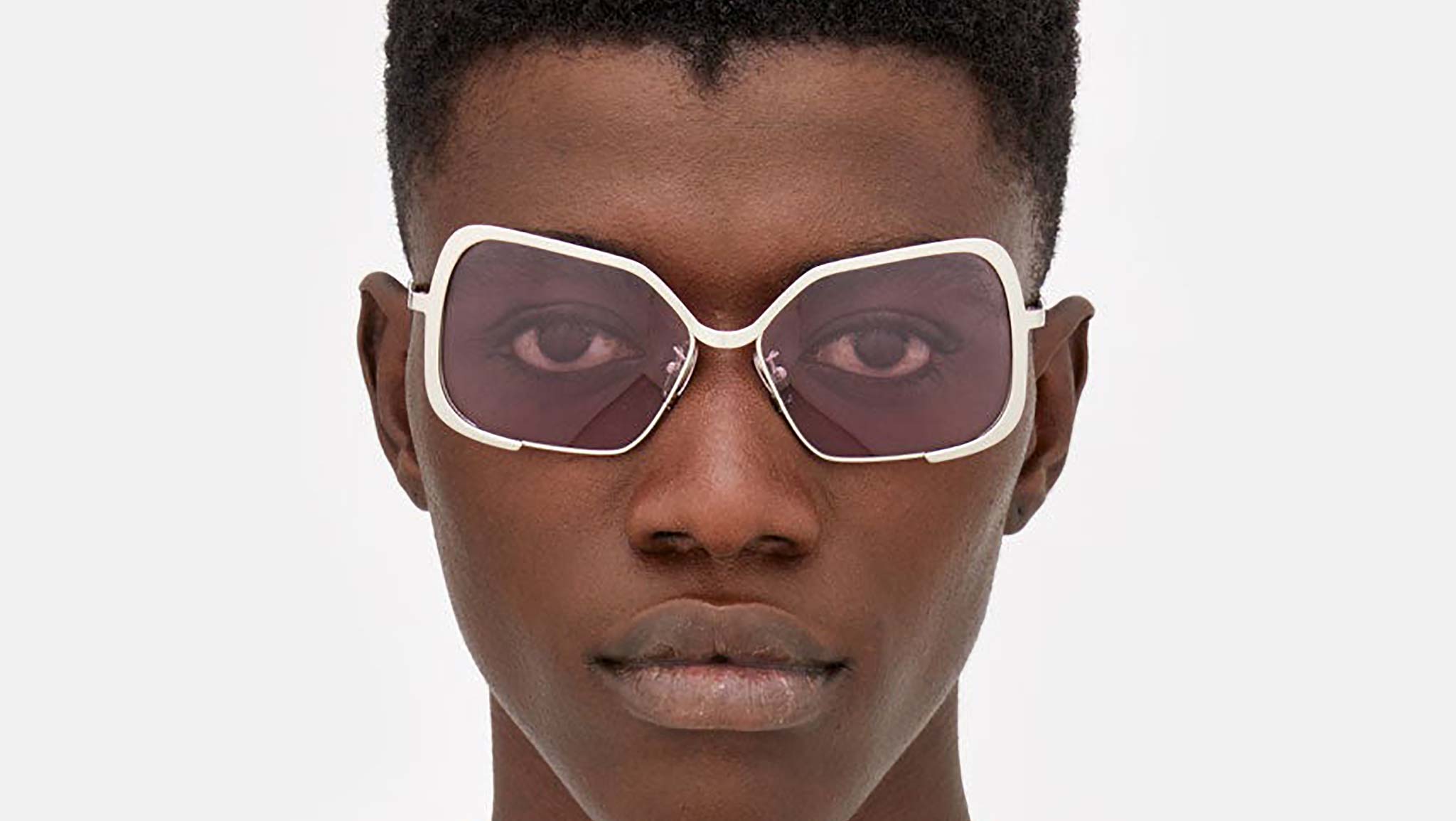 Designed exclusively for Marni, Unila is a unique oversized full-metal silhouette characterized by a single custom-moulded metal rod which carefully embraces the wide geometric lenses. The sturdy metal piece extends over the tow lenses and forms a soft U shaped nose bridge. With flexible metal temples, this is a sophisticated yet bold piece of design. This version of Unila features a silver metal finish, lilac tinted lenses and is topped off with elegant burgundy acetate temple tips. Sizes: R Lens Width: 58 mm. Frame Front: Frame Side: 135 mm. Product Code Size R: OEN