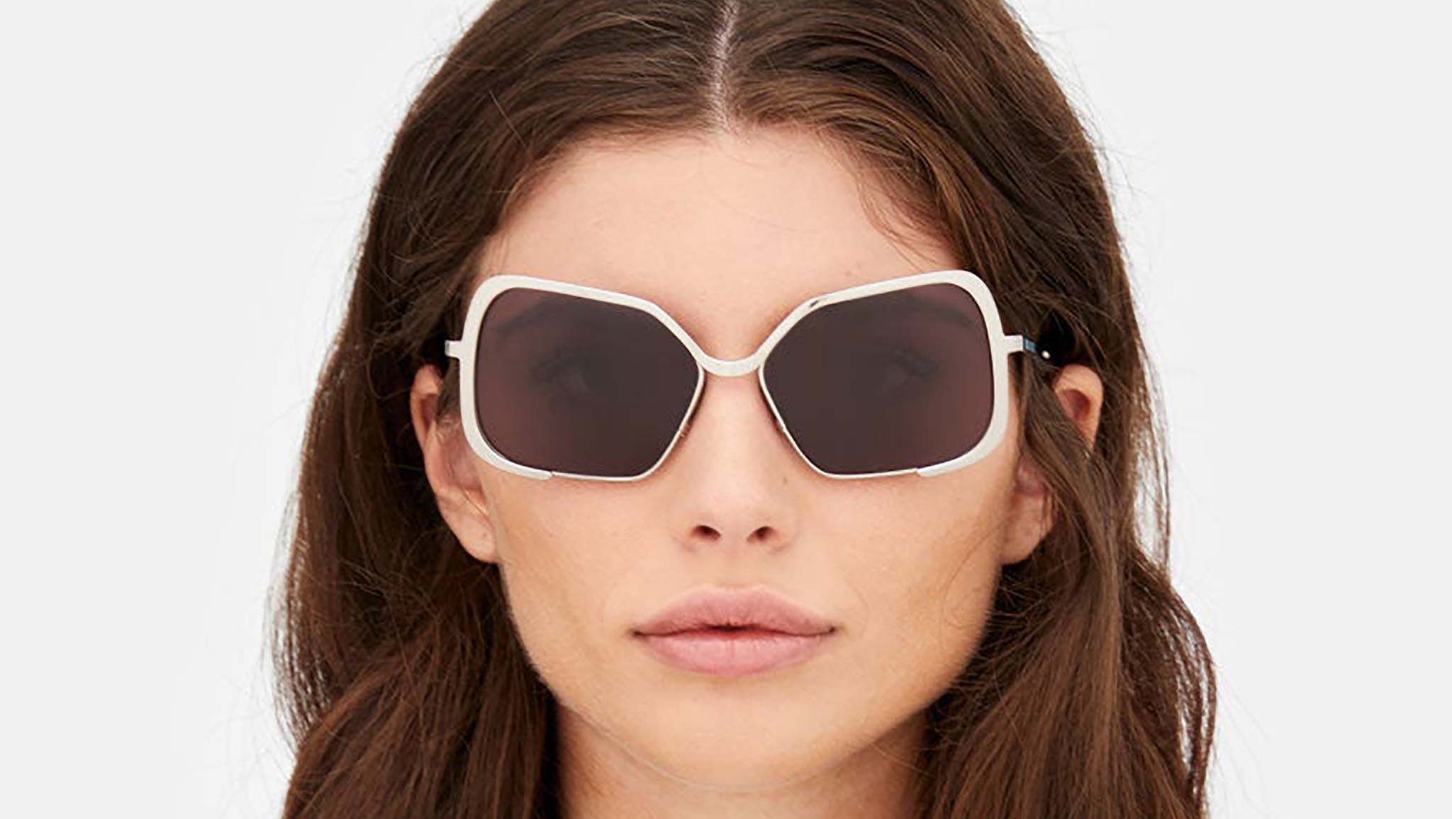 Designed exclusively for Marni, Unila is a unique oversized full-metal silhouette characterized by a single custom-moulded metal rod which carefully embraces the wide geometric lenses. The sturdy metal piece extends over the tow lenses and forms a soft U shaped nose bridge. With flexible metal temples, this is a sophisticated yet bold piece of design. This version of Unila features a silver metal finish, black lenses and is topped off with playful teal acetate temple tips. Sizes: R Lens Width: 58 mm. Frame Front: Frame Side: 135 mm. Product Code Size R: PO6