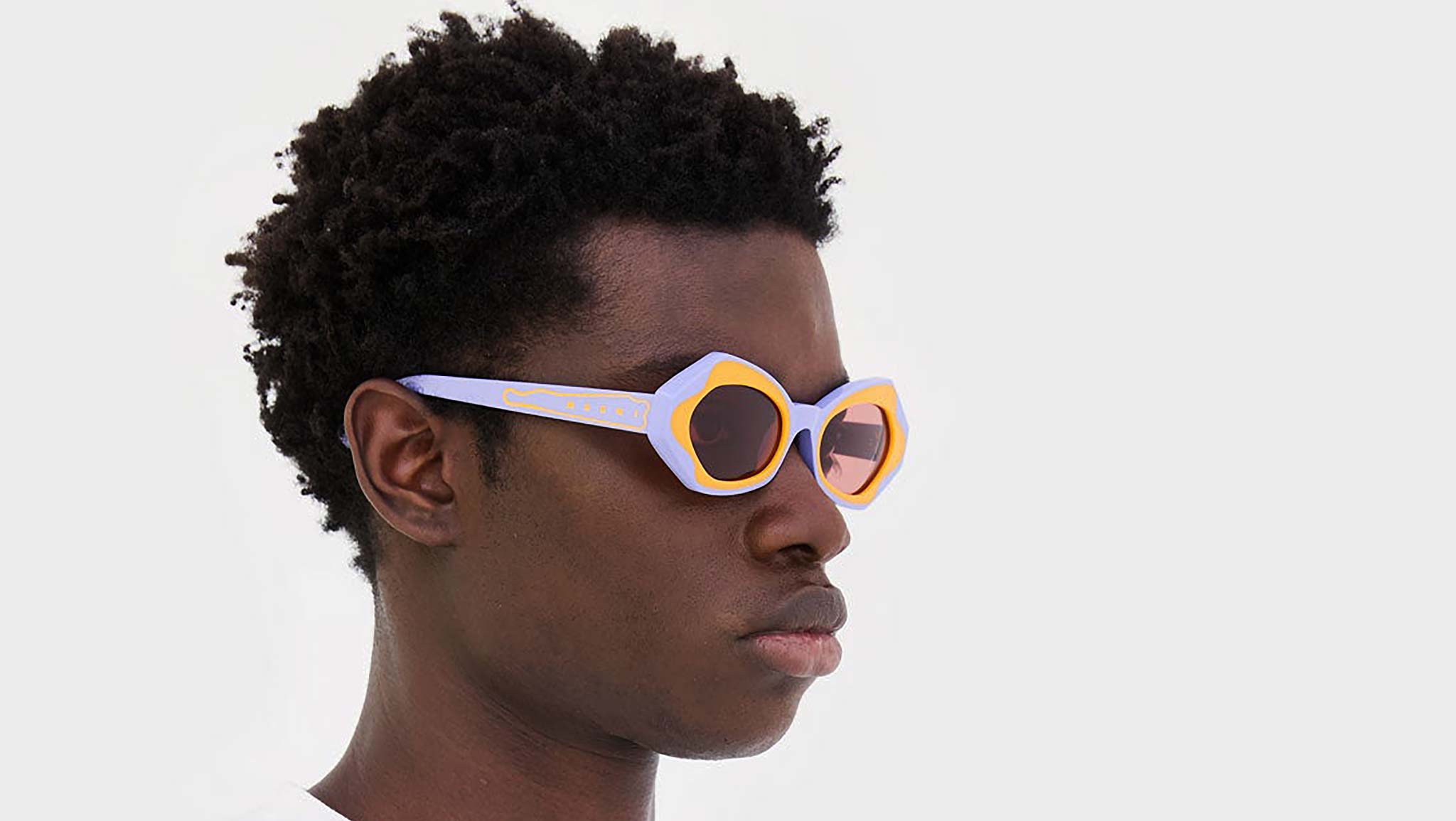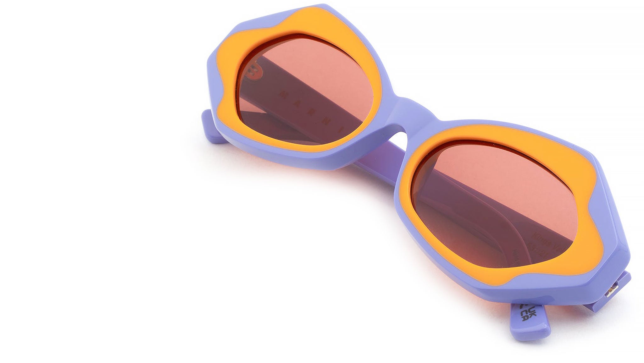 Designed exclusively for Marni, this model is a fitted silhouette that reimagines the flirty, playful appeal of classic cat-eye shapes with an experimental approach to craftsmanship. The silhouette features butterfly-like rims, with sharp angular lines on the temples and rounded curves around the nose-bridge. The model’s unique feature is a graphic outline around the lenses created by gluing together two different acetate colors: a solid lilac and a bright orange. Warm burgundy lenses complete the piece. Sizes: R Lens Width: 53 mm. Frame Front: Frame Side: 145 mm. Product Code Size R: D7V