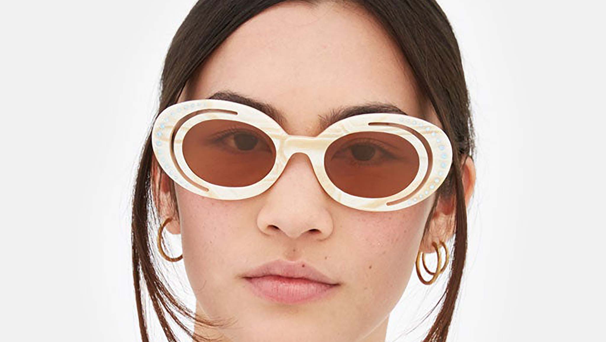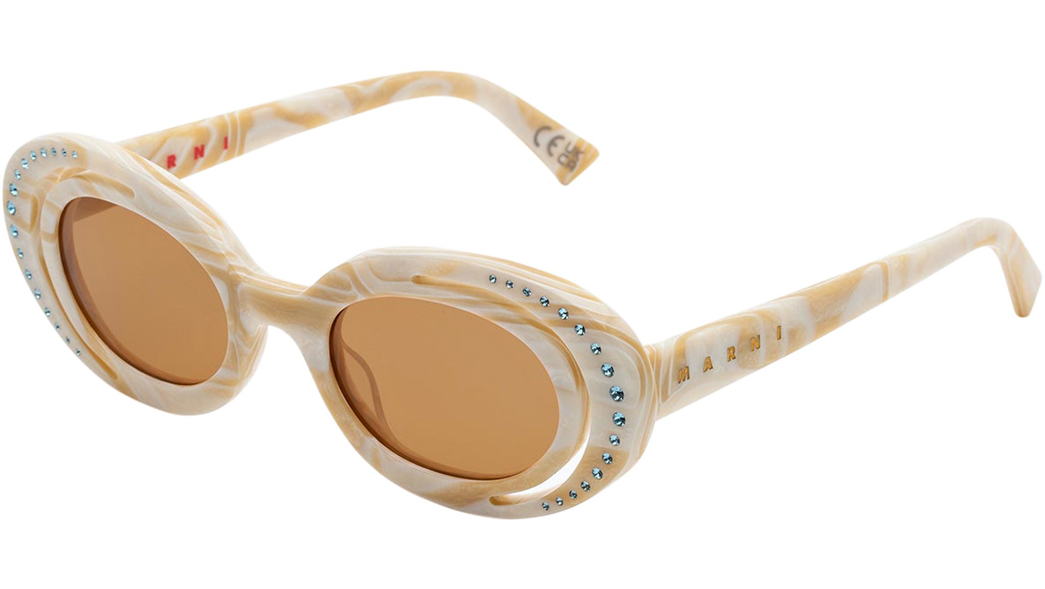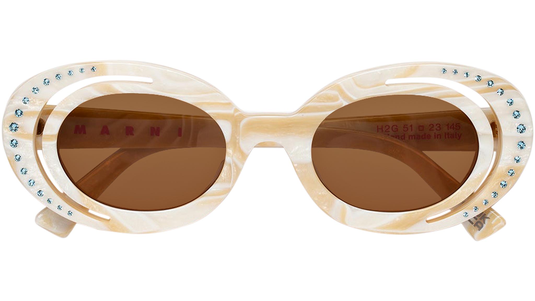 Designed exclusively for Marni, Zion Canyon is a unique silhouette characterised by an innovative, unexpected design and construction that elevates the oval frame. The model’s curvaceous and space-like rims have been completely carved out to form a half-moon shape on the outer edge. Sophisticated gems encased within the external acetate rings further elevate the piece’s shape while showcasing exceptional craftmanship and know-how of the made in Italy. This model is available in a pearly white acetate with brown tinted lenses. Sizes: R Lens Width: 51 mm. Frame Front: Frame Side: 145 mm. Product Code Size R: H2G