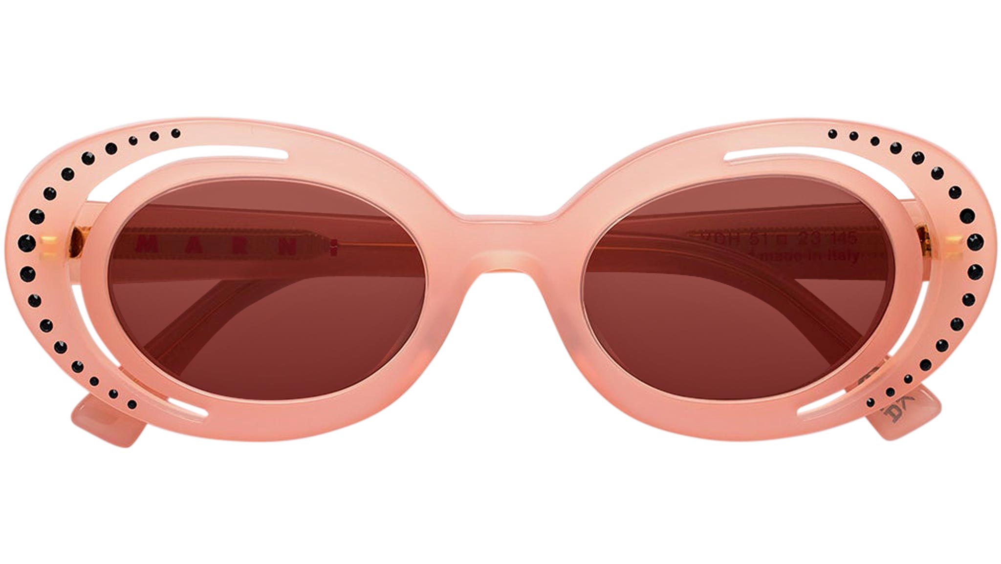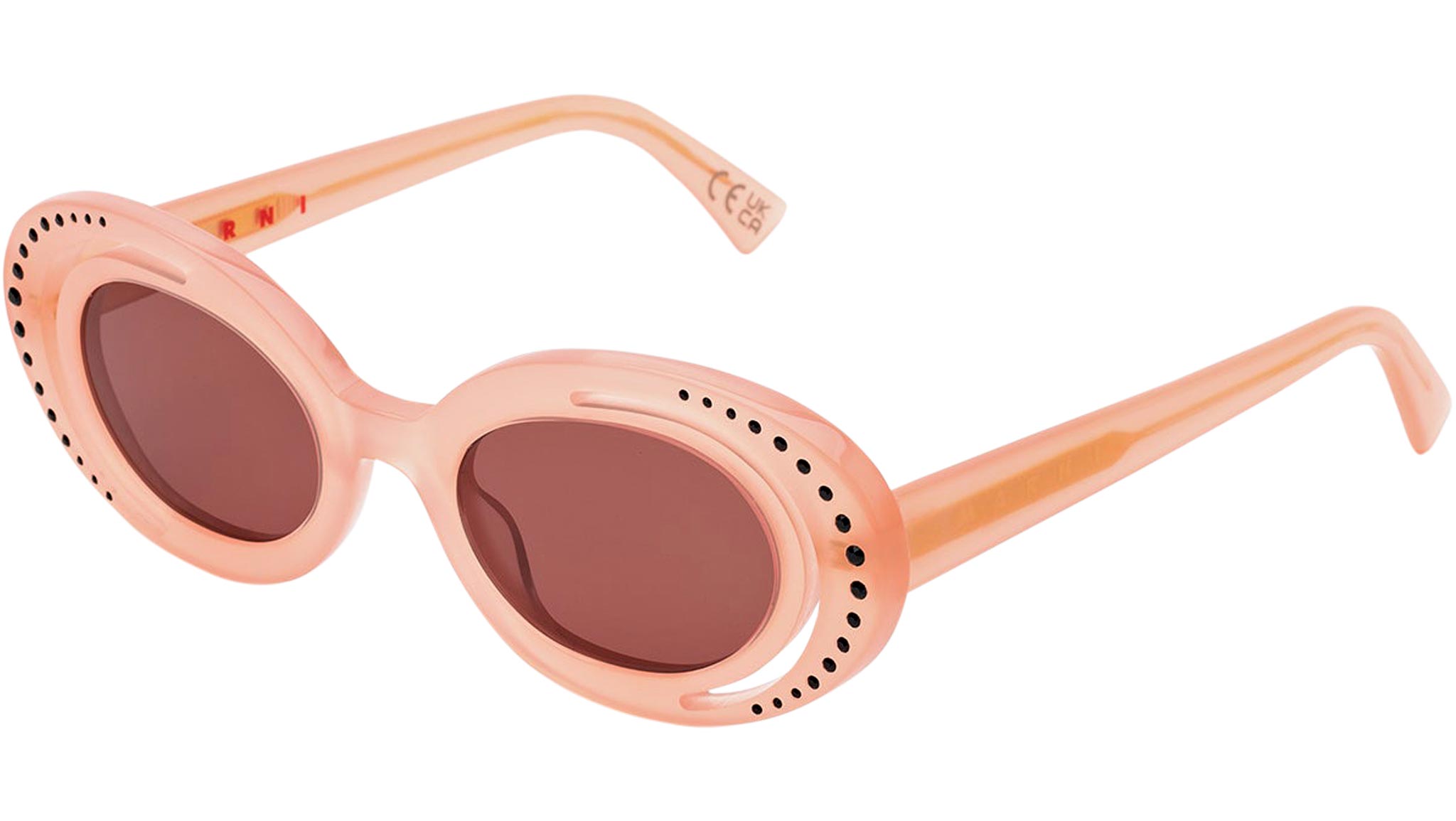Designed exclusively for Marni, Zion Canyon is a unique silhouette characterised by an innovative, unexpected design and construction that elevates the oval frame. The model’s curvaceous and space-like rims have been completely carved out to form a half-moon shape on the outer edge. Sophisticated gems encased within the external acetate rings further elevate the piece’s shape while showcasing exceptional craftmanship and know-how of the made in Italy. This model is available in a pale pink acetate with bordeaux lenses. Sizes: R Lens Width: 51 mm. Frame Front: Frame Side: 145 mm. Product Code Size R: VDH
