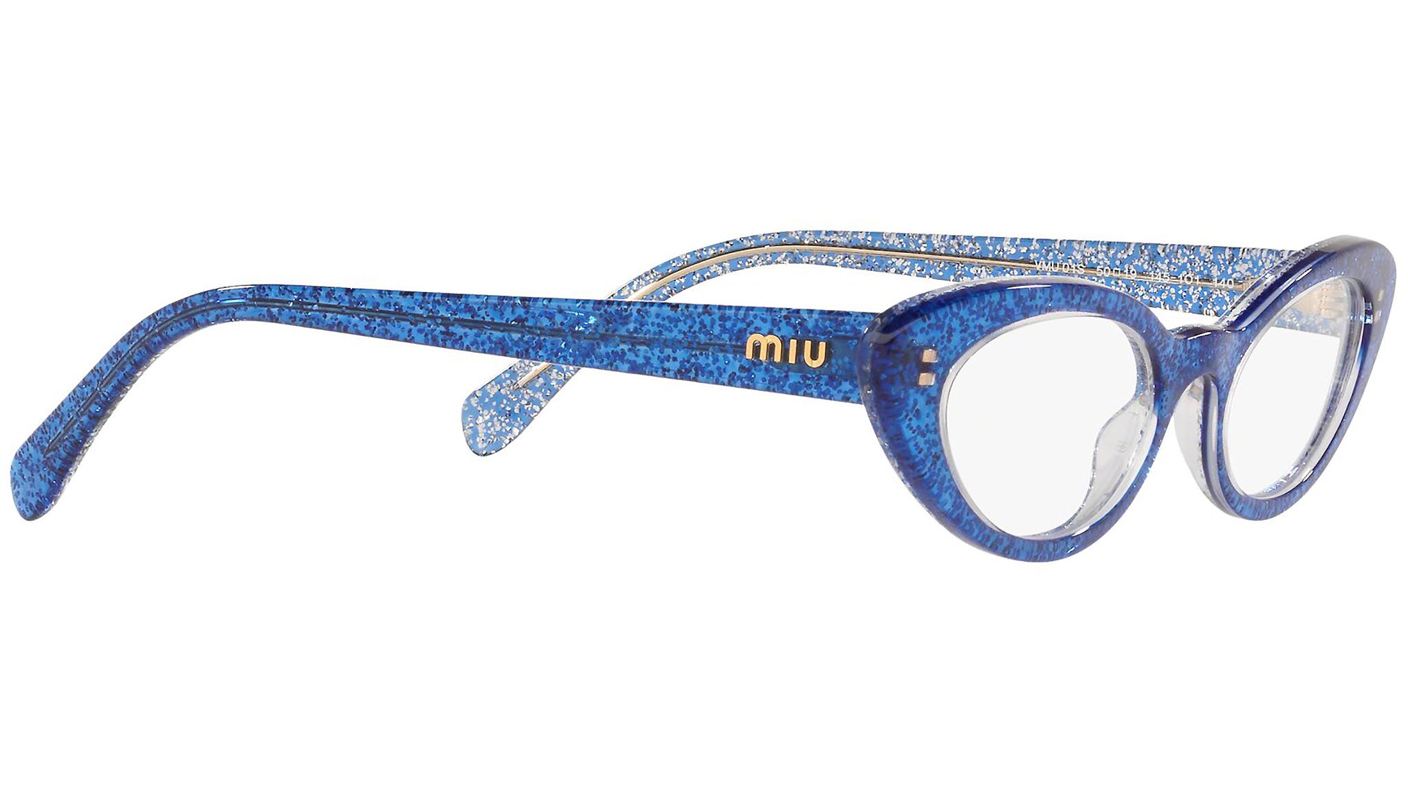 Occhiali da vista Miu Miu modello MU 01SV variante colore 1451O1 blu glitterato. Miu Miu offre creazioni uniche, in cui la costante ricerca stilistica si combina perfettamente con la maestria artigianale della lavorazione. Le silhouette femminili e sinuose delle montature sono espressione di una ricchezza dei dettagli che rispecchia pienamente i codici stilistici e l’indiscusso talento del brand nell’unire il design non convenzionale ad un romanticismo dai rimandi retrò.