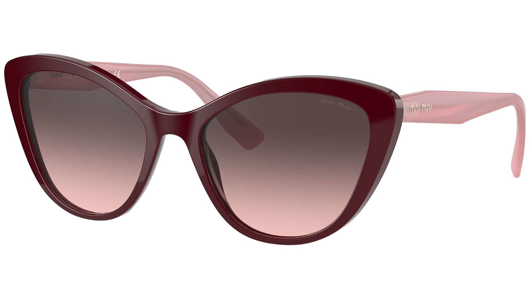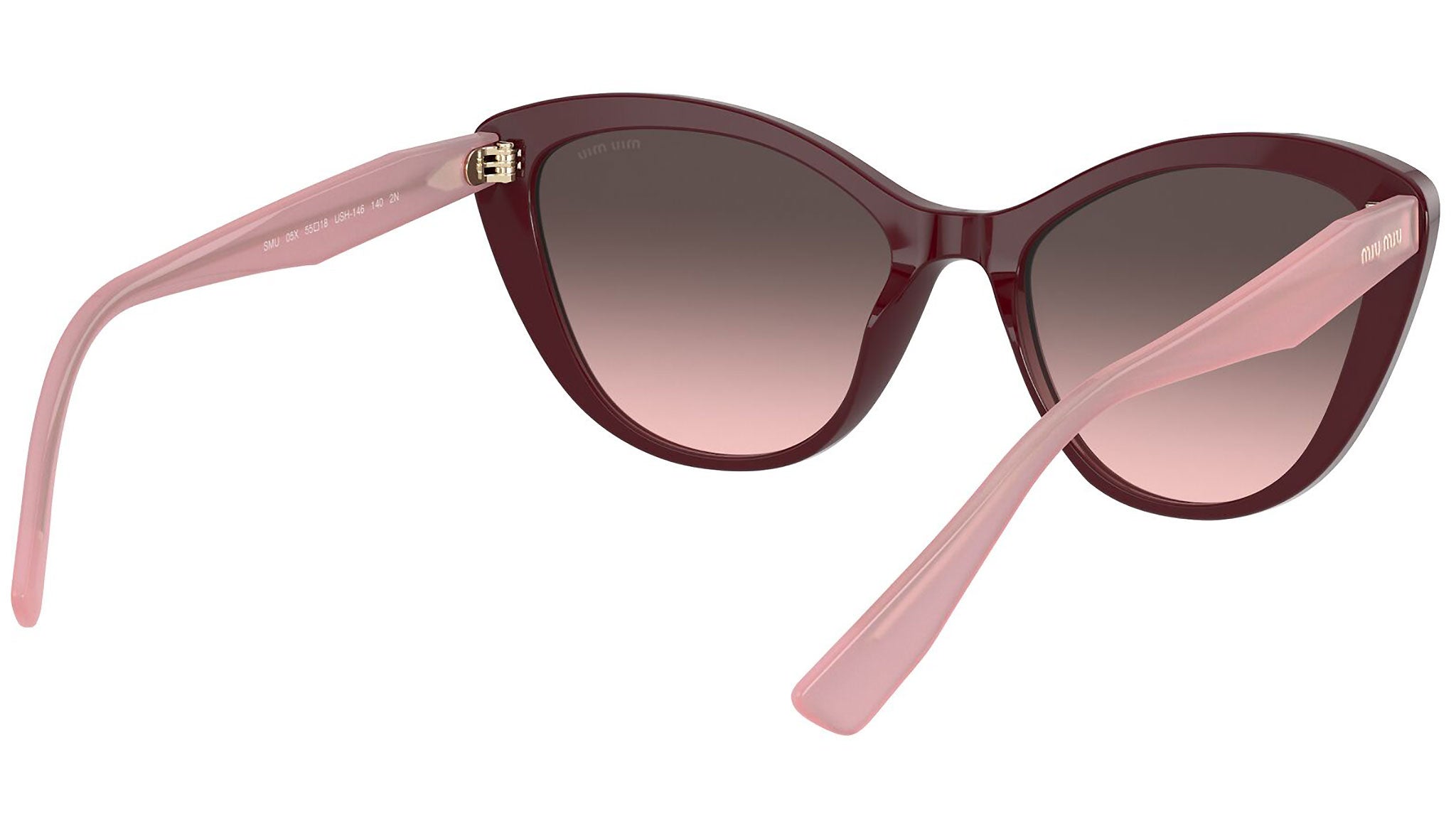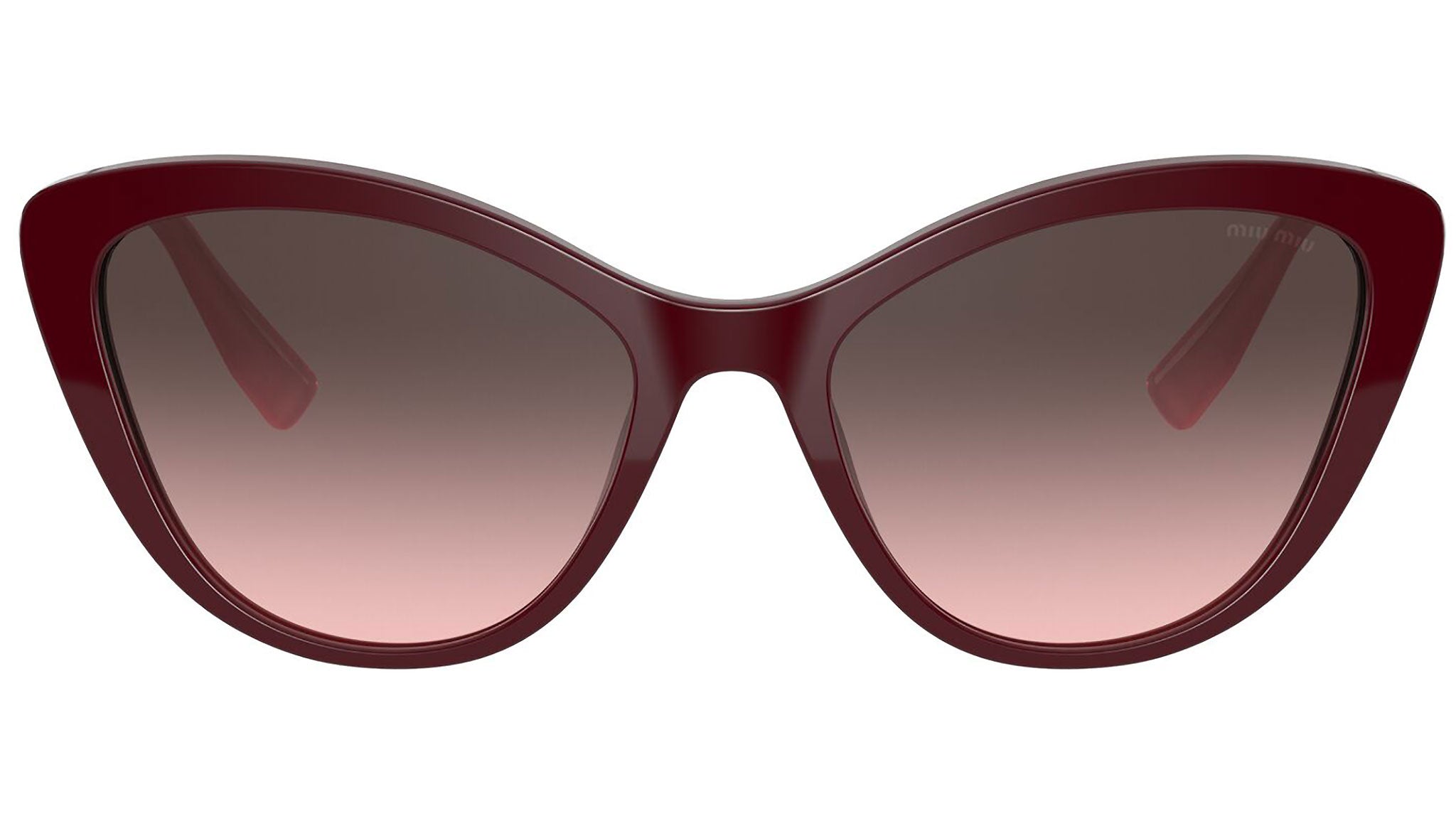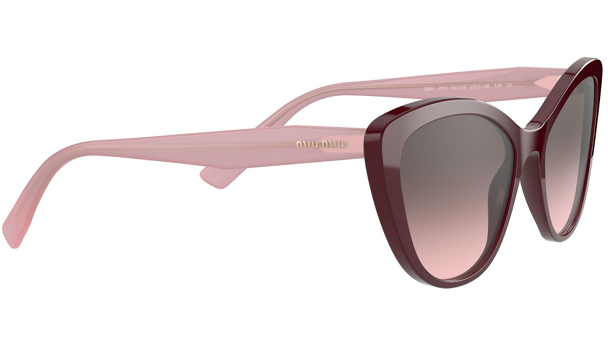Occhiali da sole Miu Miu modello MU 05XS variante colore USH146 bordeaux, con lenti color rosa sfumato grigio. Miu Miu offre creazioni uniche, in cui la costante ricerca stilistica si combina perfettamente con la maestria artigianale della lavorazione. Le silhouette femminili e sinuose delle montature sono espressione di una ricchezza dei dettagli che rispecchia pienamente i codici stilistici e l’indiscusso talento del brand nell’unire il design non convenzionale ad un romanticismo dai rimandi retrò.