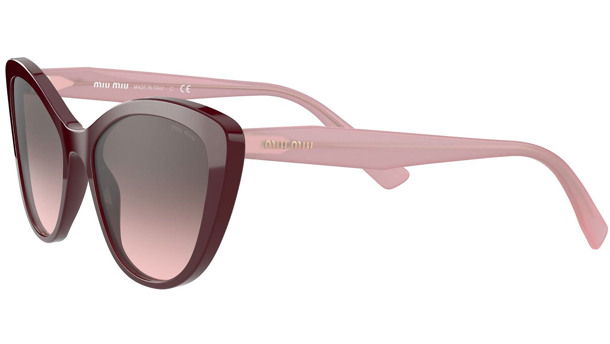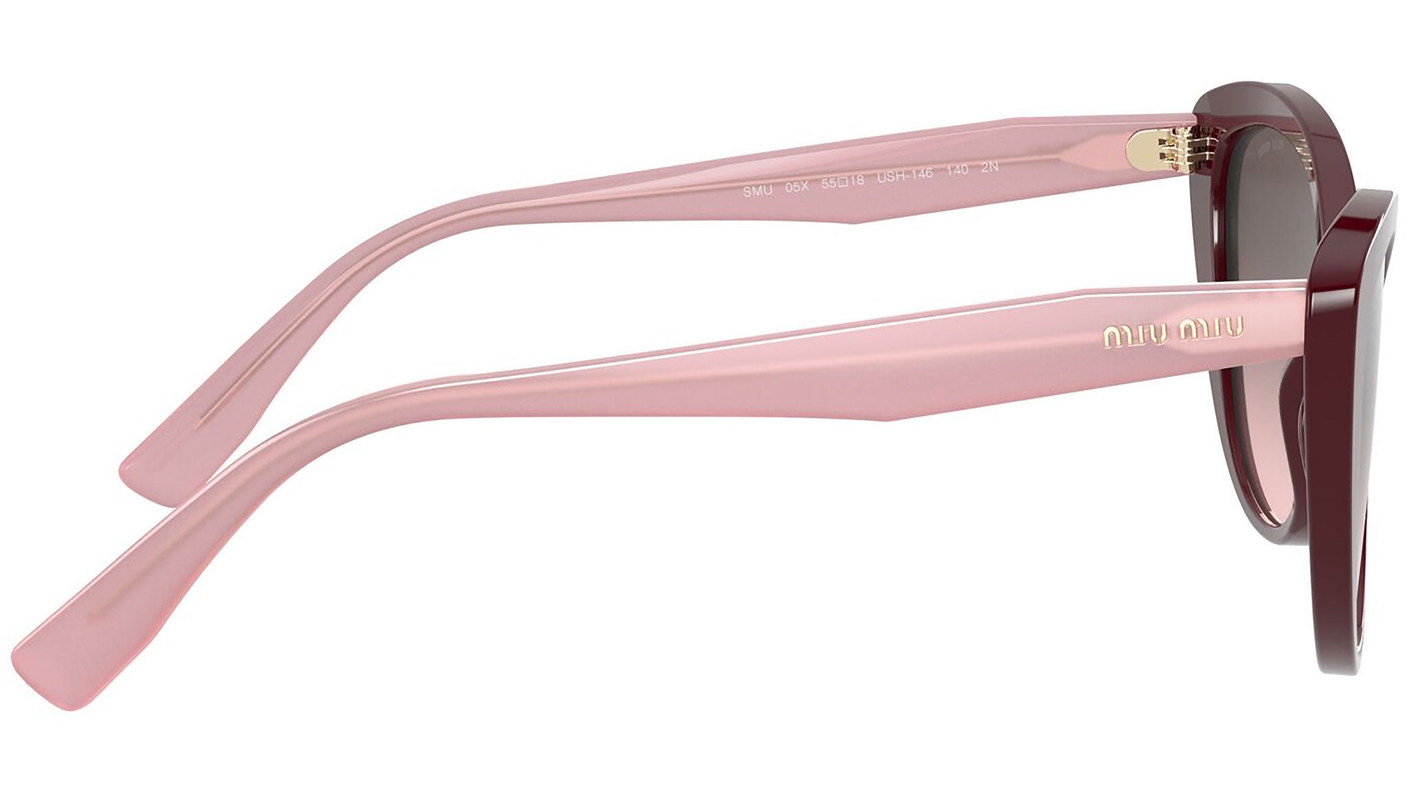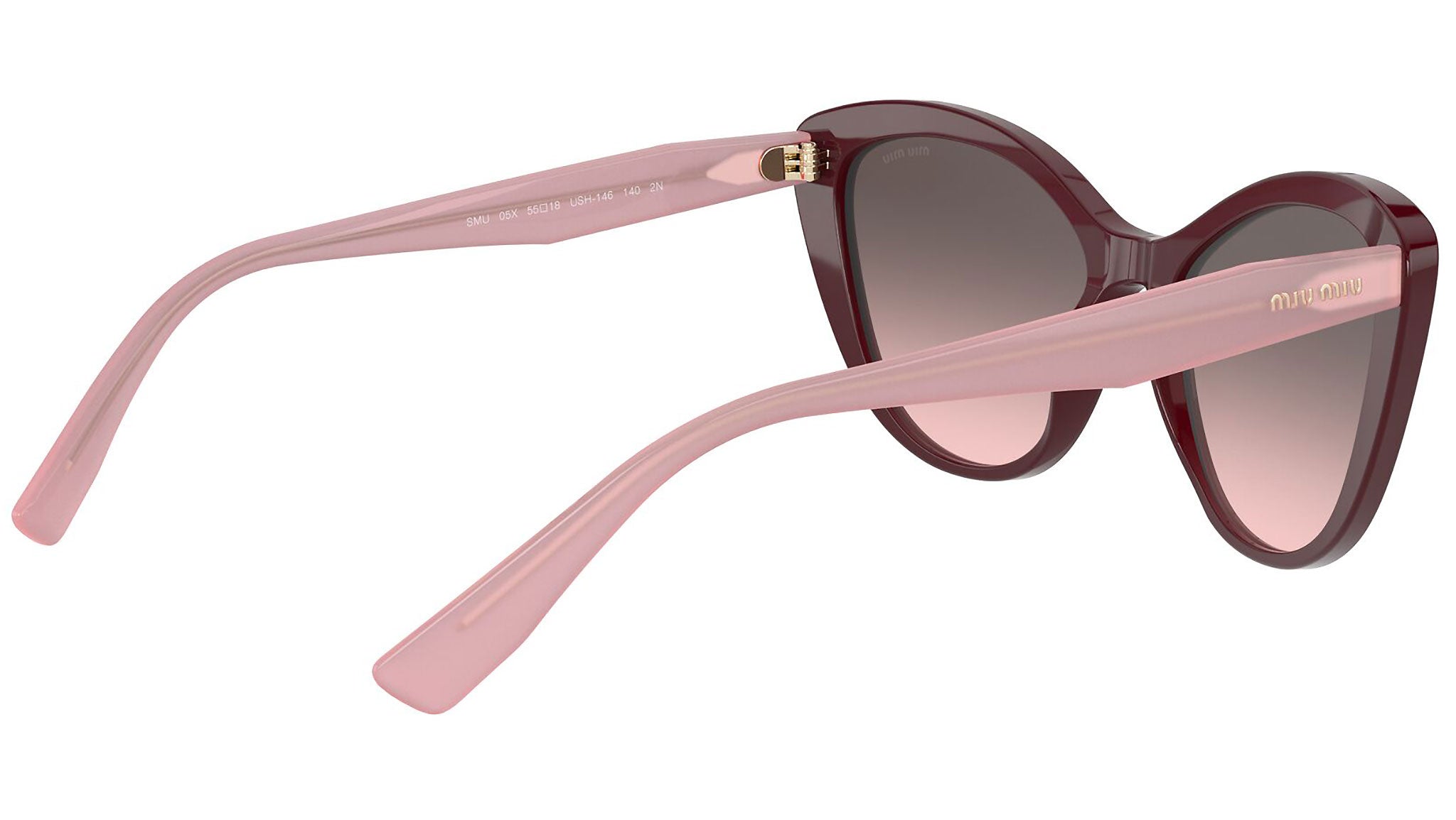 Occhiali da sole Miu Miu modello MU 05XS variante colore USH146 bordeaux, con lenti color rosa sfumato grigio. Miu Miu offre creazioni uniche, in cui la costante ricerca stilistica si combina perfettamente con la maestria artigianale della lavorazione. Le silhouette femminili e sinuose delle montature sono espressione di una ricchezza dei dettagli che rispecchia pienamente i codici stilistici e l’indiscusso talento del brand nell’unire il design non convenzionale ad un romanticismo dai rimandi retrò.
