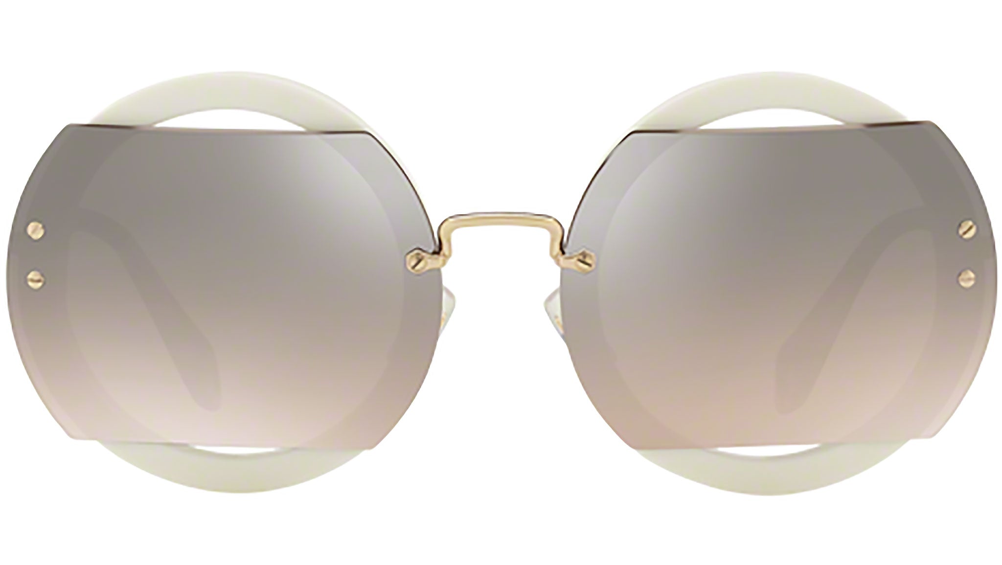 Occhiali da sole Miu Miu modello MU 06SS codice colore VAG4P0 con montatura color bianco / oro in acetato e lenti color marrone sfumato grigio specchio argento. Miu Miu offre creazioni uniche, in cui la costante ricerca stilistica si combina perfettamente con la maestria artigianale della lavorazione. Le silhouette femminili e sinuose delle montature sono espressione di una ricchezza dei dettagli che rispecchia pienamente i codici stilistici e l’indiscusso talento del brand nell’unire il design non convenzionale ad un romanticismo dai rimandi retrò.