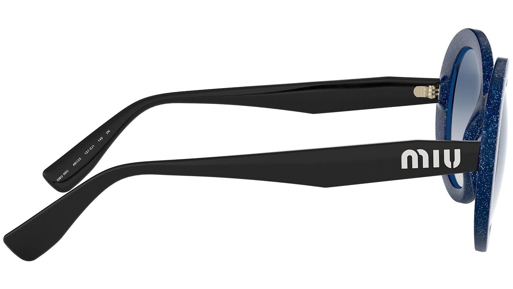 Occhiali da sole Miu Miu modello MU 06US variante colore 1272J1 blu glitter trasparente, con lenti color blu sfumato grigio. Miu Miu offre creazioni uniche, in cui la costante ricerca stilistica si combina perfettamente con la maestria artigianale della lavorazione. Le silhouette femminili e sinuose delle montature sono espressione di una ricchezza dei dettagli che rispecchia pienamente i codici stilistici e l’indiscusso talento del brand nell’unire il design non convenzionale ad un romanticismo dai rimandi retrò.
