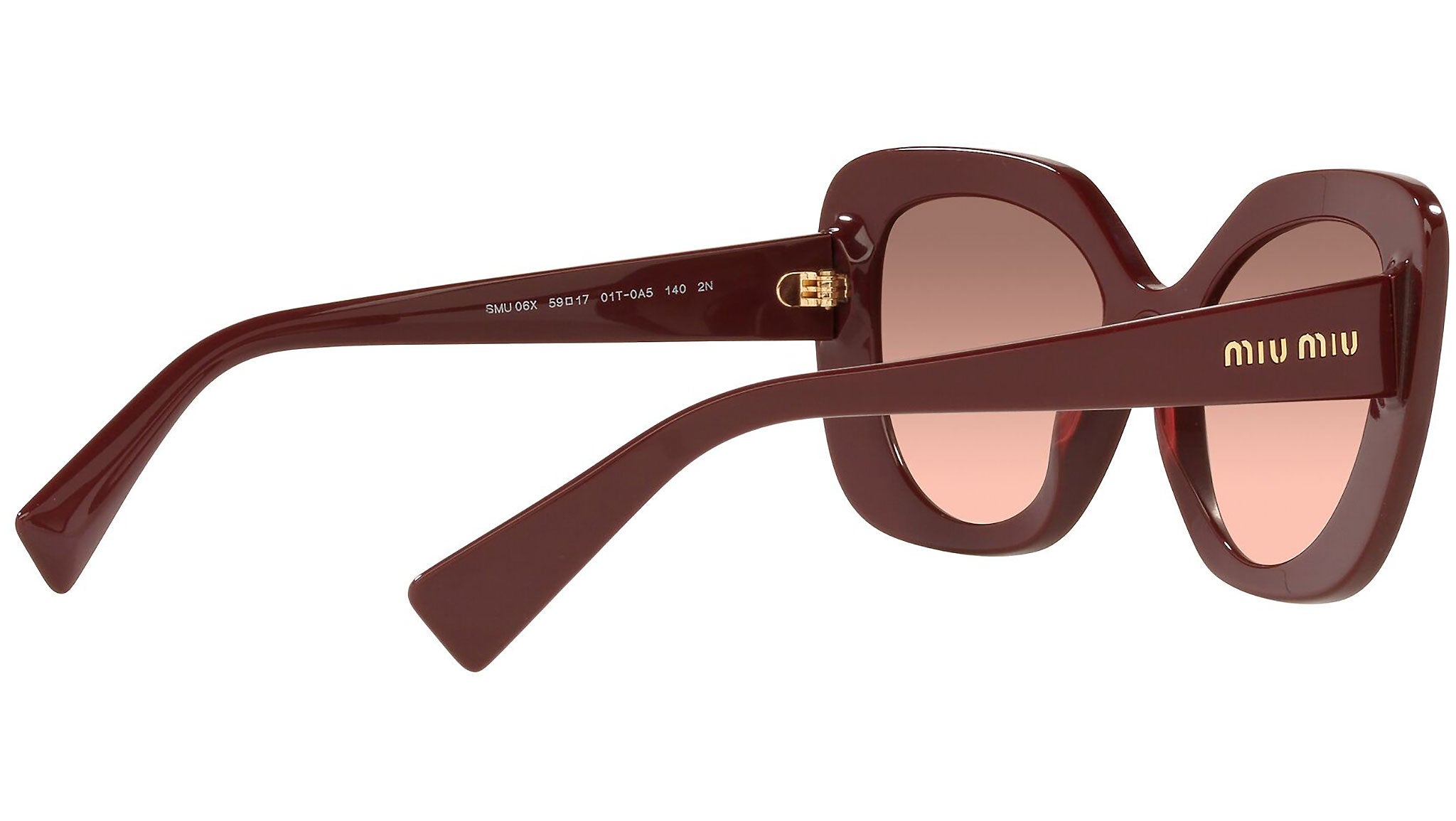 Occhiali da sole Miu Miu modello MU 06XS variante colore 01T0A5 rosa bordeaux, con lenti color rosa sfumato marrone scuro. Miu Miu offre creazioni uniche, in cui la costante ricerca stilistica si combina perfettamente con la maestria artigianale della lavorazione. Le silhouette femminili e sinuose delle montature sono espressione di una ricchezza dei dettagli che rispecchia pienamente i codici stilistici e l’indiscusso talento del brand nell’unire il design non convenzionale ad un romanticismo dai rimandi retrò.
