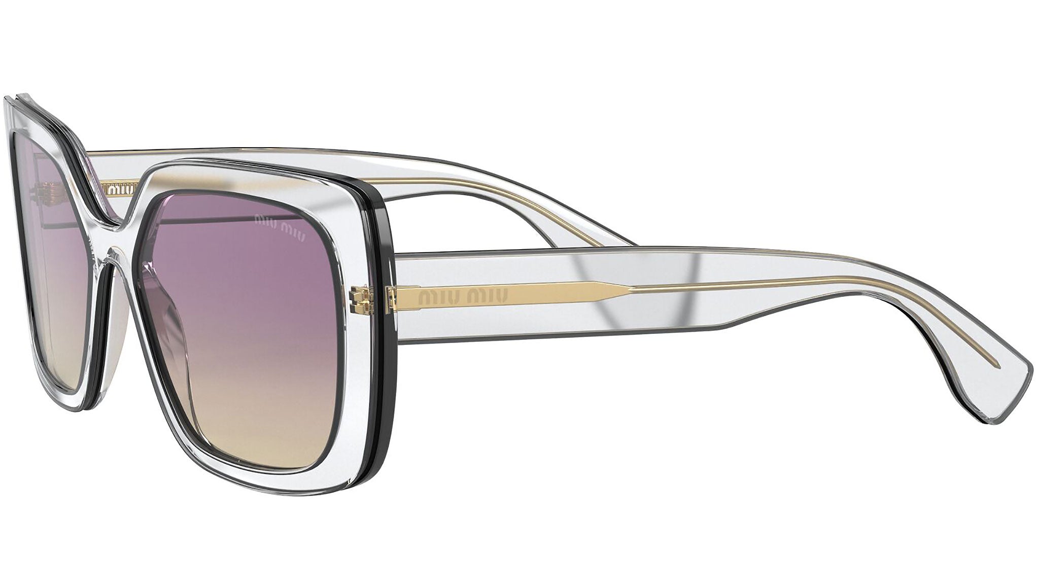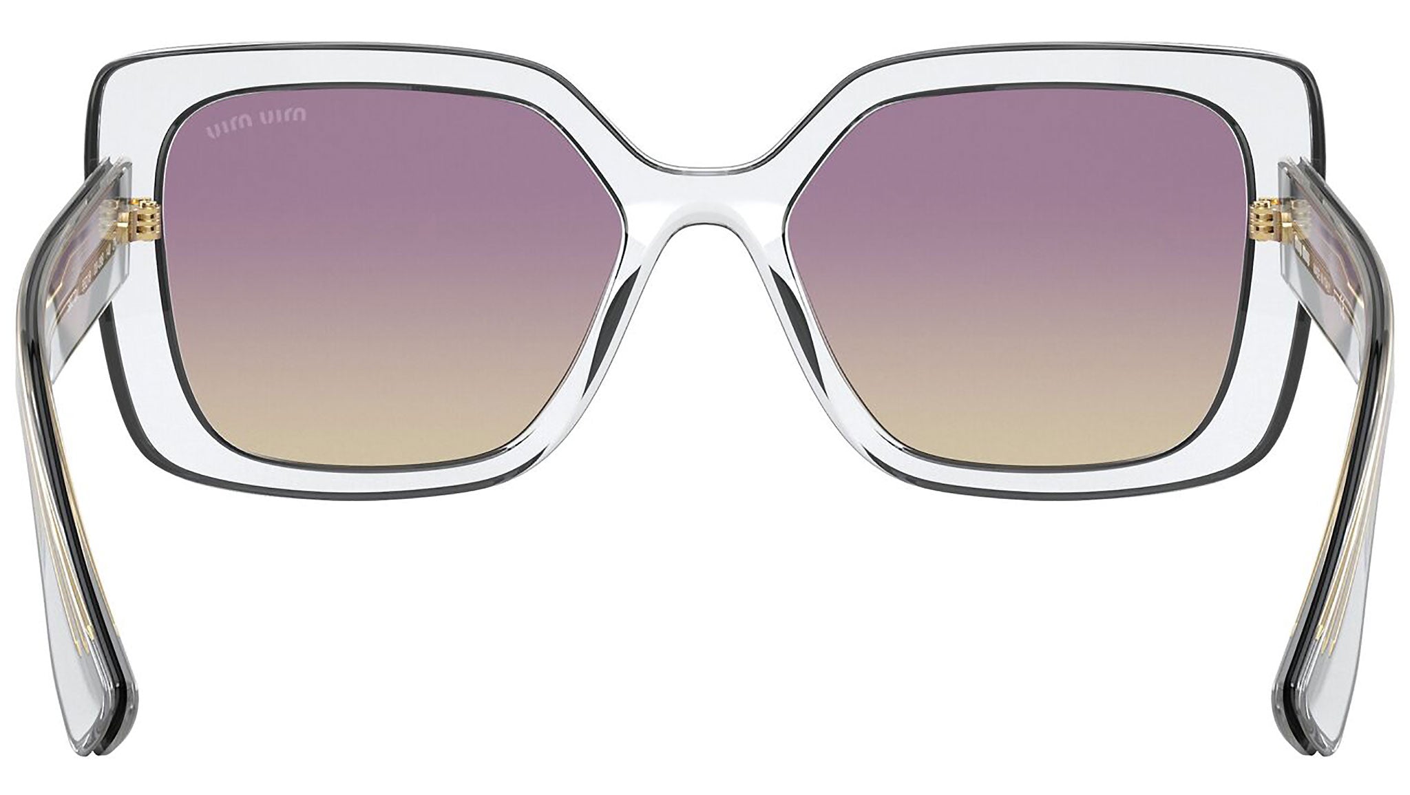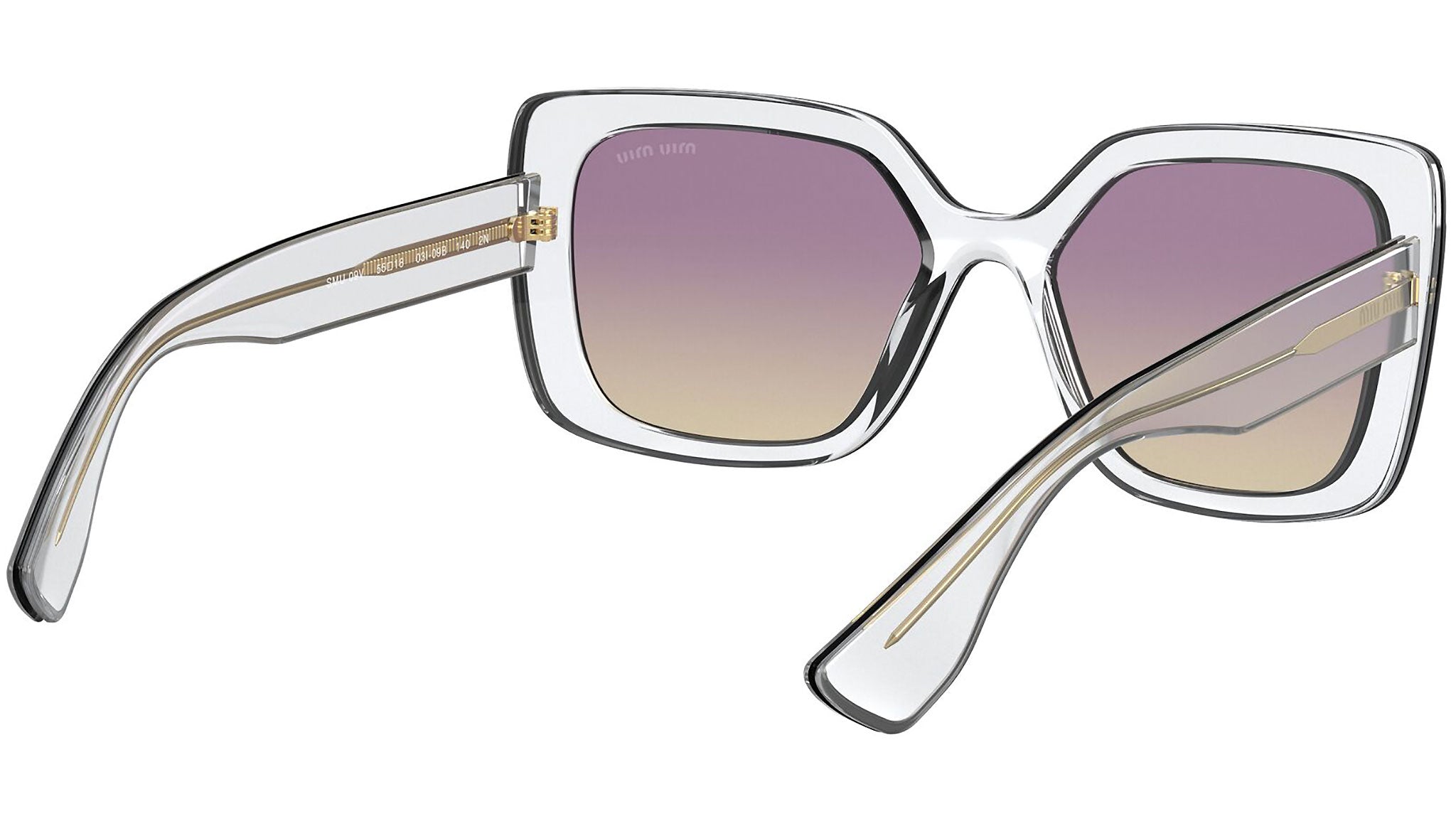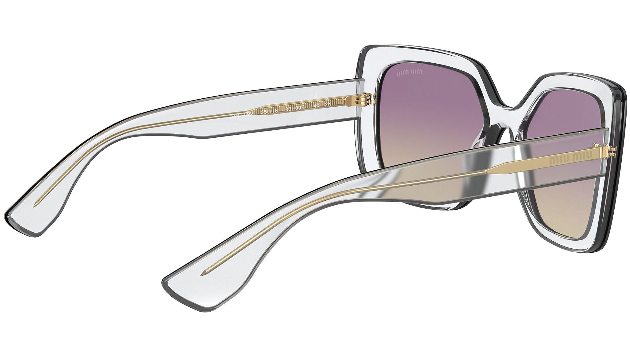 Occhiali da sole Miu Miu modello MU 09VS variante colore 03I09B trasparente, con lenti color giallo sfumato viola. Miu Miu offre creazioni uniche, in cui la costante ricerca stilistica si combina perfettamente con la maestria artigianale della lavorazione. Le silhouette femminili e sinuose delle montature sono espressione di una ricchezza dei dettagli che rispecchia pienamente i codici stilistici e l’indiscusso talento del brand nell’unire il design non convenzionale ad un romanticismo dai rimandi retrò.