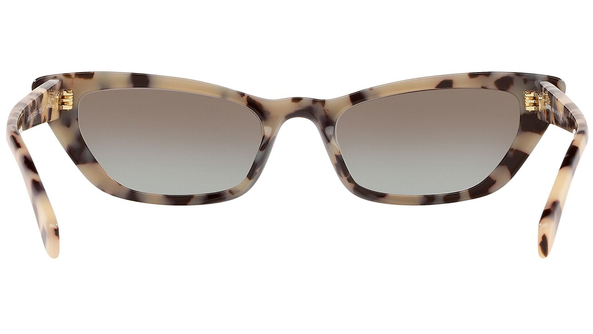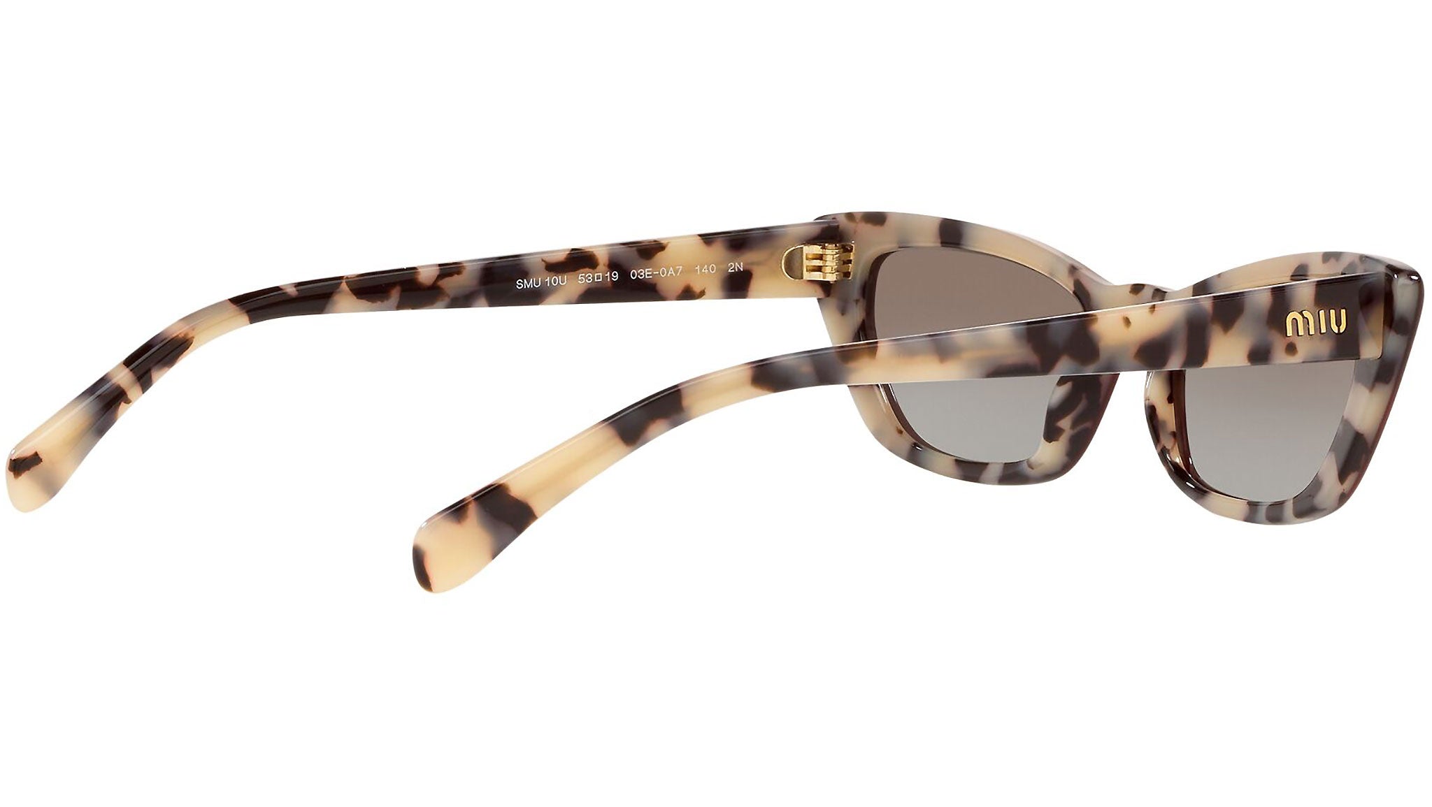 Occhiali da sole Miu Miu modello MU 10US variante colore 03E0A7 avana beige con top bordeaux, con lenti color grigio sfumato. Miu Miu offre creazioni uniche, in cui la costante ricerca stilistica si combina perfettamente con la maestria artigianale della lavorazione. Le silhouette femminili e sinuose delle montature sono espressione di una ricchezza dei dettagli che rispecchia pienamente i codici stilistici e l’indiscusso talento del brand nell’unire il design non convenzionale ad un romanticismo dai rimandi retrò.