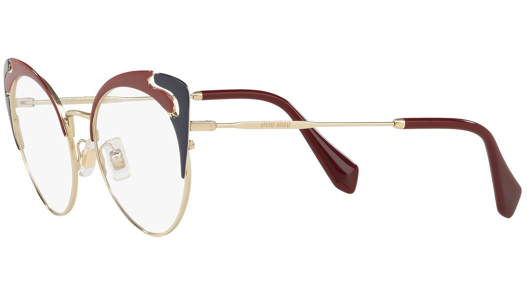 Occhiali da vista Miu Miu modello MU 50RV variante colore HB51O1 oro chiaro e blu granata. Miu Miu offre creazioni uniche, in cui la costante ricerca stilistica si combina perfettamente con la maestria artigianale della lavorazione. Le silhouette femminili e sinuose delle montature sono espressione di una ricchezza dei dettagli che rispecchia pienamente i codici stilistici e l’indiscusso talento del brand nell’unire il design non convenzionale ad un romanticismo dai rimandi retrò.