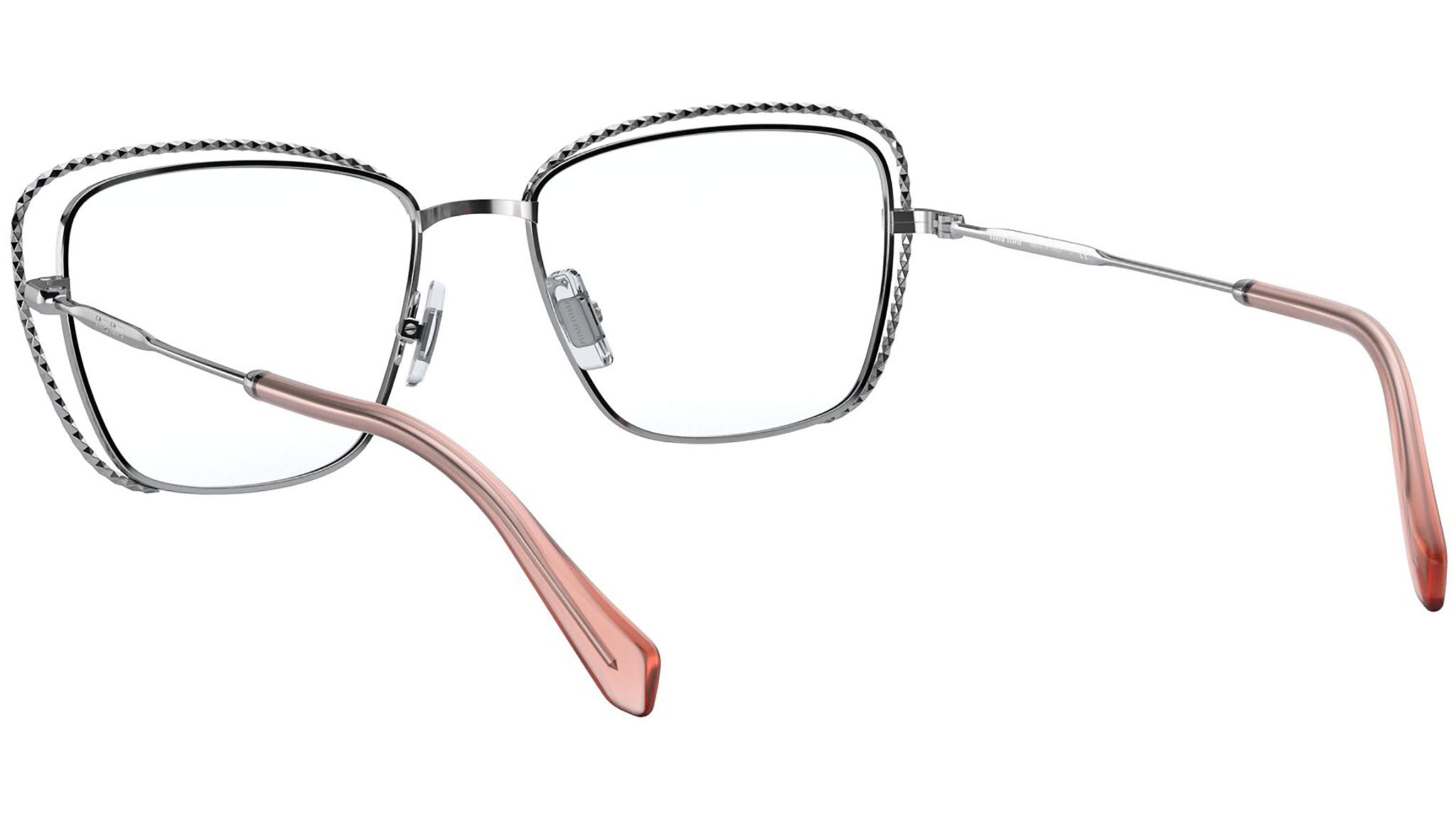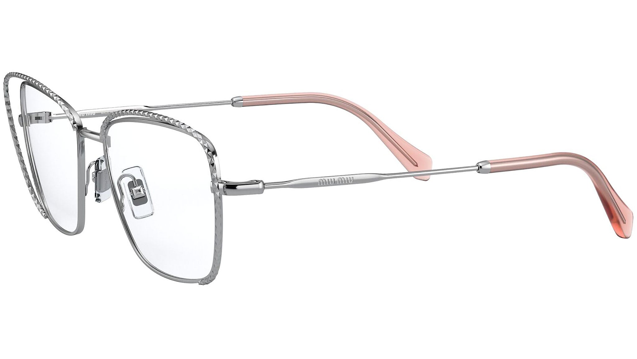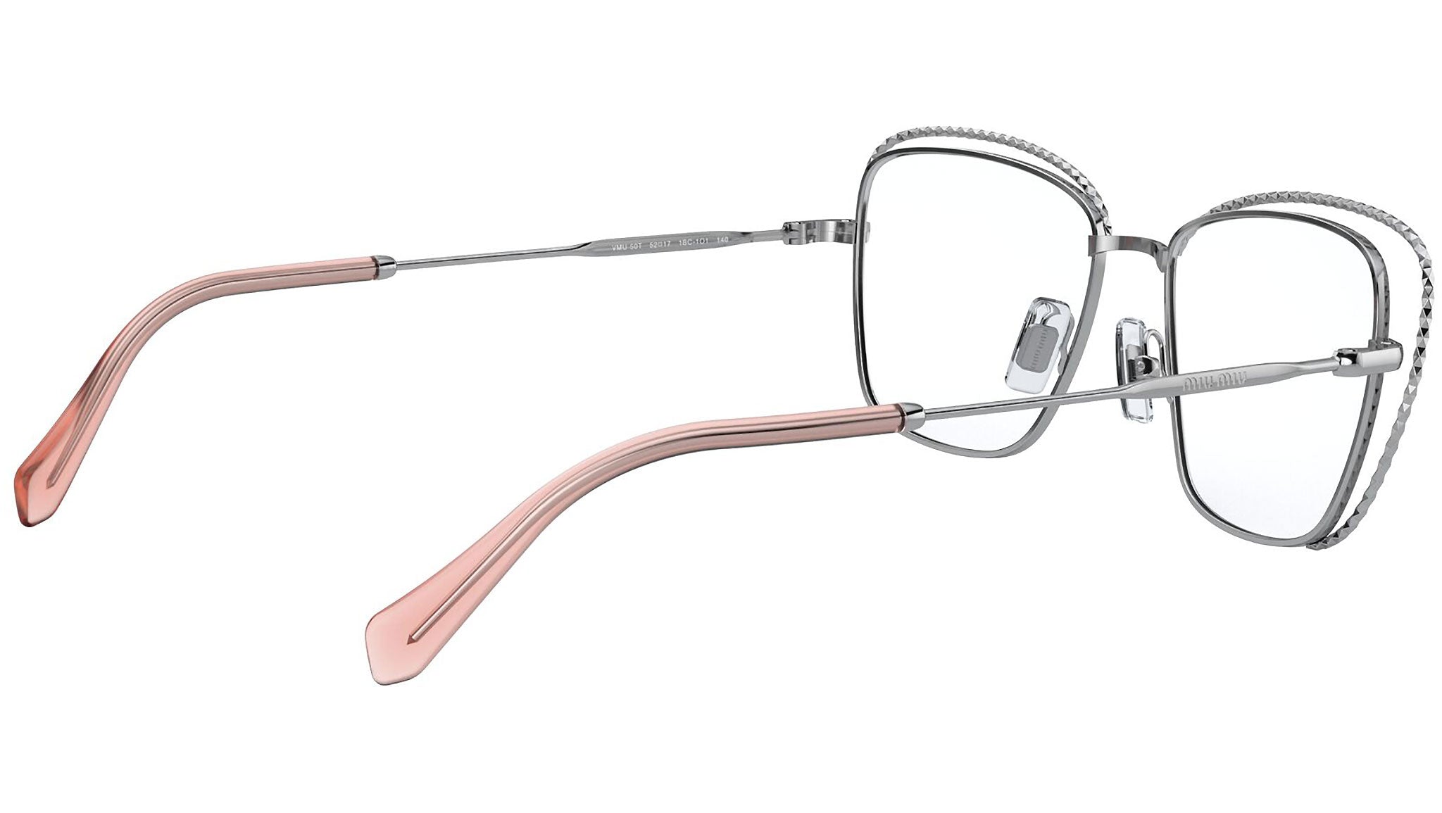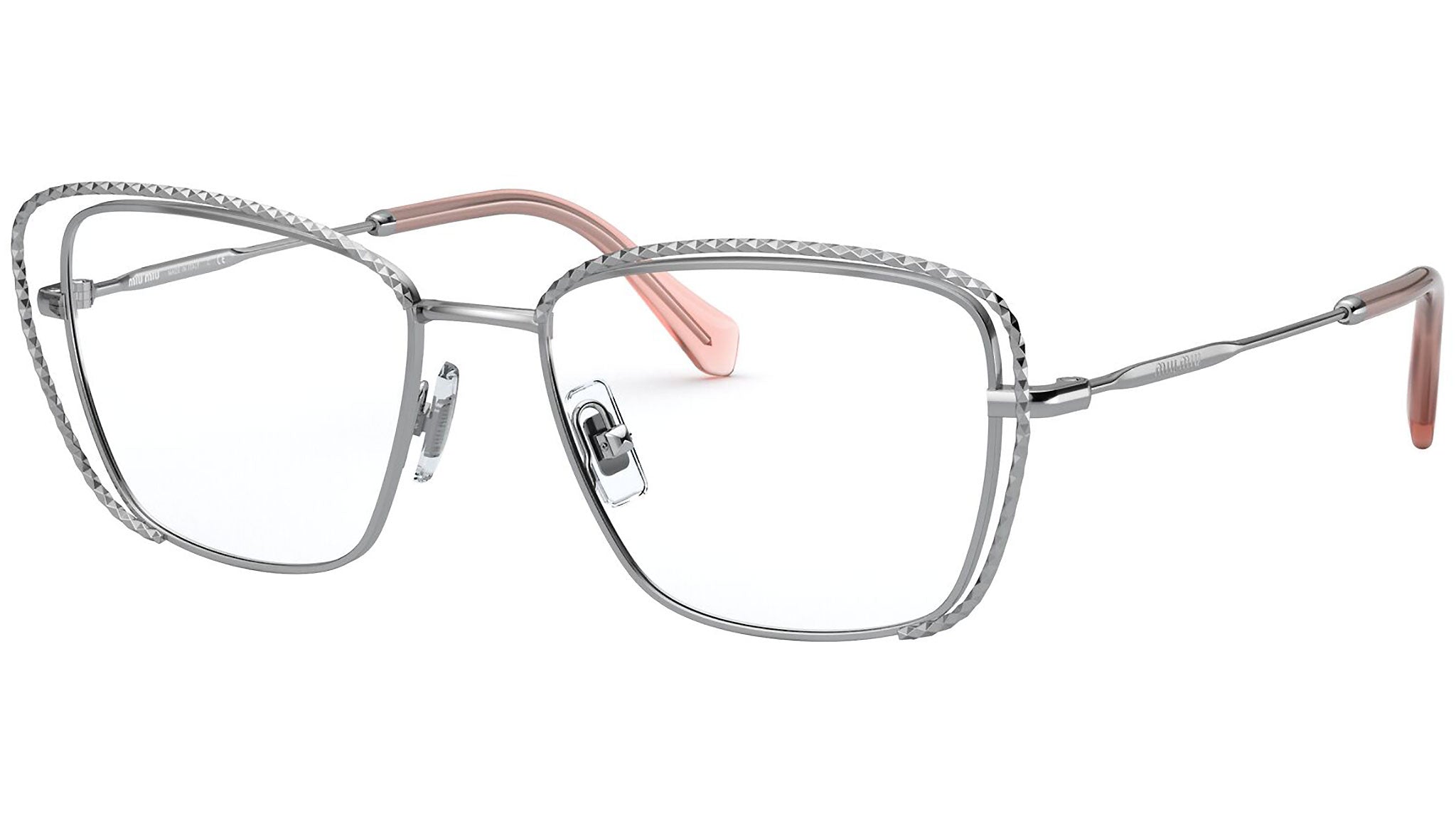 Occhiali da vista Miu Miu modello MU 50TV variante colore 1BC1O1 argento. Miu Miu offre creazioni uniche, in cui la costante ricerca stilistica si combina perfettamente con la maestria artigianale della lavorazione. Le silhouette femminili e sinuose delle montature sono espressione di una ricchezza dei dettagli che rispecchia pienamente i codici stilistici e l’indiscusso talento del brand nell’unire il design non convenzionale ad un romanticismo dai rimandi retrò.