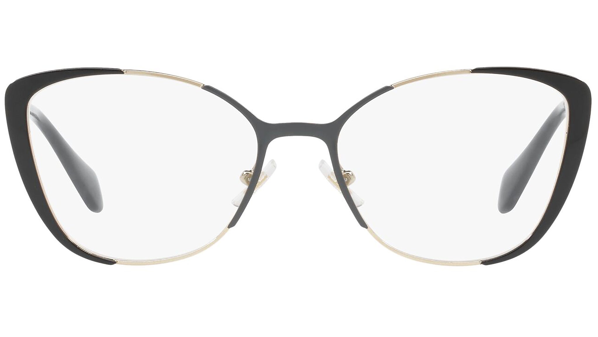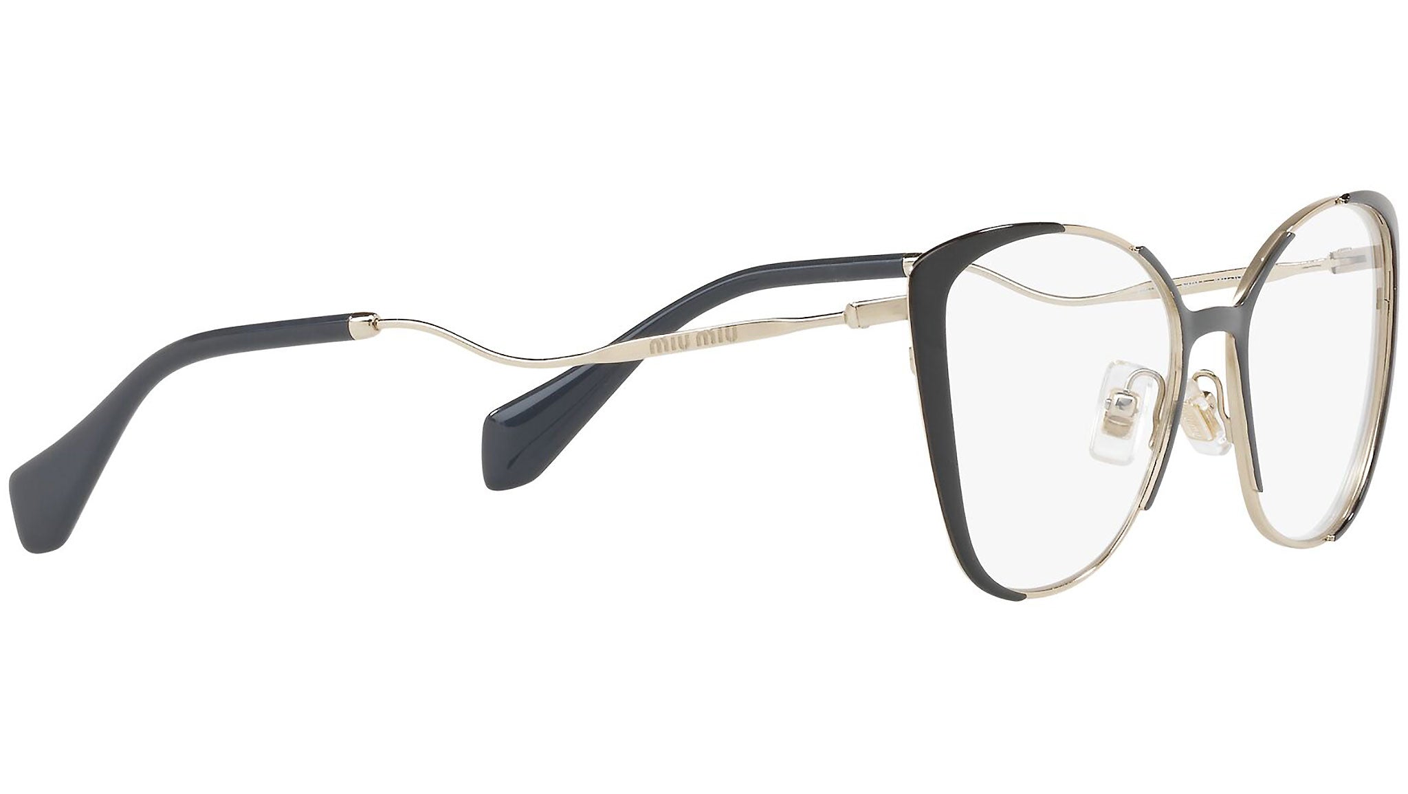Occhiali da vista Miu Miu modello MU 51QV variante colore VYD1O1 oro chiaro grigio e nero. Miu Miu offre creazioni uniche, in cui la costante ricerca stilistica si combina perfettamente con la maestria artigianale della lavorazione. Le silhouette femminili e sinuose delle montature sono espressione di una ricchezza dei dettagli che rispecchia pienamente i codici stilistici e l’indiscusso talento del brand nell’unire il design non convenzionale ad un romanticismo dai rimandi retrò.