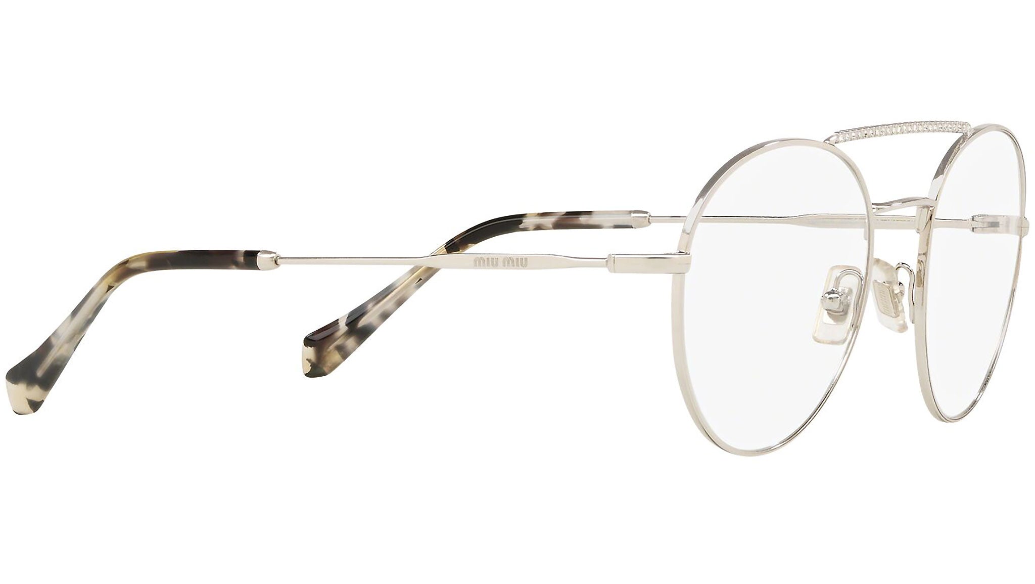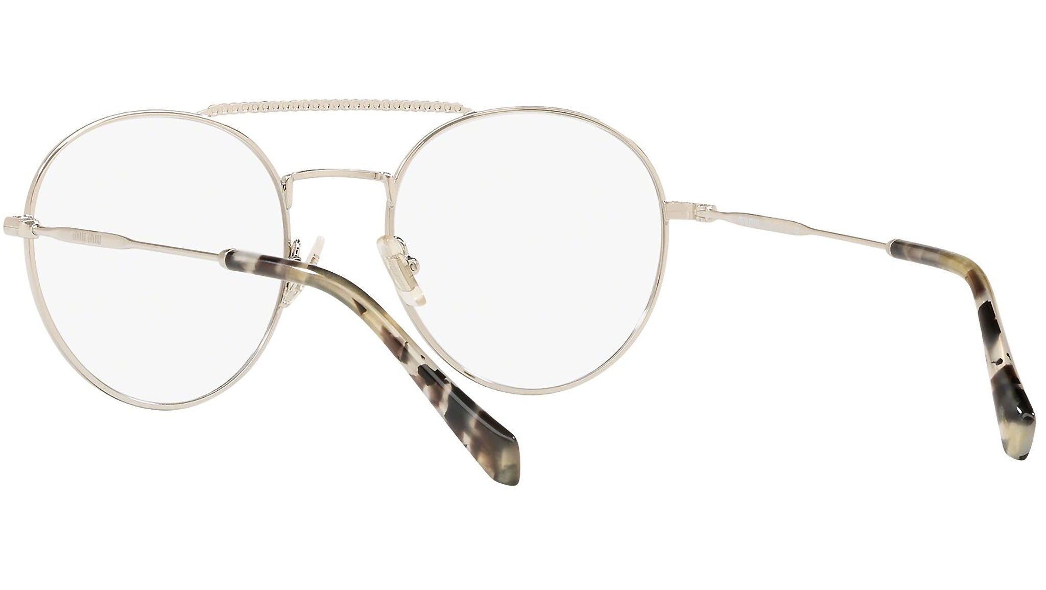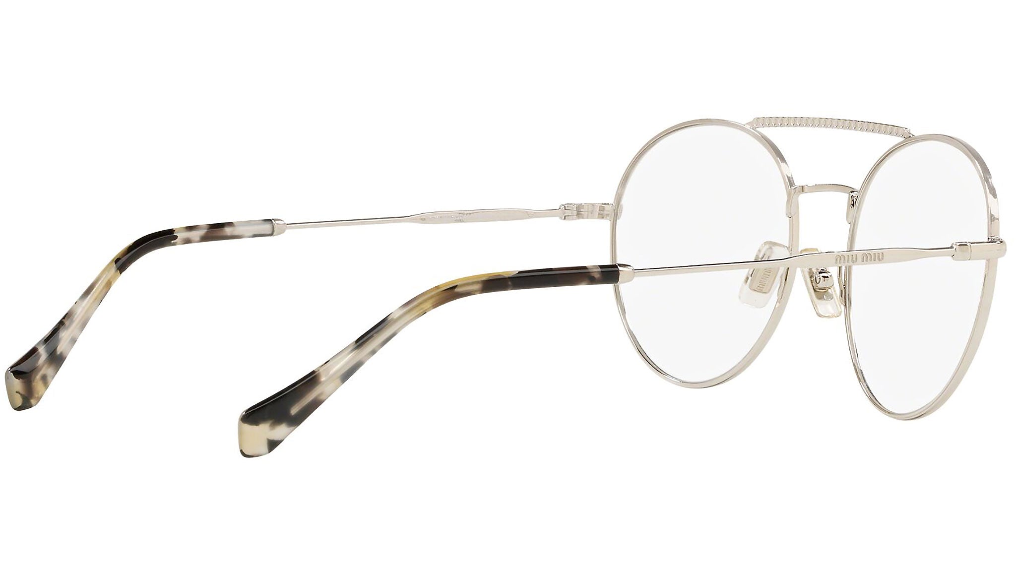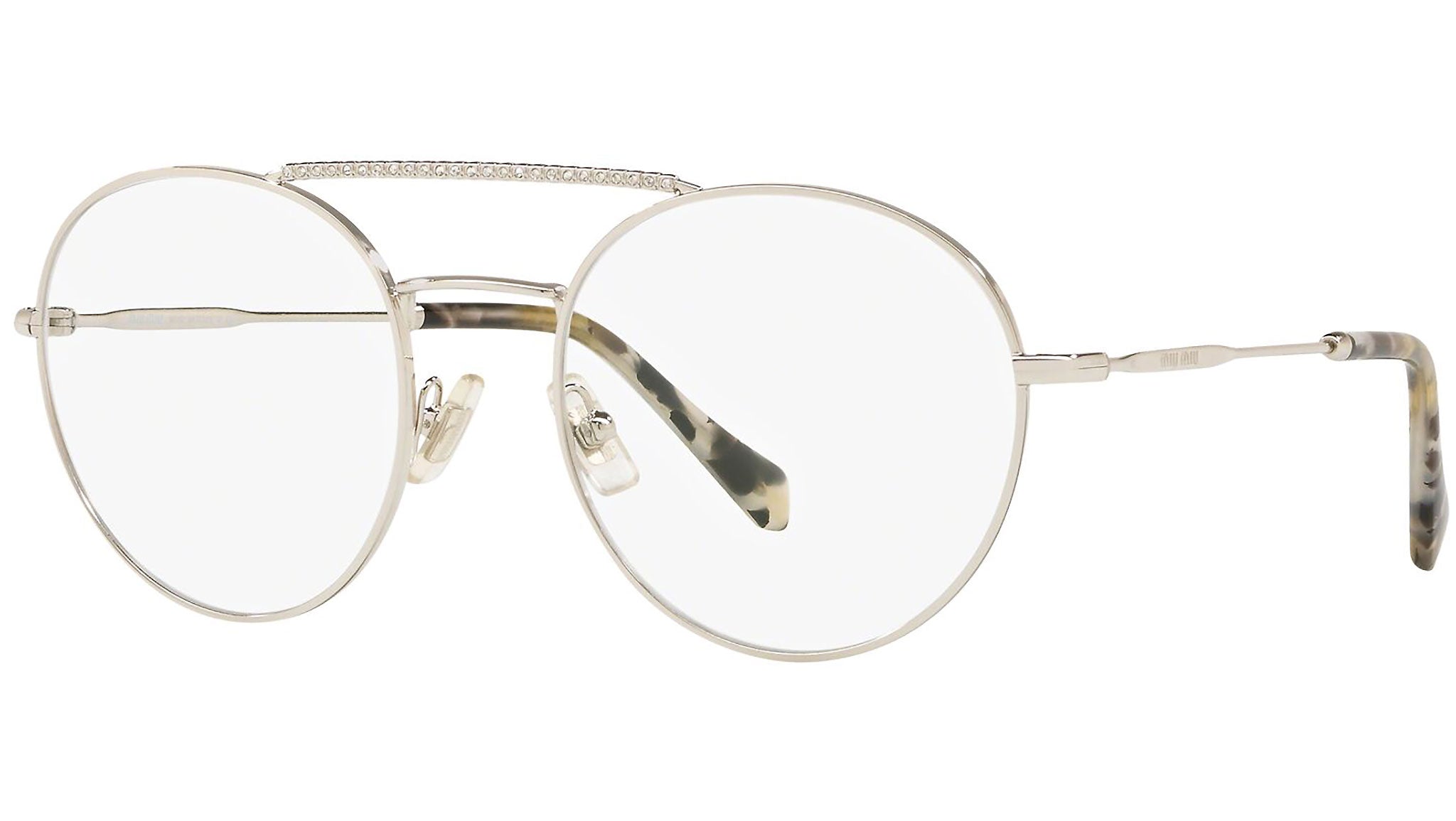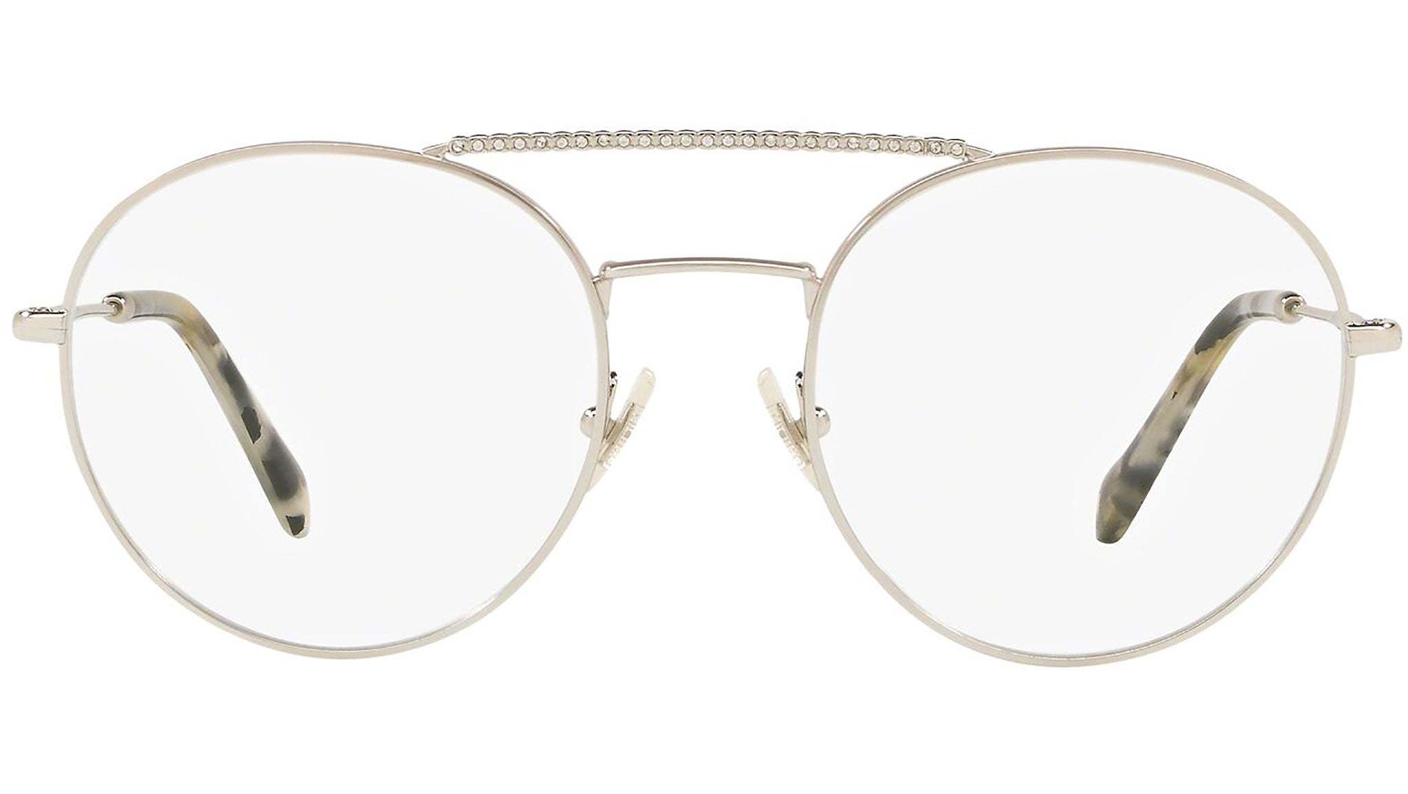 Occhiali da vista Miu Miu modello MU 51RV variante colore 1BC1O1 argento. Miu Miu offre creazioni uniche, in cui la costante ricerca stilistica si combina perfettamente con la maestria artigianale della lavorazione. Le silhouette femminili e sinuose delle montature sono espressione di una ricchezza dei dettagli che rispecchia pienamente i codici stilistici e l’indiscusso talento del brand nell’unire il design non convenzionale ad un romanticismo dai rimandi retrò.