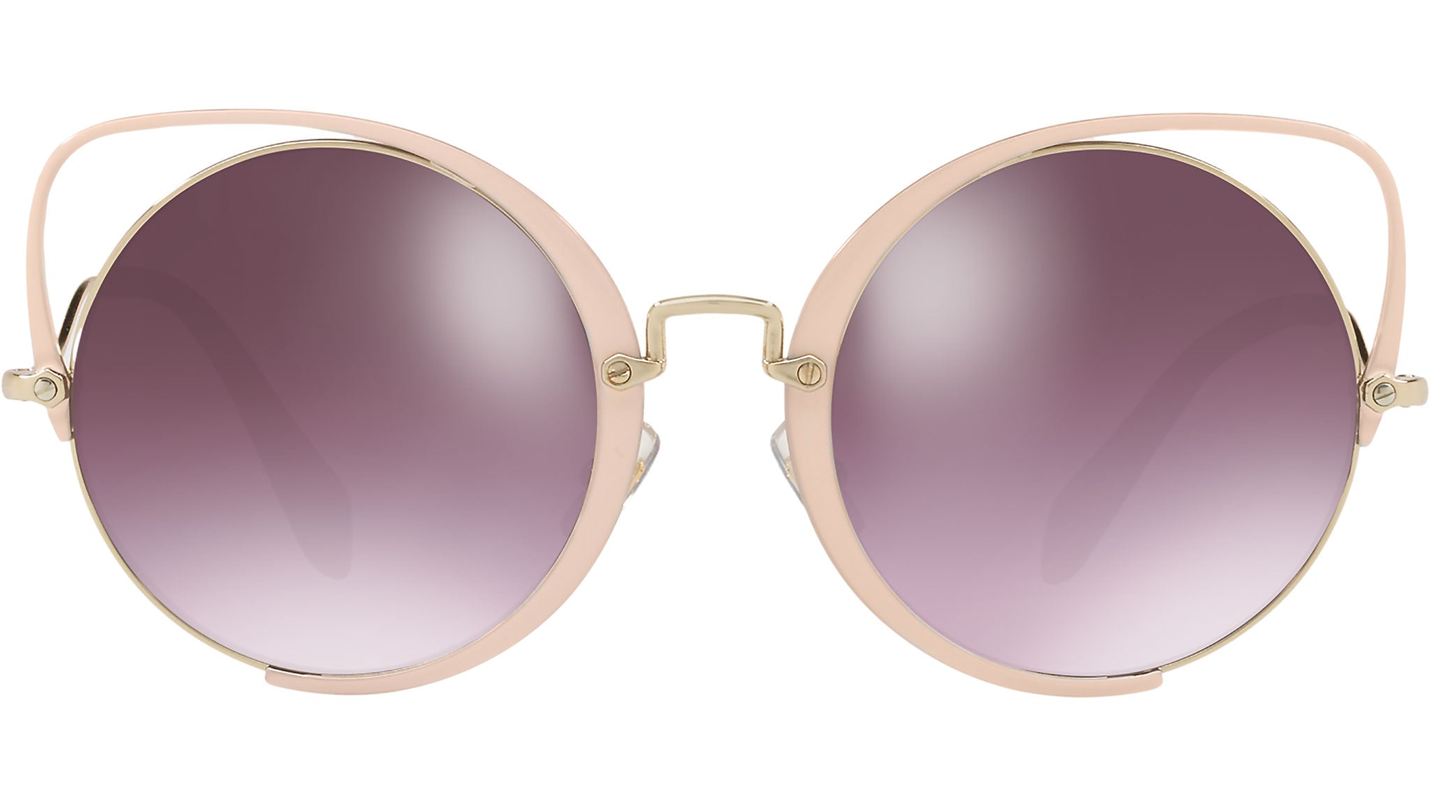 Occhiali da sole Miu Miu modello MU 70US variante colore 4UD085 pesca glitter, con lenti color viola sfumato argento a specchio. Miu Miu offre creazioni uniche, in cui la costante ricerca stilistica si combina perfettamente con la maestria artigianale della lavorazione. Le silhouette femminili e sinuose delle montature sono espressione di una ricchezza dei dettagli che rispecchia pienamente i codici stilistici e l’indiscusso talento del brand nell’unire il design non convenzionale ad un romanticismo dai rimandi retrò.