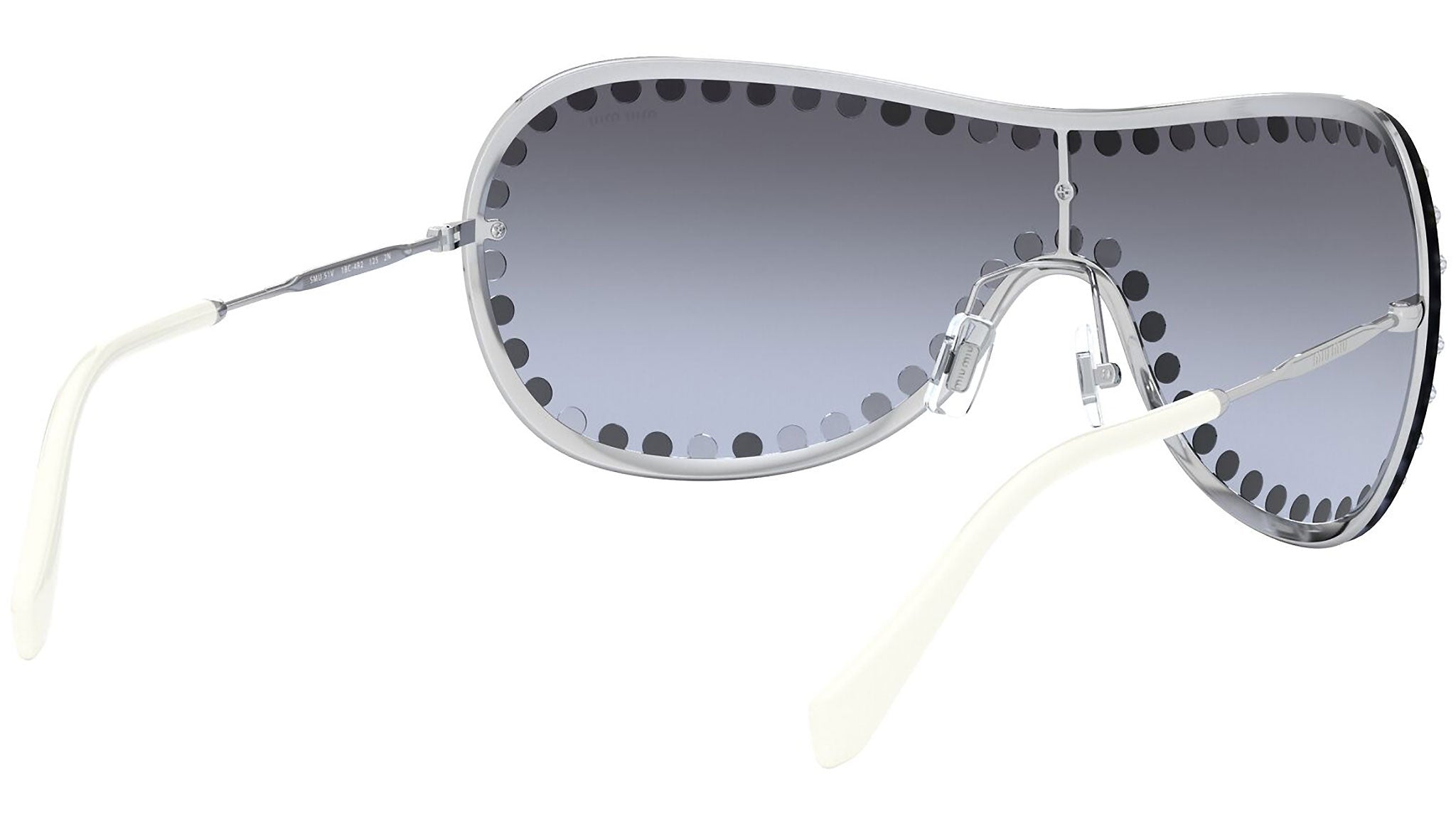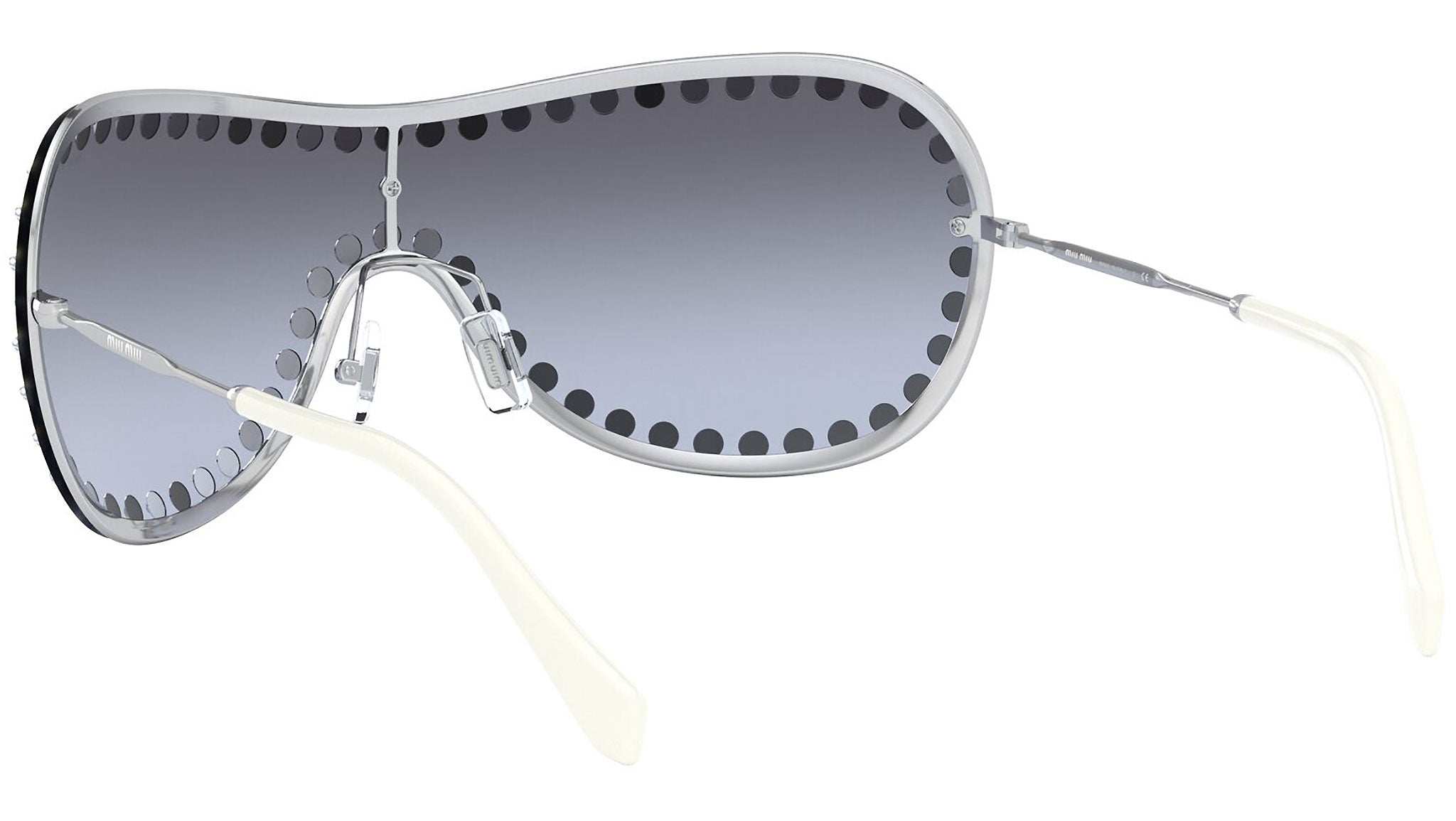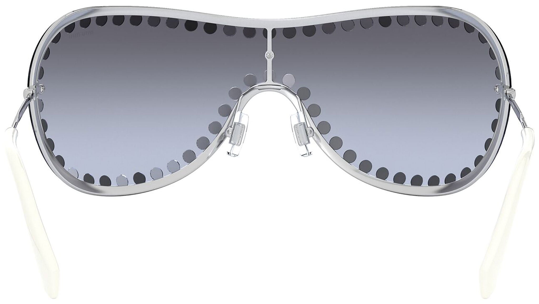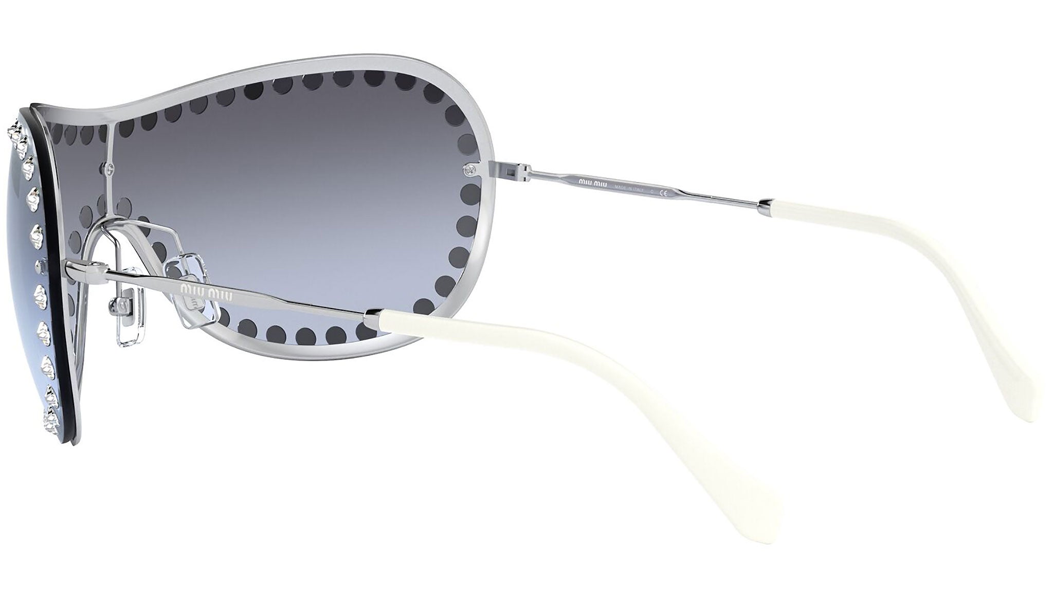 Occhiali da sole Miu Miu modello MU 51VS variante colore 1BC4R2 argento, con lenti color blu gradiente. Miu Miu offre creazioni uniche, in cui la costante ricerca stilistica si combina perfettamente con la maestria artigianale della lavorazione. Le silhouette femminili e sinuose delle montature sono espressione di una ricchezza dei dettagli che rispecchia pienamente i codici stilistici e l’indiscusso talento del brand nell’unire il design non convenzionale ad un romanticismo dai rimandi retrò.