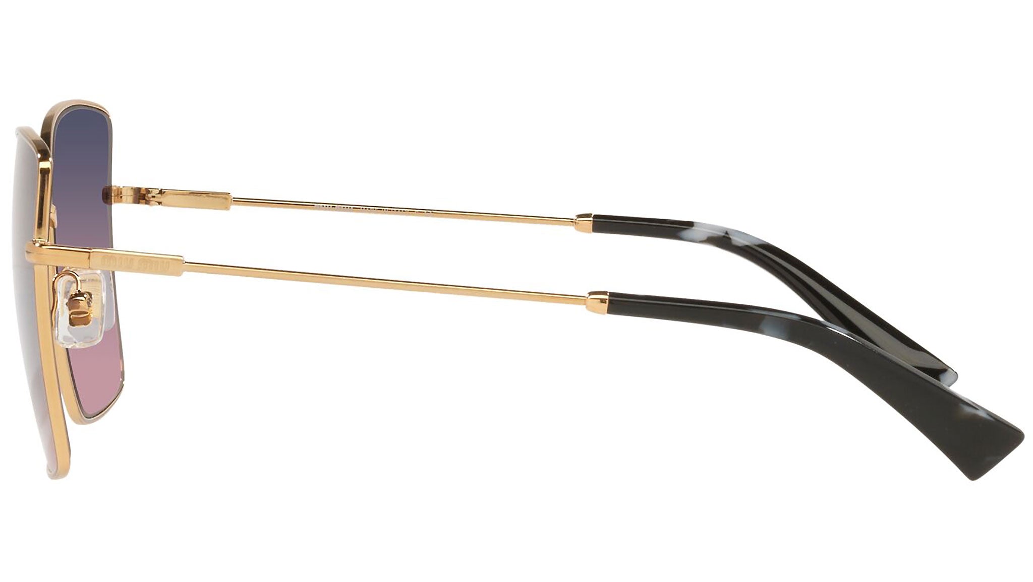 Occhiali da sole Miu Miu modello MU 51WS variante colore 7OE06N oro anticato, con lenti color rosa sfumato blu. Miu Miu offre creazioni uniche, in cui la costante ricerca stilistica si combina perfettamente con la maestria artigianale della lavorazione. Le silhouette femminili e sinuose delle montature sono espressione di una ricchezza dei dettagli che rispecchia pienamente i codici stilistici e l’indiscusso talento del brand nell’unire il design non convenzionale ad un romanticismo dai rimandi retrò.
