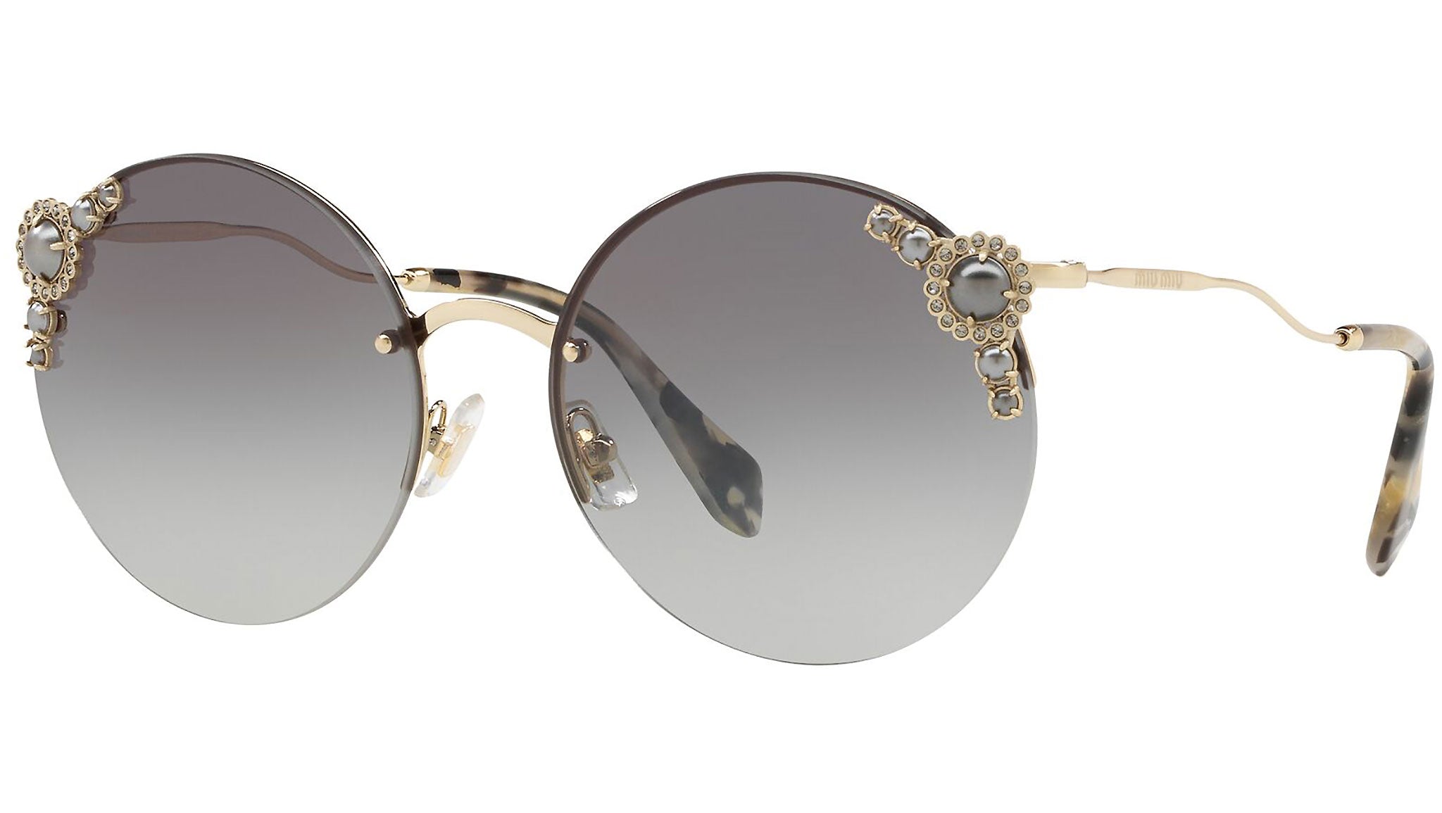 Occhiali da sole Miu Miu modello MU 52TS variante colore WO43M1 oro chiaro, con lenti color grigio sfumato. Miu Miu offre creazioni uniche, in cui la costante ricerca stilistica si combina perfettamente con la maestria artigianale della lavorazione. Le silhouette femminili e sinuose delle montature sono espressione di una ricchezza dei dettagli che rispecchia pienamente i codici stilistici e l’indiscusso talento del brand nell’unire il design non convenzionale ad un romanticismo dai rimandi retrò.