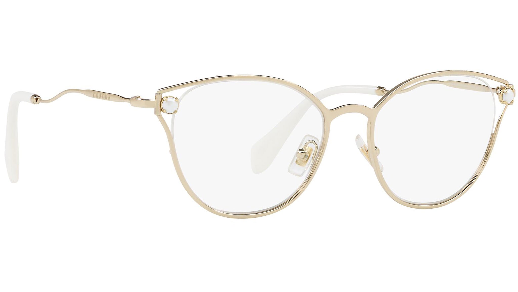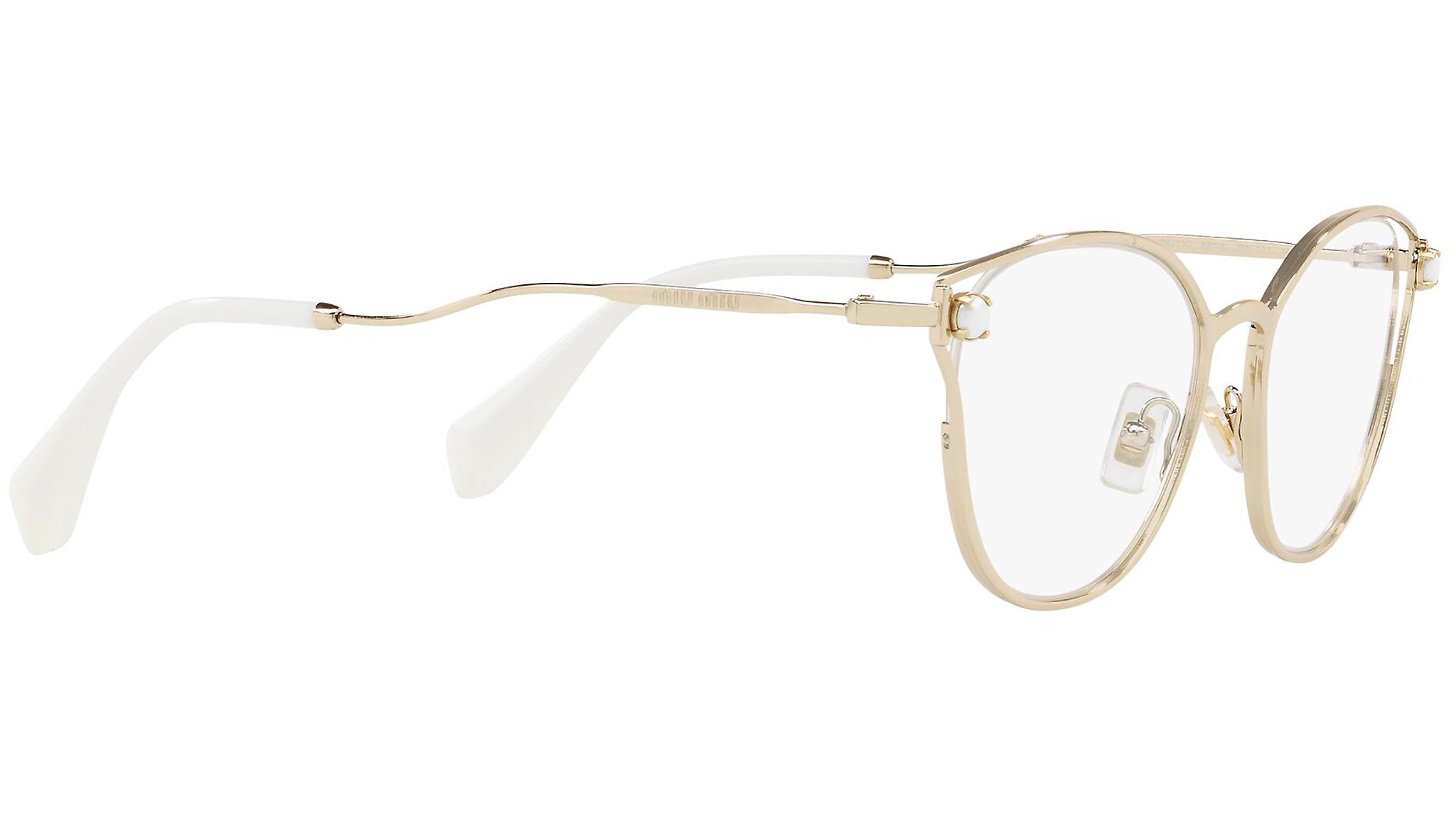 Occhiali da vista Miu Miu modello MU 53QV variante colore ZVN1O1 oro chiaro. Miu Miu offre creazioni uniche, in cui la costante ricerca stilistica si combina perfettamente con la maestria artigianale della lavorazione. Le silhouette femminili e sinuose delle montature sono espressione di una ricchezza dei dettagli che rispecchia pienamente i codici stilistici e l’indiscusso talento del brand nell’unire il design non convenzionale ad un romanticismo dai rimandi retrò.