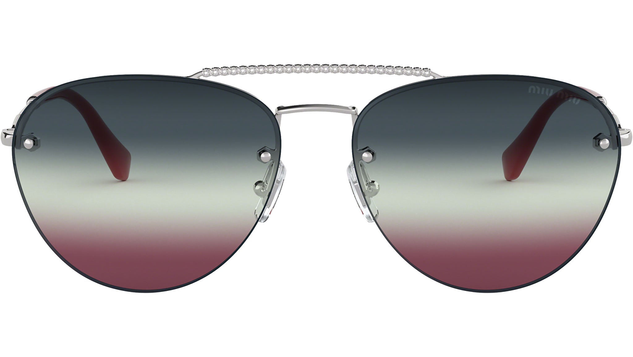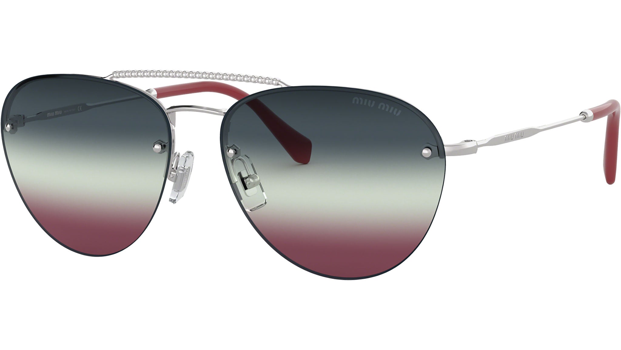Occhiali da sole Miu Miu modello MU 54US codice colore 1BC165 con montatura color argento in metallo e lenti color verde blu sfumato viola. Miu Miu offre creazioni uniche, in cui la costante ricerca stilistica si combina perfettamente con la maestria artigianale della lavorazione. Le silhouette femminili e sinuose delle montature sono espressione di una ricchezza dei dettagli che rispecchia pienamente i codici stilistici e l’indiscusso talento del brand nell’unire il design non convenzionale ad un romanticismo dai rimandi retrò.