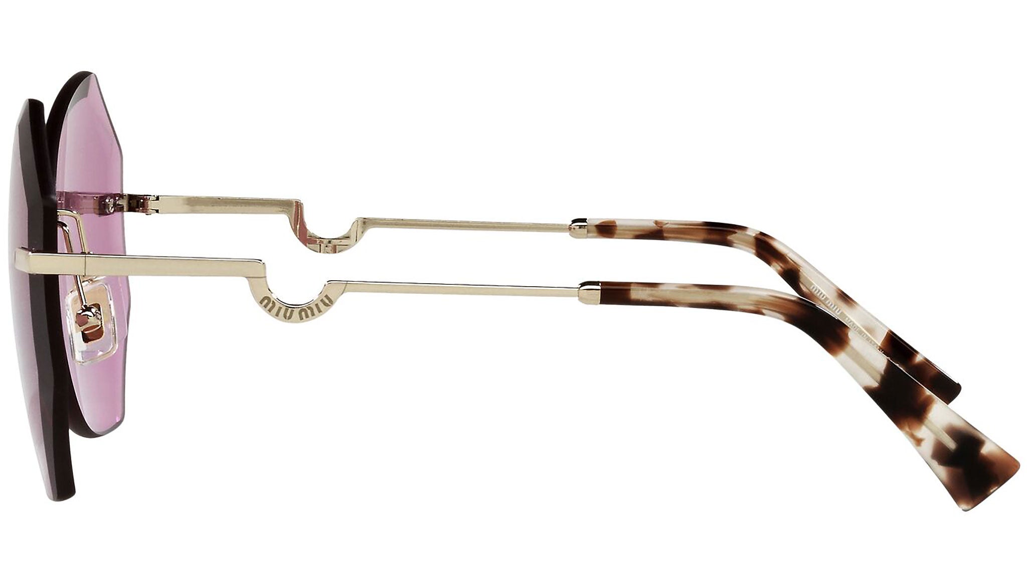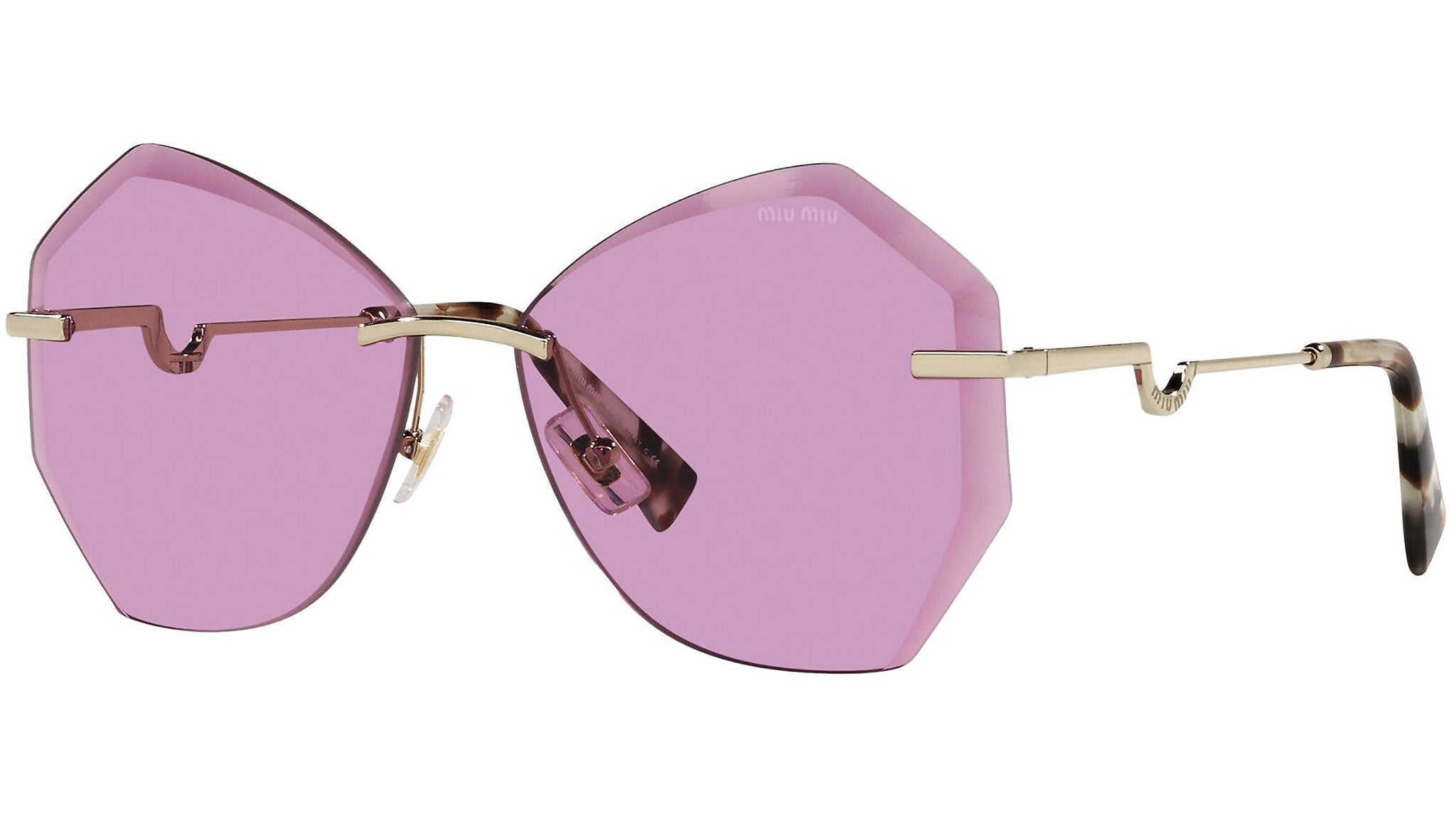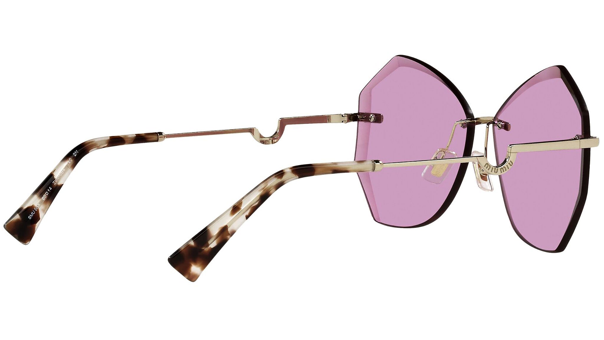 Occhiali da sole Miu Miu modello MU 55XS variante colore ZVN0B4 oro chiaro, con lenti color viola scuro. Miu Miu offre creazioni uniche, in cui la costante ricerca stilistica si combina perfettamente con la maestria artigianale della lavorazione. Le silhouette femminili e sinuose delle montature sono espressione di una ricchezza dei dettagli che rispecchia pienamente i codici stilistici e l’indiscusso talento del brand nell’unire il design non convenzionale ad un romanticismo dai rimandi retrò.