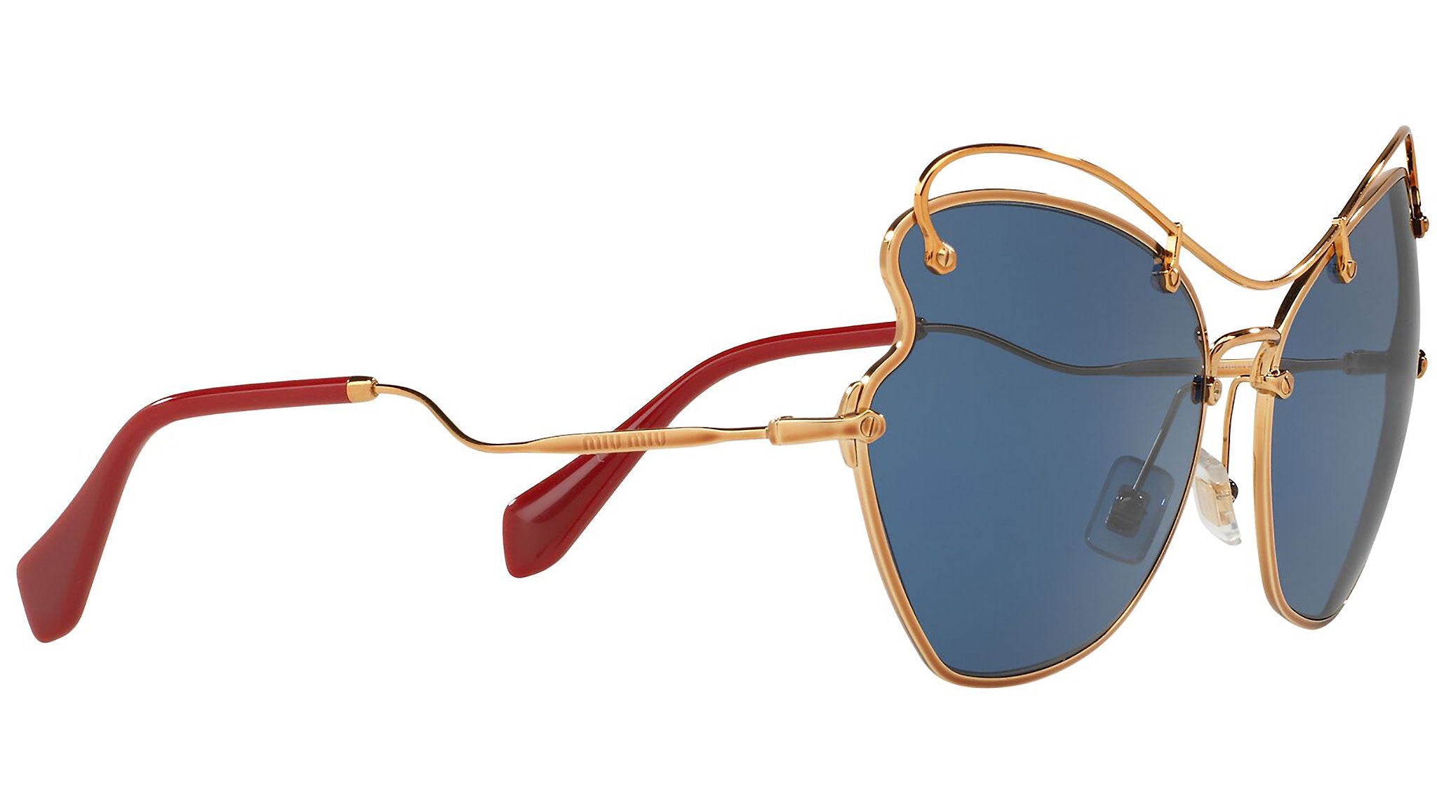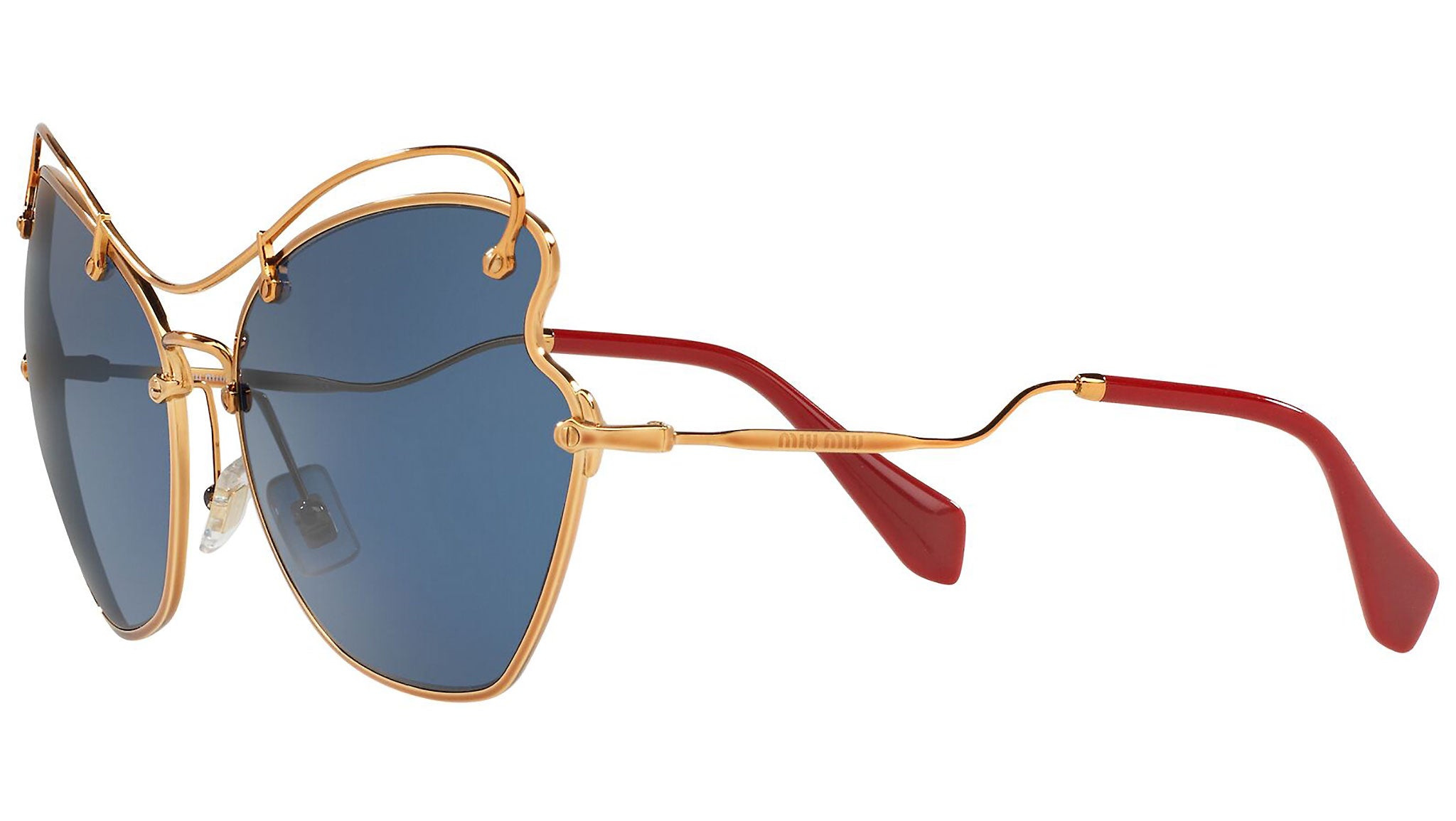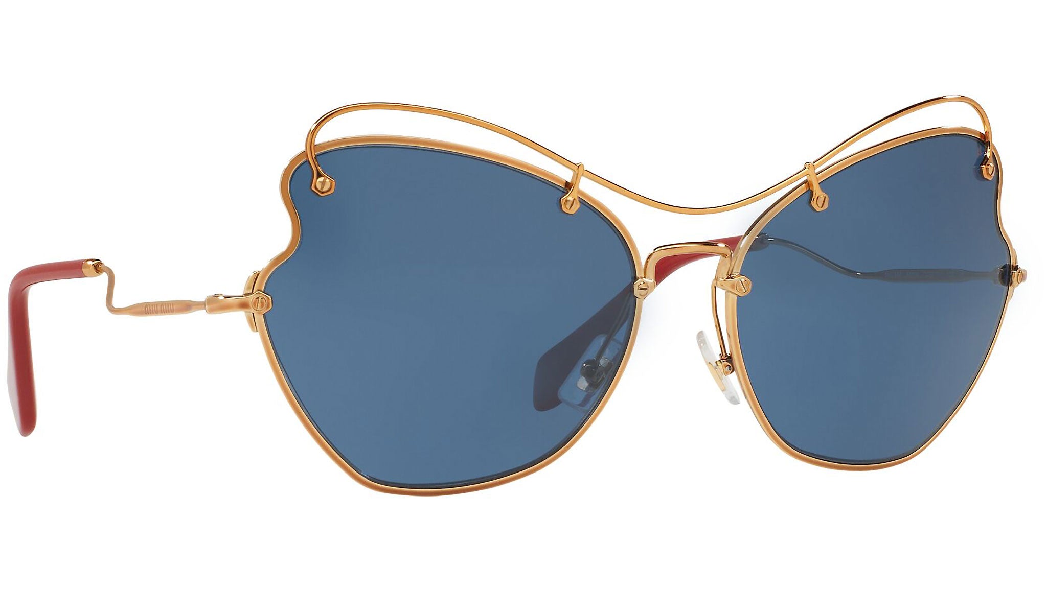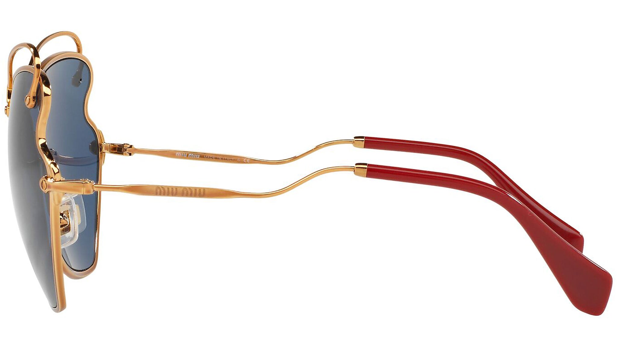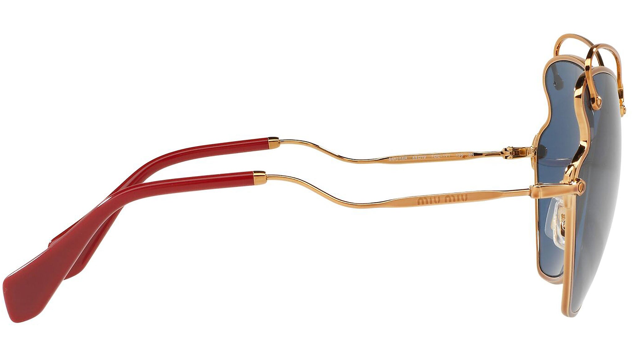 Occhiali da sole Miu Miu modello MU 56RS variante colore 7OE1V1 oro anticato, con lenti color blu. Miu Miu offre creazioni uniche, in cui la costante ricerca stilistica si combina perfettamente con la maestria artigianale della lavorazione. Le silhouette femminili e sinuose delle montature sono espressione di una ricchezza dei dettagli che rispecchia pienamente i codici stilistici e l’indiscusso talento del brand nell’unire il design non convenzionale ad un romanticismo dai rimandi retrò.
