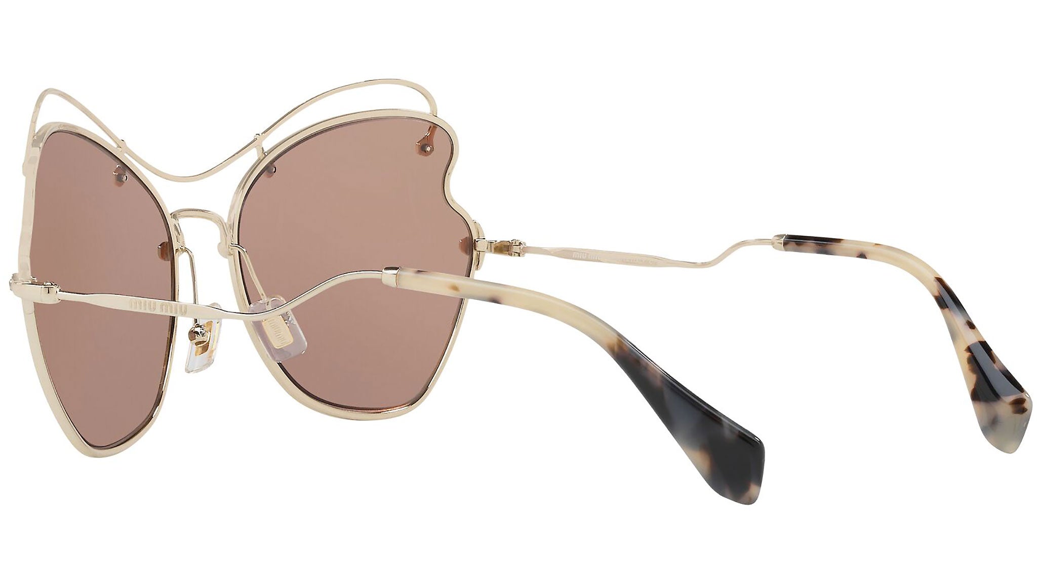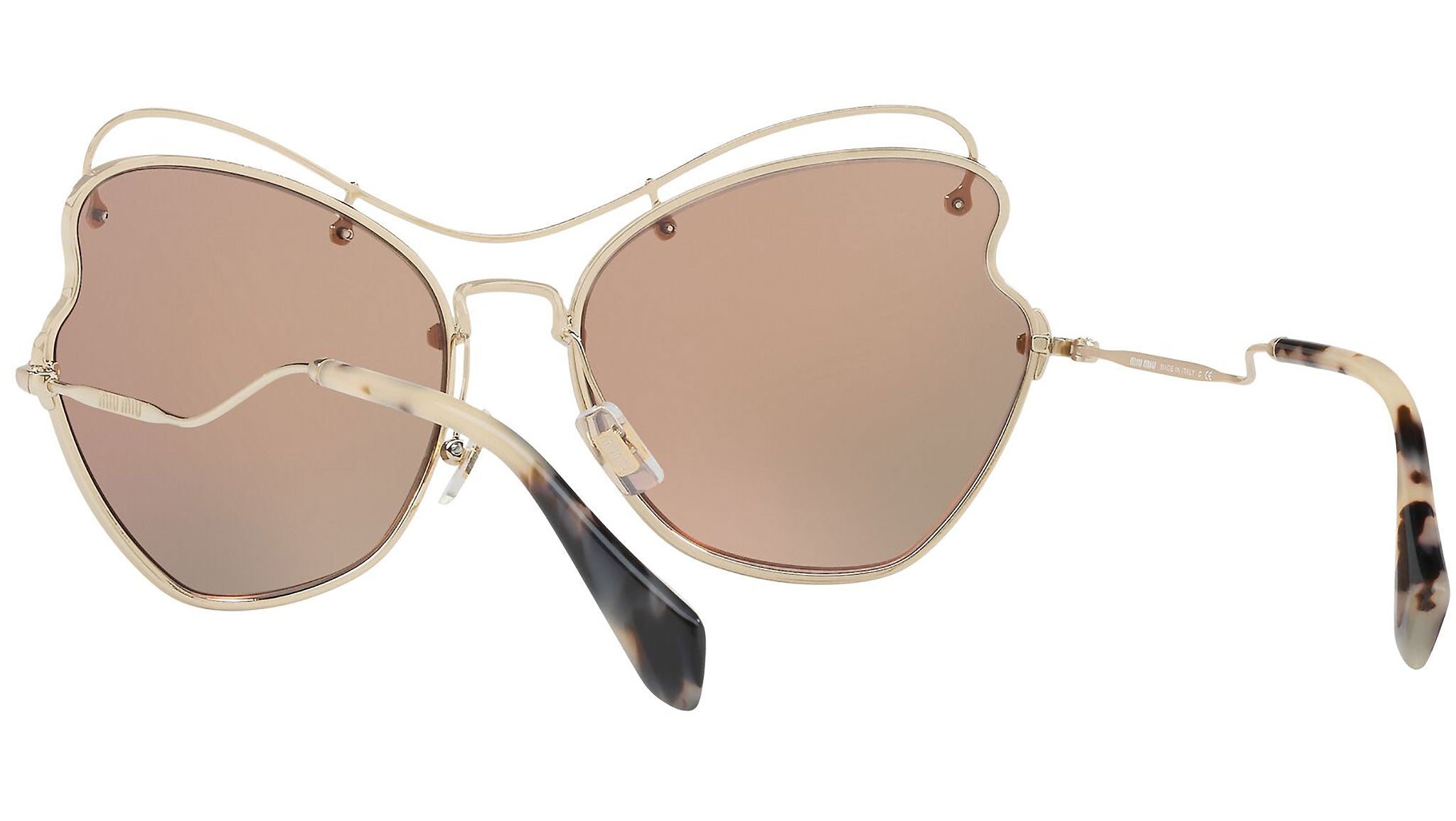 Occhiali da sole Miu Miu modello MU 56RS variante colore ZVN6S0 oro chiaro, con lenti color marrone a specchio oro rosa. Miu Miu offre creazioni uniche, in cui la costante ricerca stilistica si combina perfettamente con la maestria artigianale della lavorazione. Le silhouette femminili e sinuose delle montature sono espressione di una ricchezza dei dettagli che rispecchia pienamente i codici stilistici e l’indiscusso talento del brand nell’unire il design non convenzionale ad un romanticismo dai rimandi retrò.