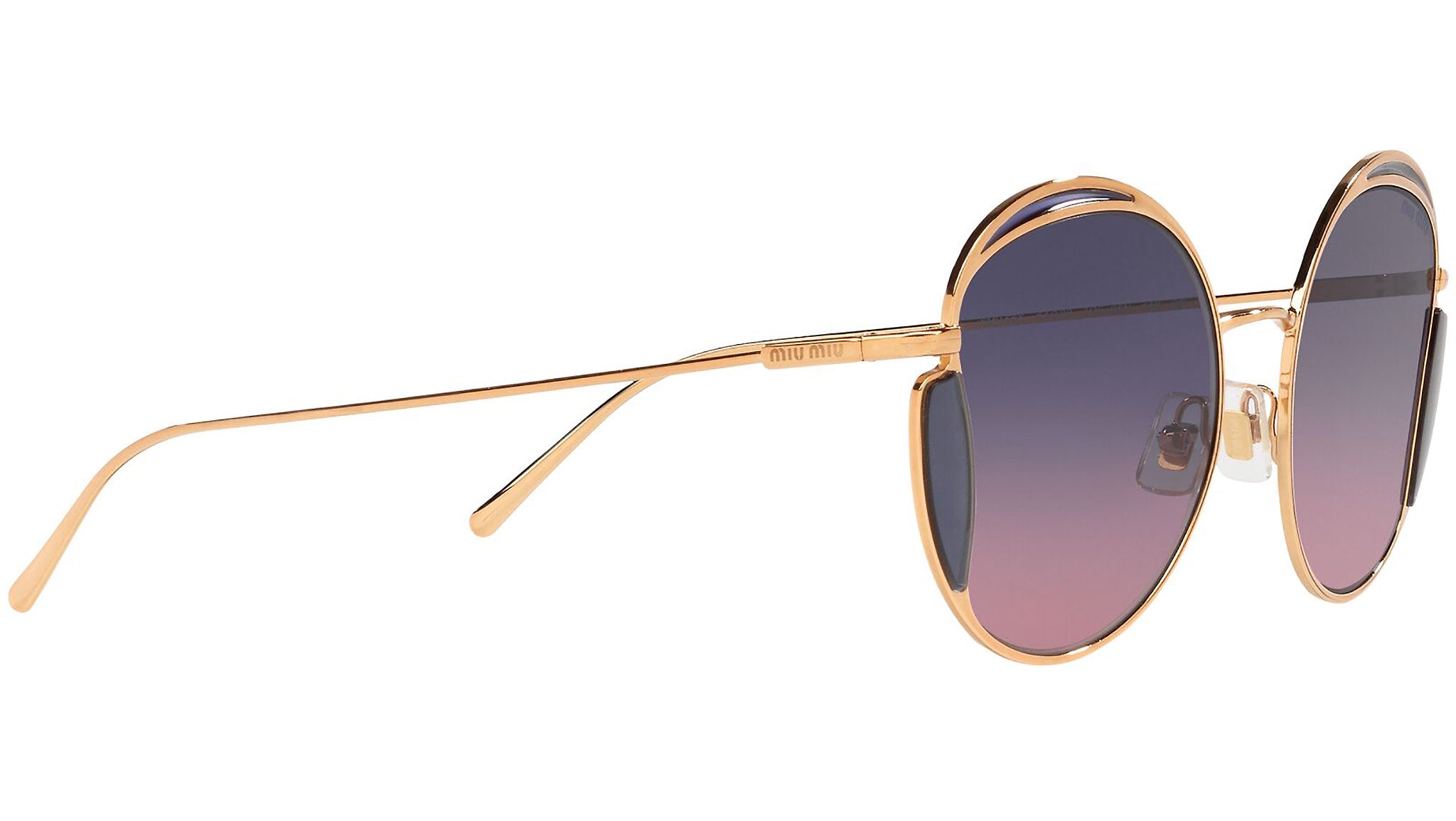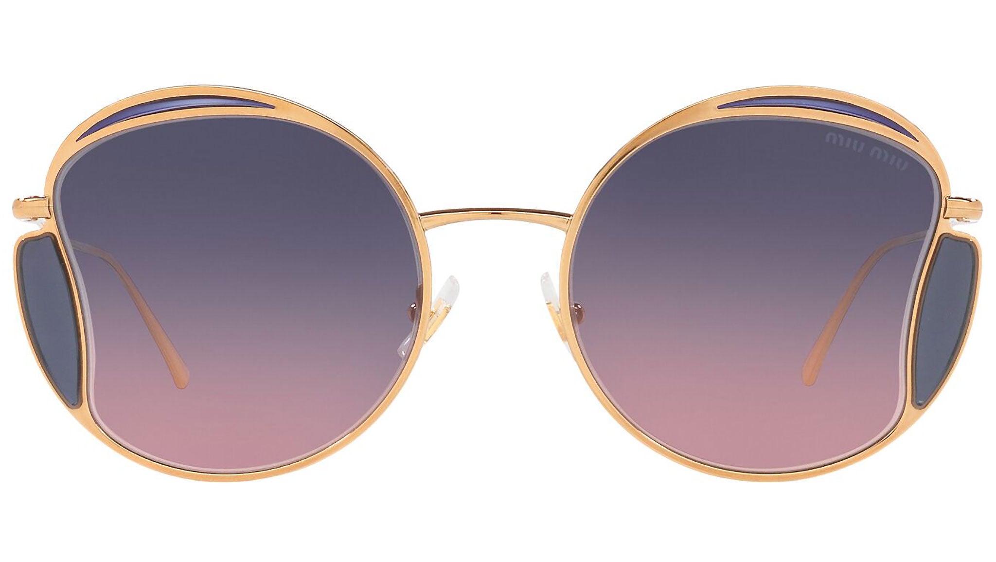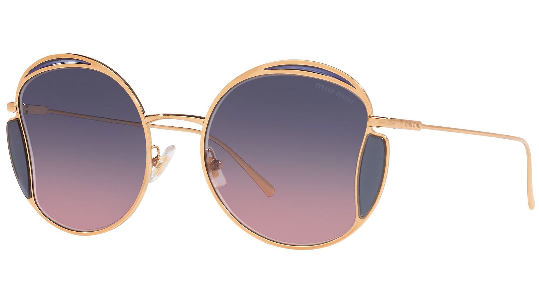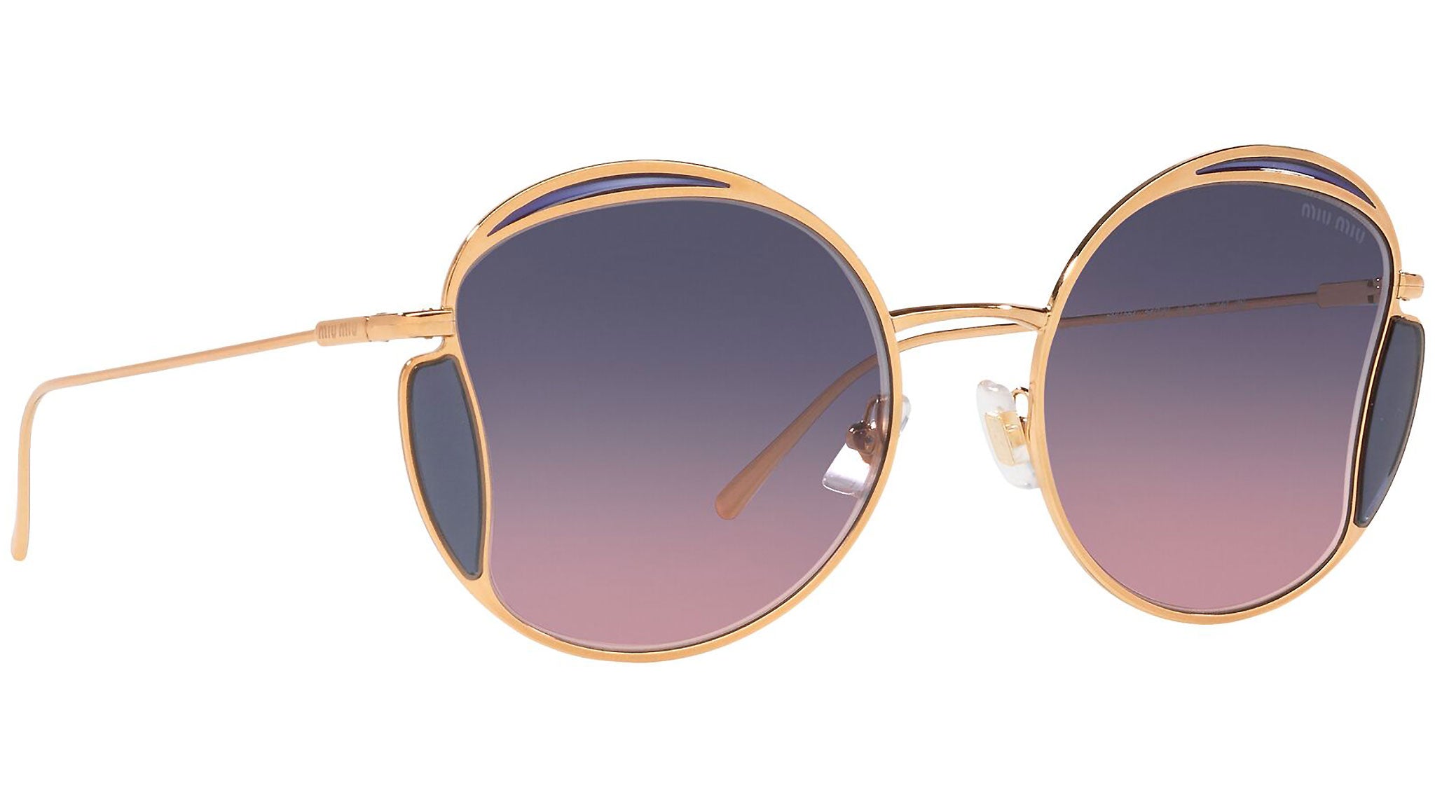 Occhiali da sole Miu Miu modello MU 56XS variante colore 7OE06N ottone, con lenti color rosa sfumato blu. Miu Miu offre creazioni uniche, in cui la costante ricerca stilistica si combina perfettamente con la maestria artigianale della lavorazione. Le silhouette femminili e sinuose delle montature sono espressione di una ricchezza dei dettagli che rispecchia pienamente i codici stilistici e l’indiscusso talento del brand nell’unire il design non convenzionale ad un romanticismo dai rimandi retrò.