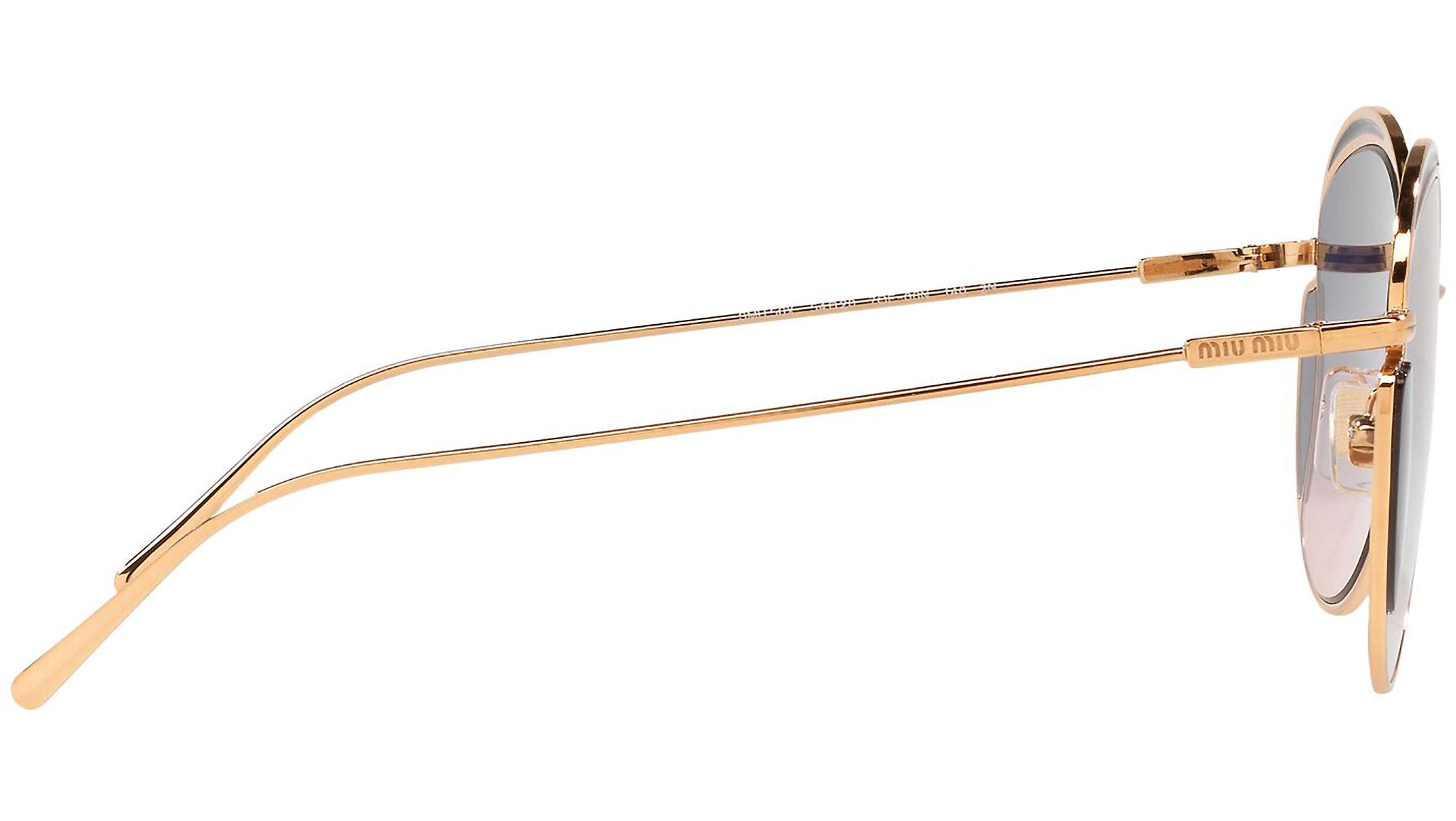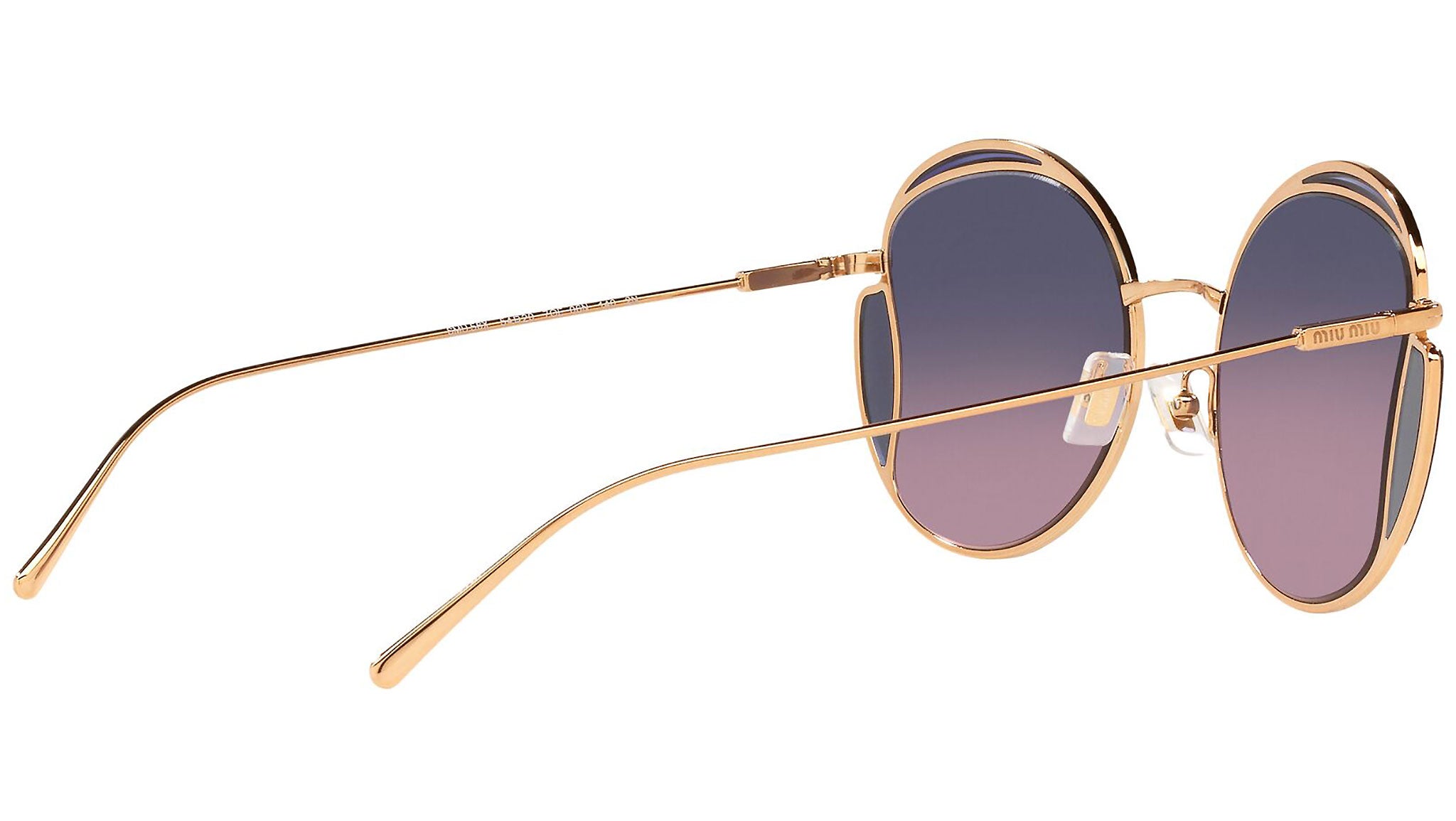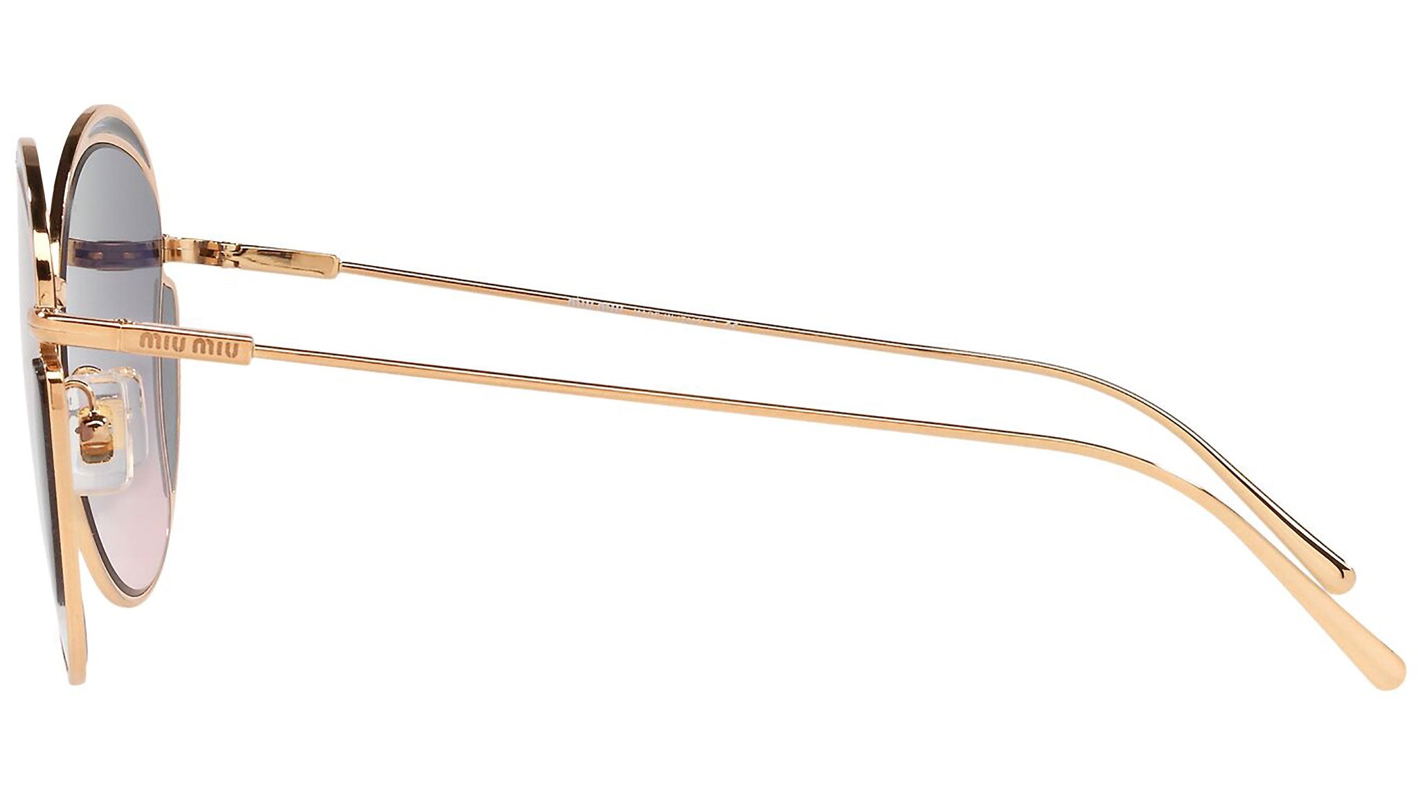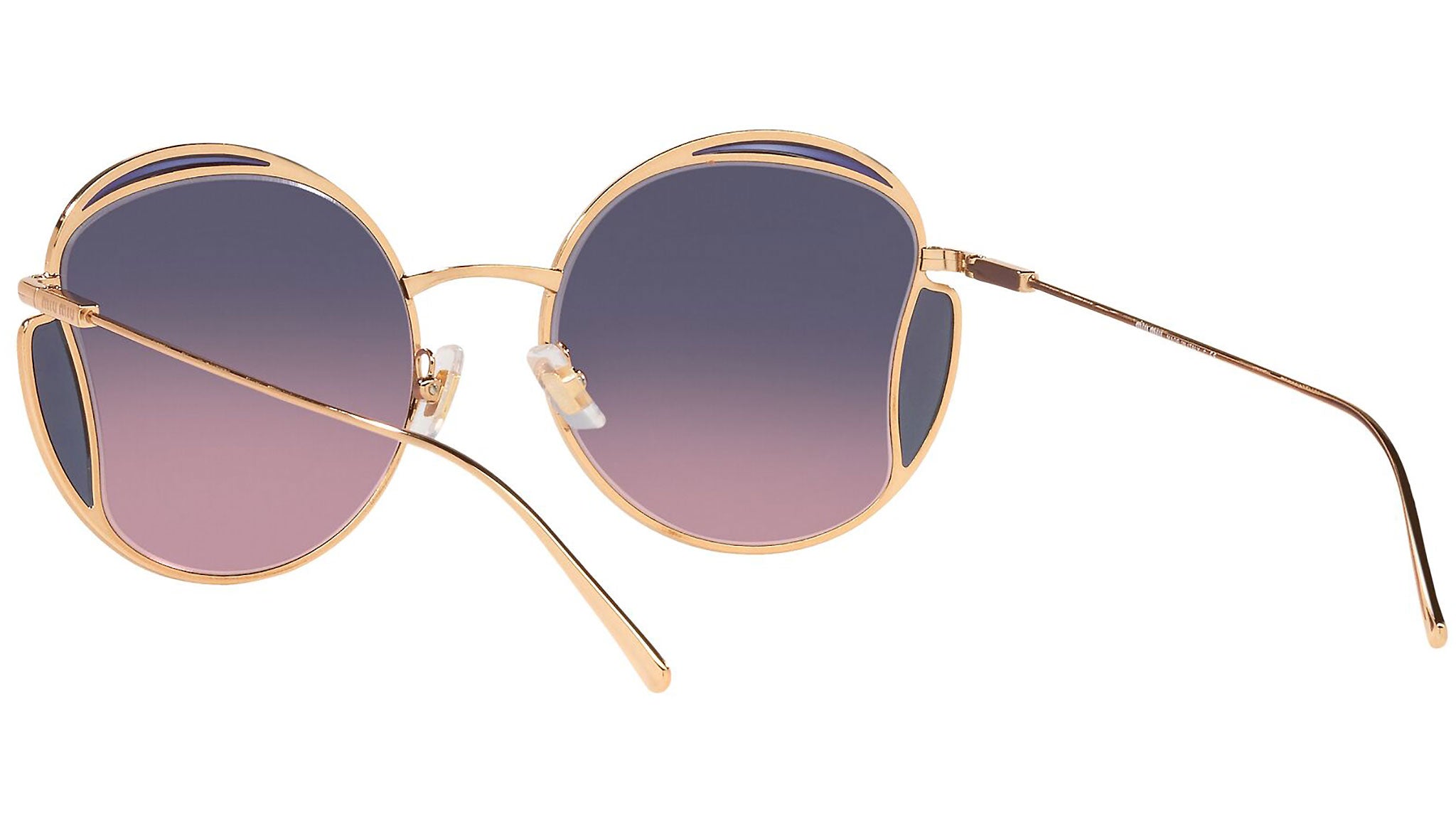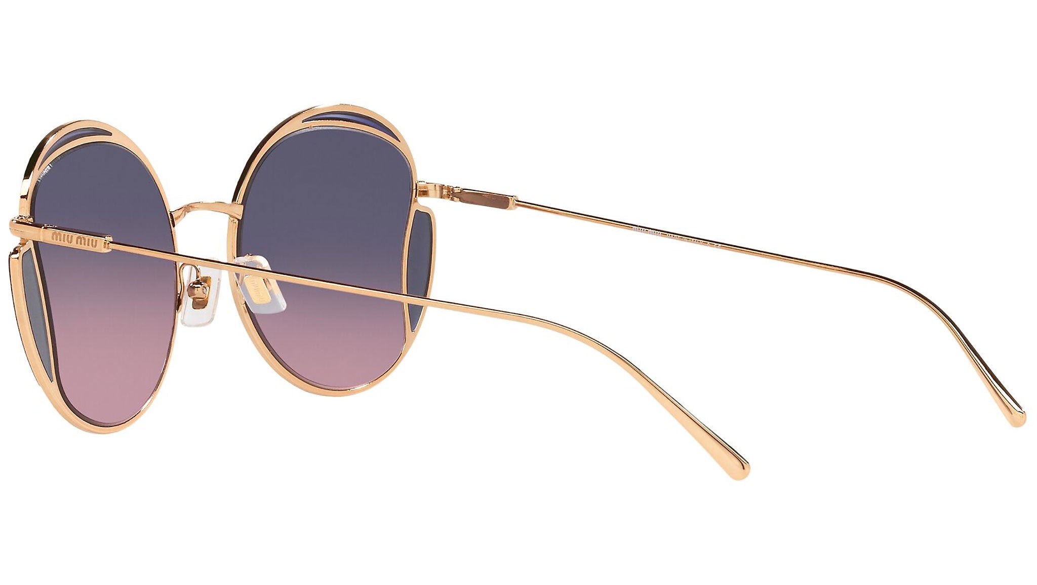 Occhiali da sole Miu Miu modello MU 56XS variante colore 7OE06N ottone, con lenti color rosa sfumato blu. Miu Miu offre creazioni uniche, in cui la costante ricerca stilistica si combina perfettamente con la maestria artigianale della lavorazione. Le silhouette femminili e sinuose delle montature sono espressione di una ricchezza dei dettagli che rispecchia pienamente i codici stilistici e l’indiscusso talento del brand nell’unire il design non convenzionale ad un romanticismo dai rimandi retrò.