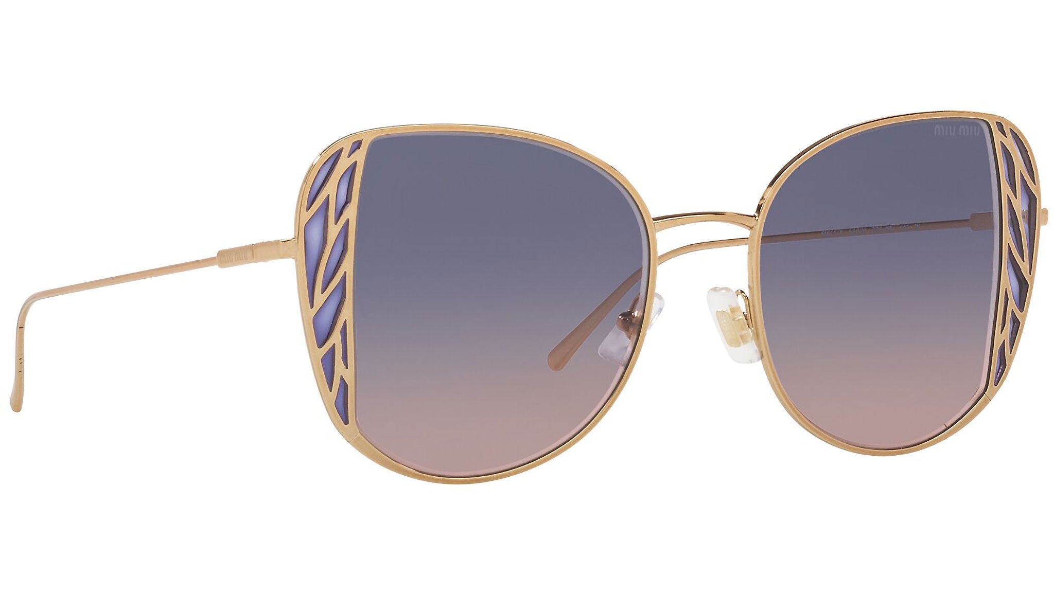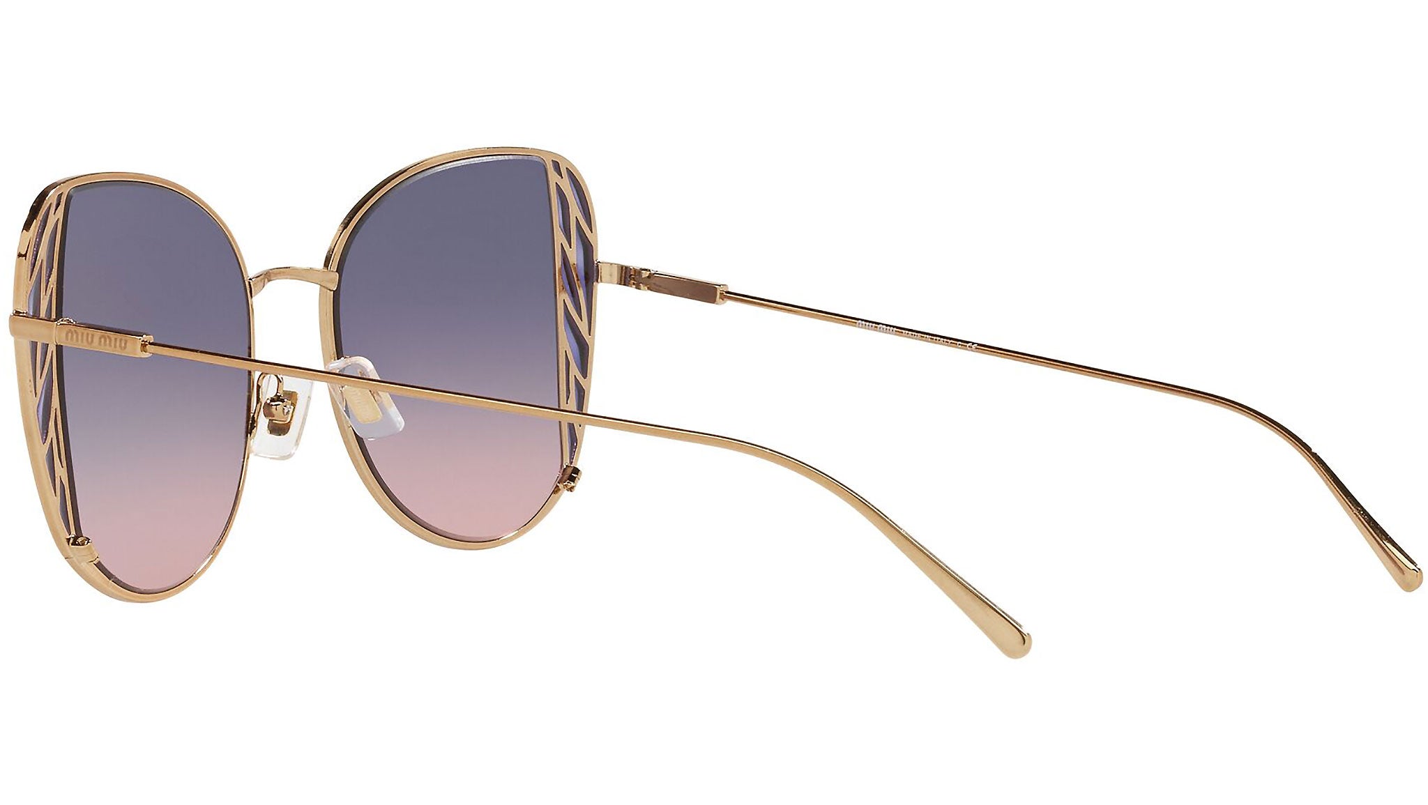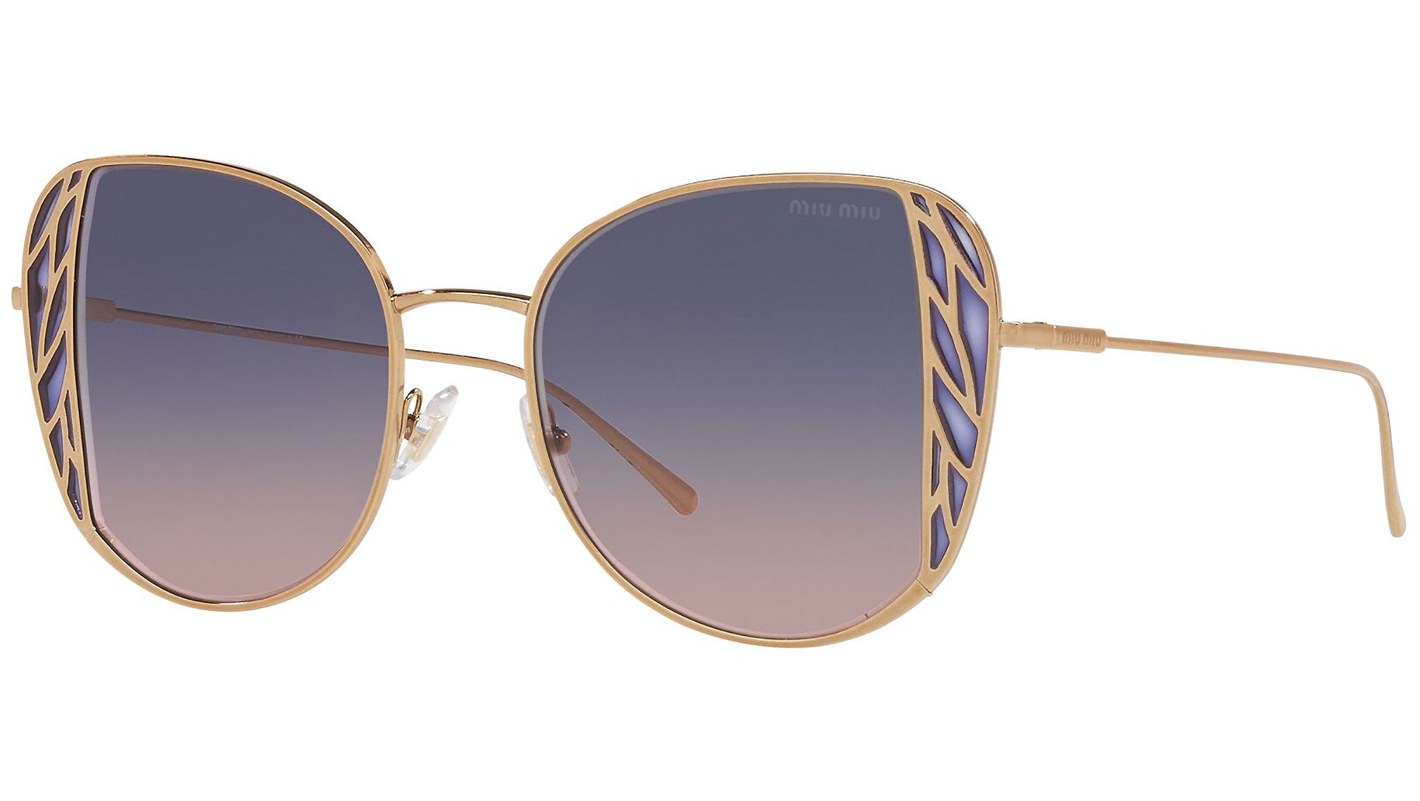 Occhiali da sole Miu Miu modello MU 57XS variante colore 7OE06N ottone, con lenti color rosa sfumato blu. Miu Miu offre creazioni uniche, in cui la costante ricerca stilistica si combina perfettamente con la maestria artigianale della lavorazione. Le silhouette femminili e sinuose delle montature sono espressione di una ricchezza dei dettagli che rispecchia pienamente i codici stilistici e l’indiscusso talento del brand nell’unire il design non convenzionale ad un romanticismo dai rimandi retrò.