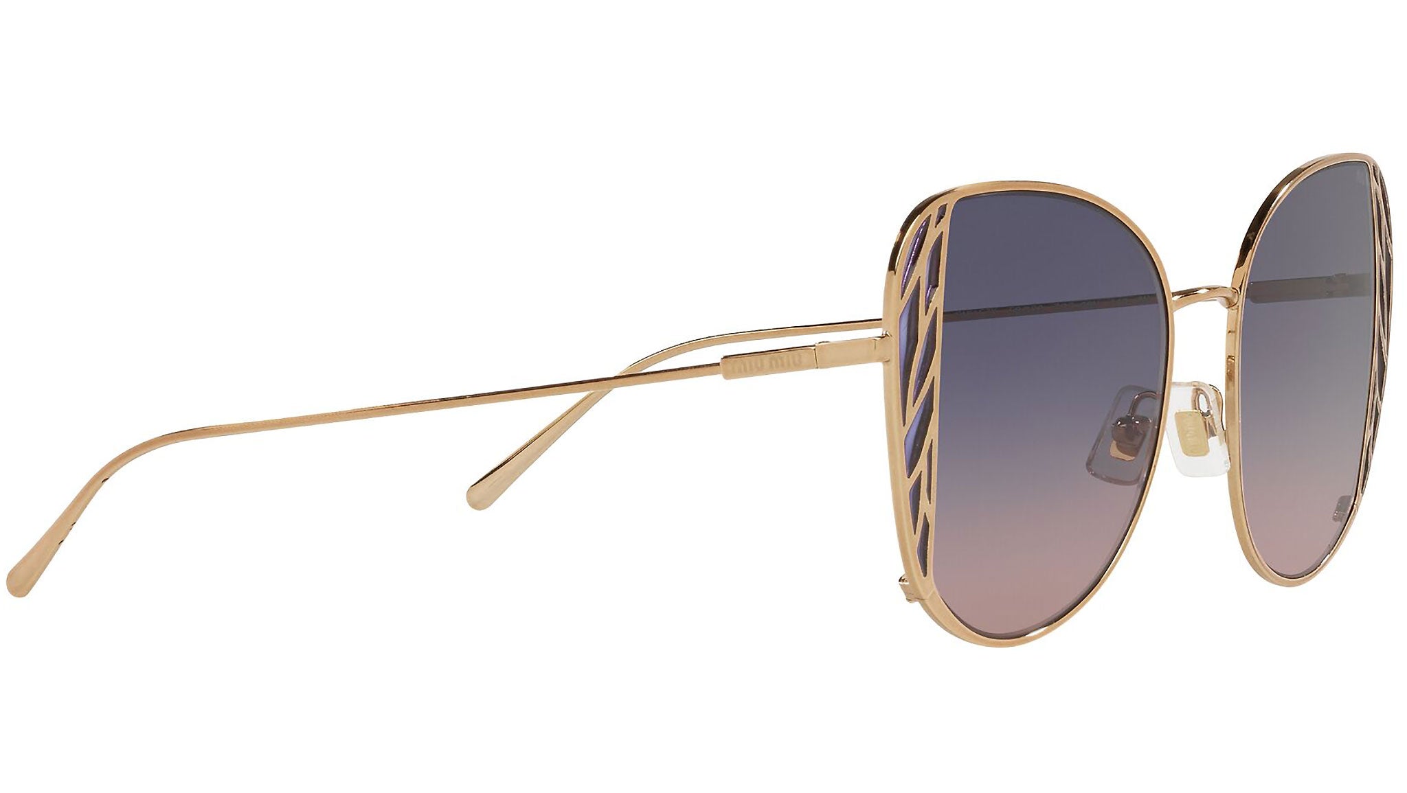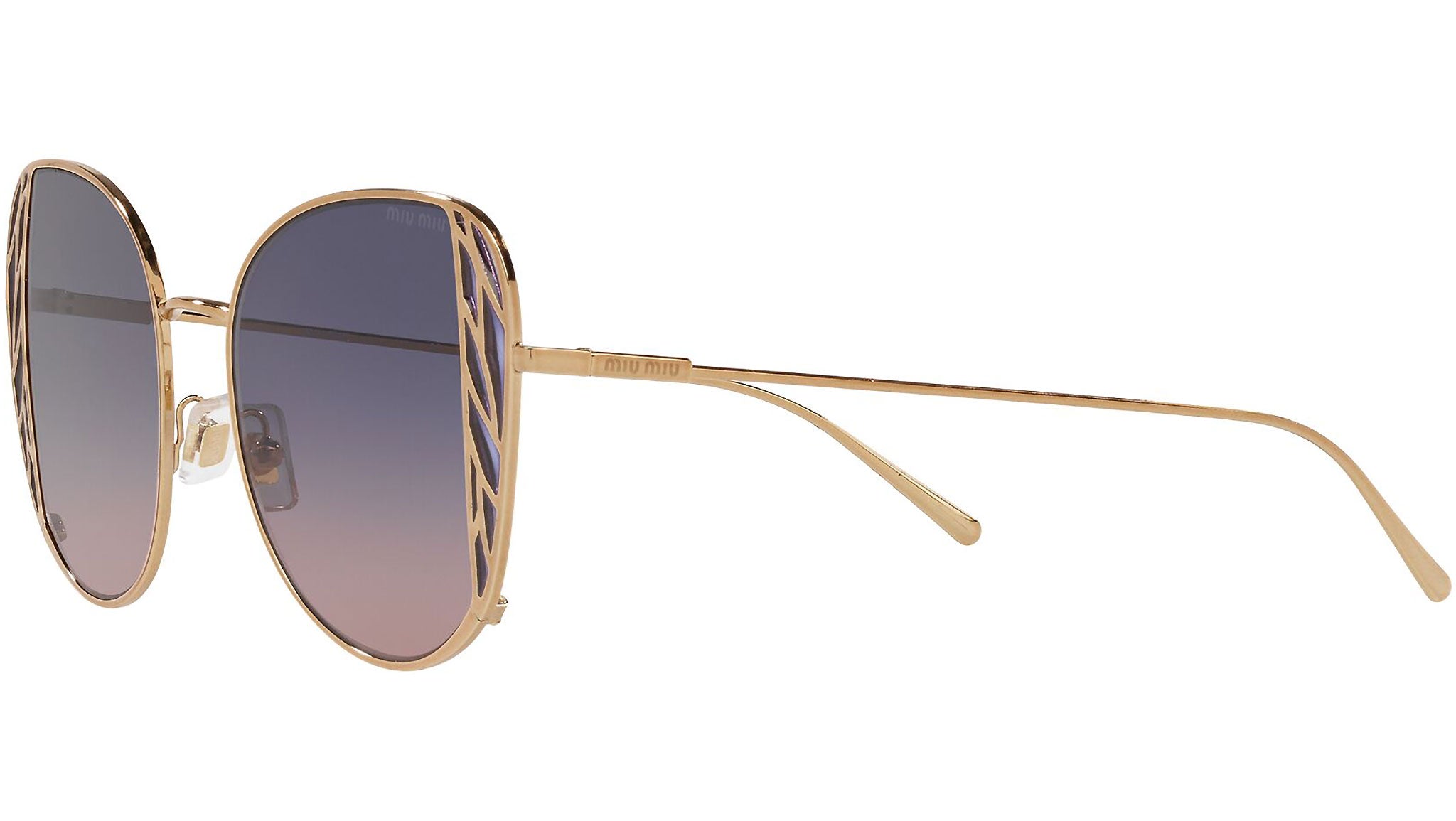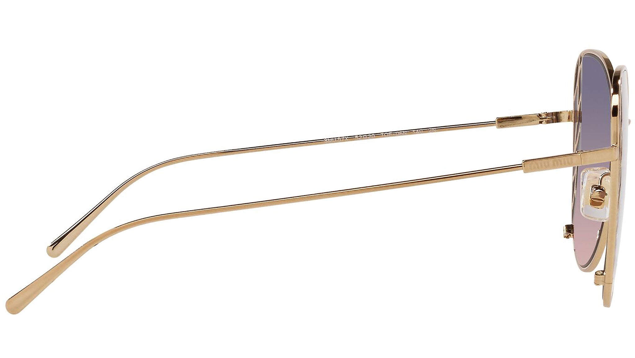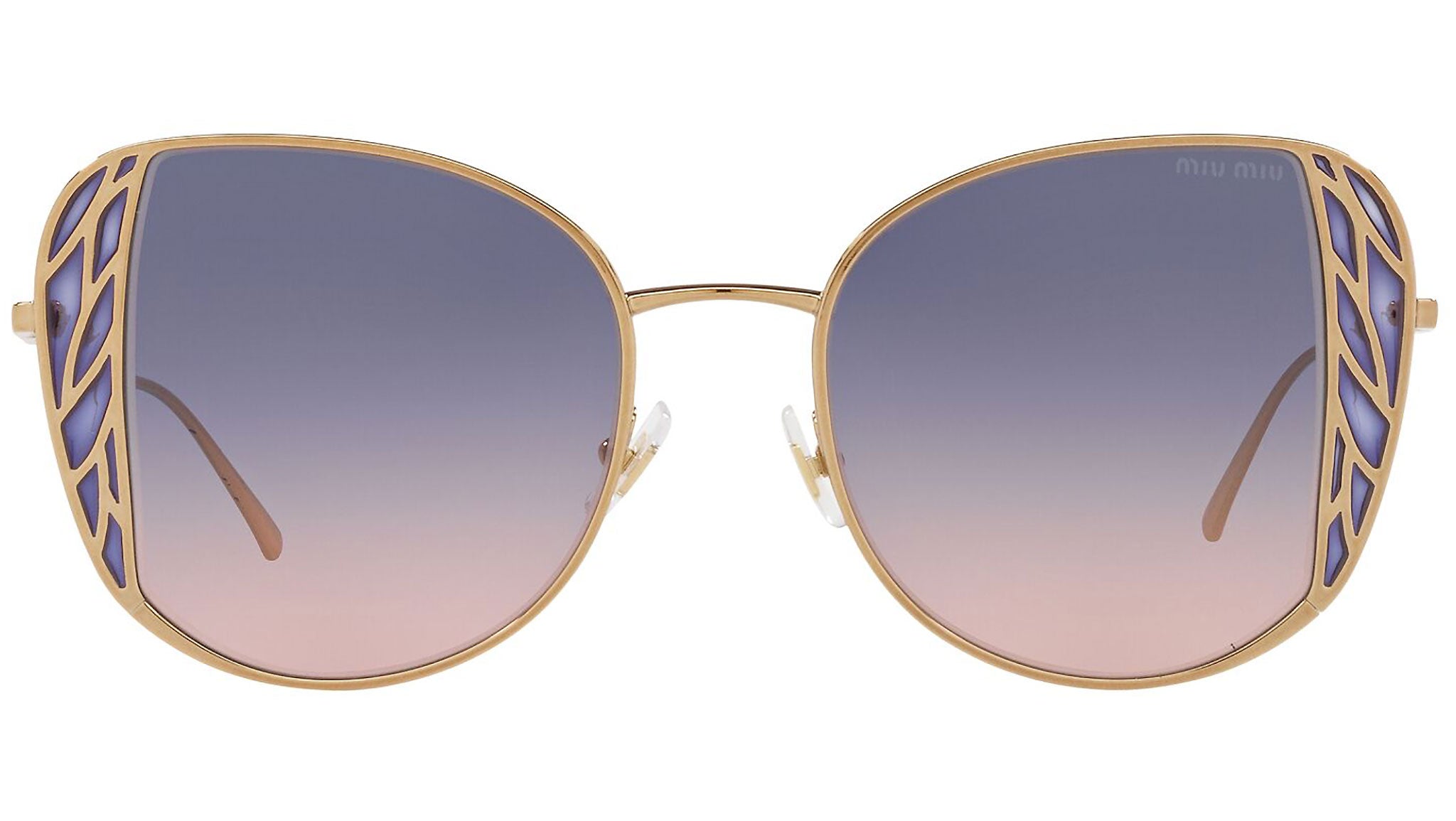 Occhiali da sole Miu Miu modello MU 57XS variante colore 7OE06N ottone, con lenti color rosa sfumato blu. Miu Miu offre creazioni uniche, in cui la costante ricerca stilistica si combina perfettamente con la maestria artigianale della lavorazione. Le silhouette femminili e sinuose delle montature sono espressione di una ricchezza dei dettagli che rispecchia pienamente i codici stilistici e l’indiscusso talento del brand nell’unire il design non convenzionale ad un romanticismo dai rimandi retrò.