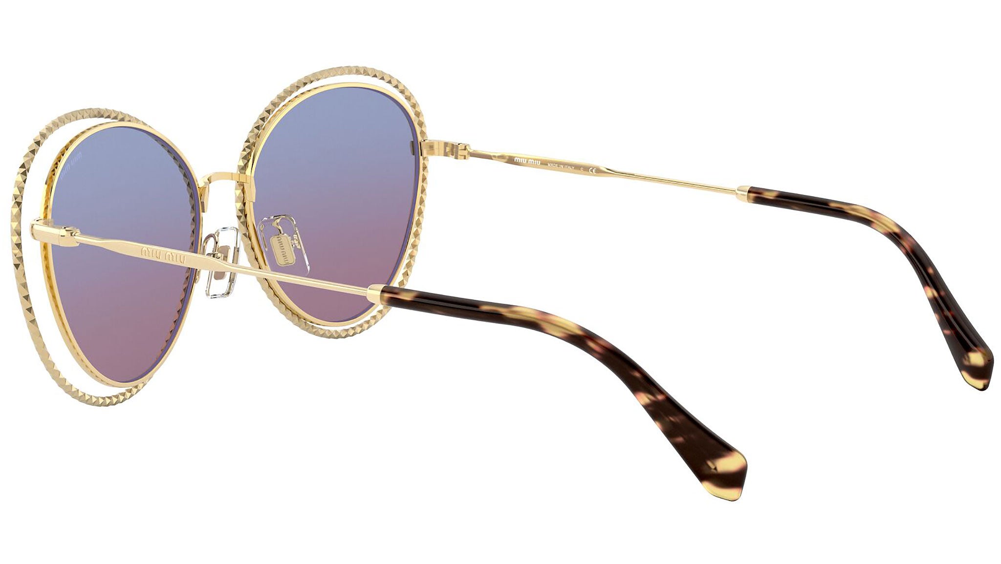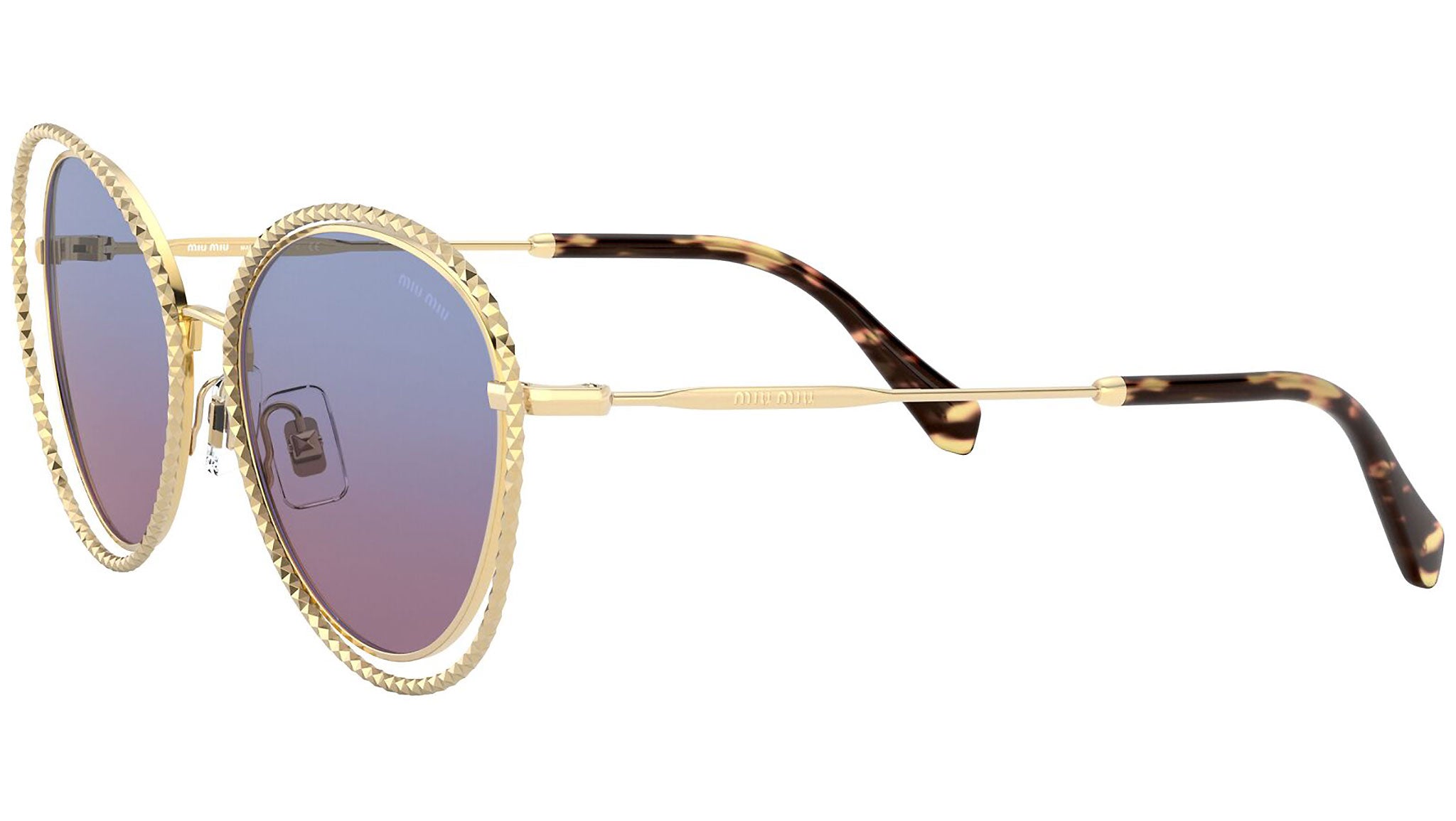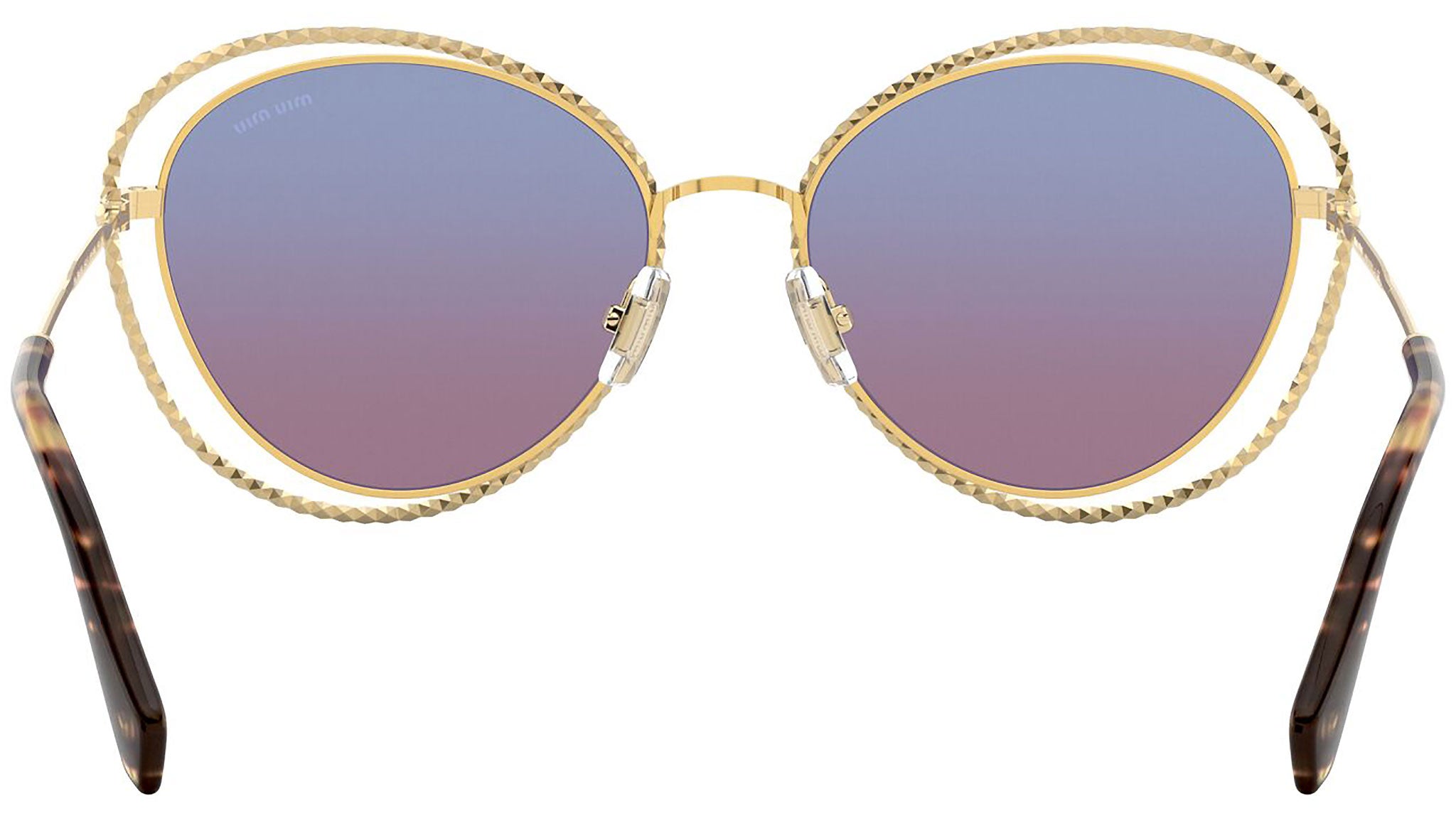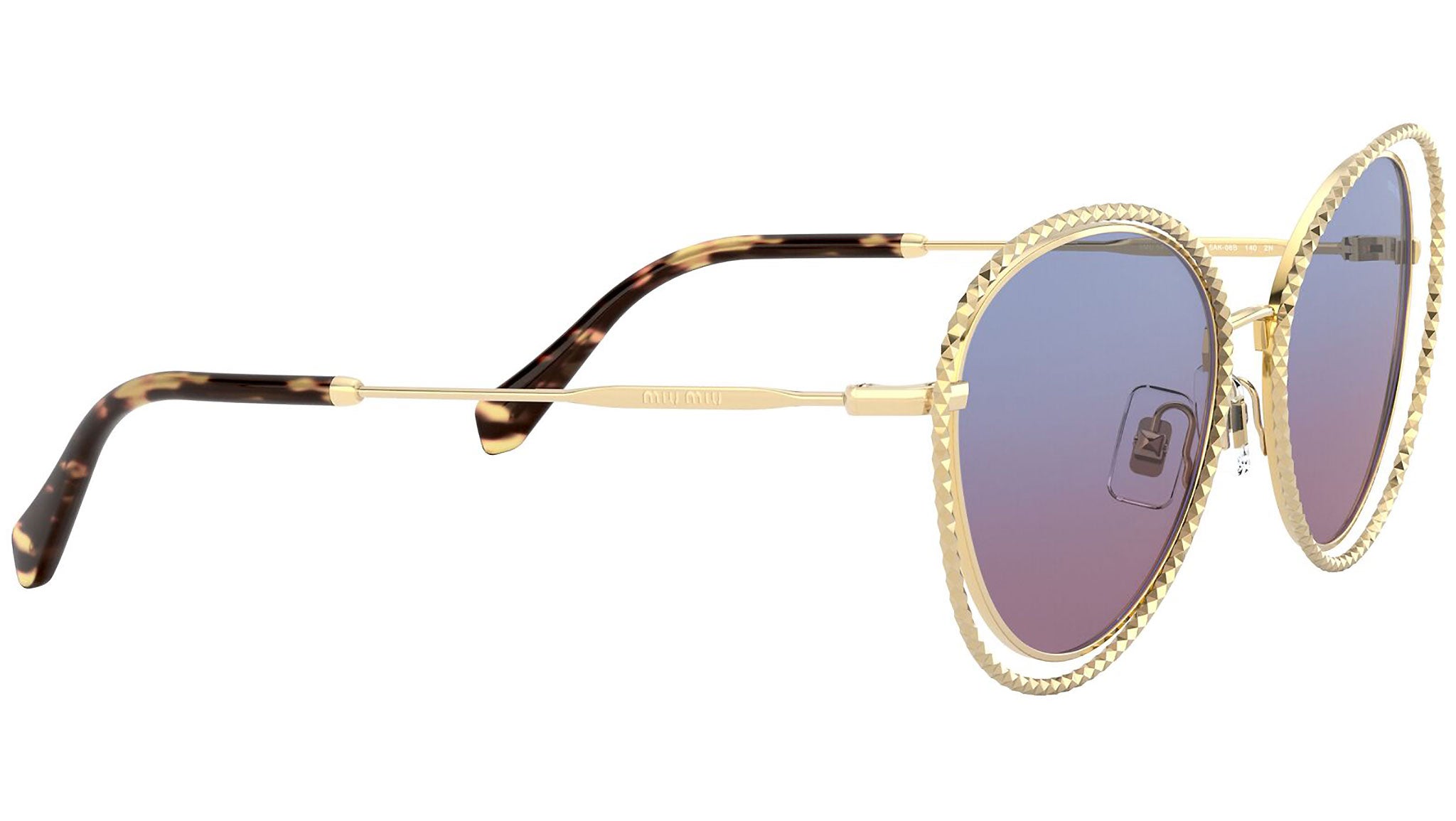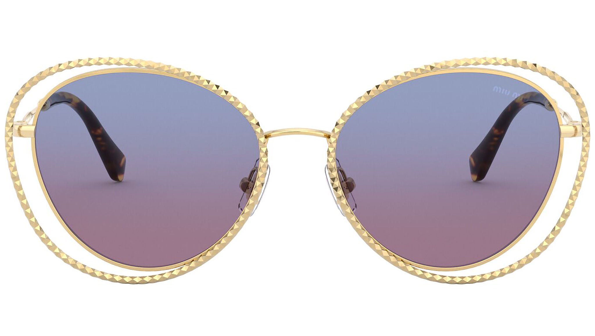 Occhiali da sole Miu Miu modello MU 59VS variante colore 5AK08B oro, con lenti color blu chiaro sfumato magenta. Miu Miu offre creazioni uniche, in cui la costante ricerca stilistica si combina perfettamente con la maestria artigianale della lavorazione. Le silhouette femminili e sinuose delle montature sono espressione di una ricchezza dei dettagli che rispecchia pienamente i codici stilistici e l’indiscusso talento del brand nell’unire il design non convenzionale ad un romanticismo dai rimandi retrò.
