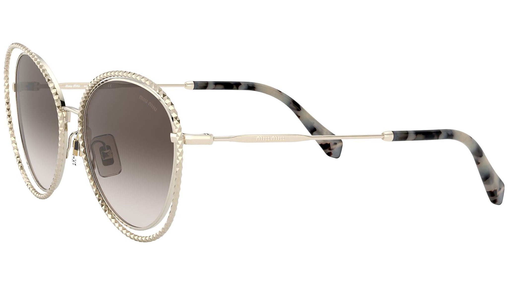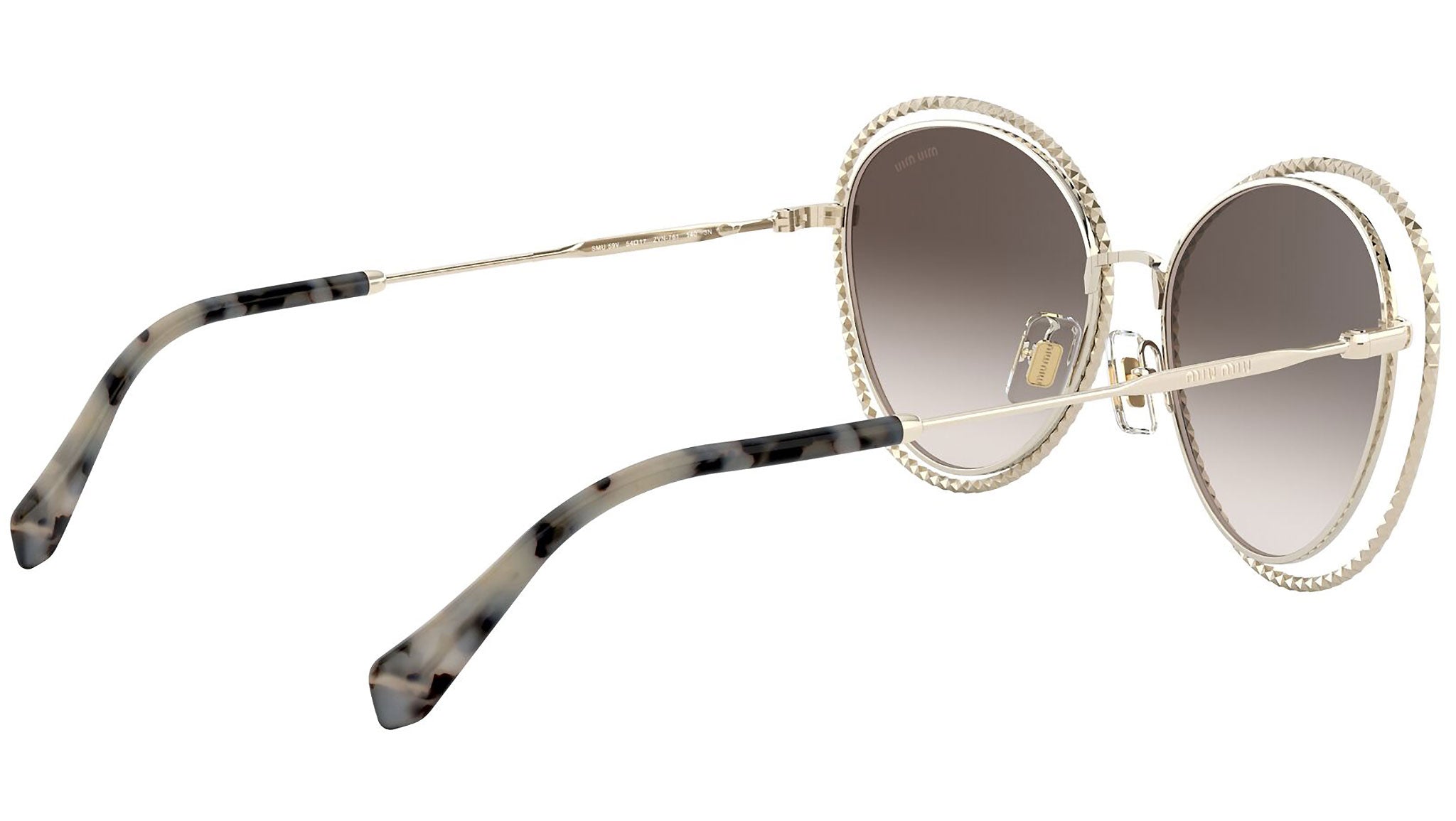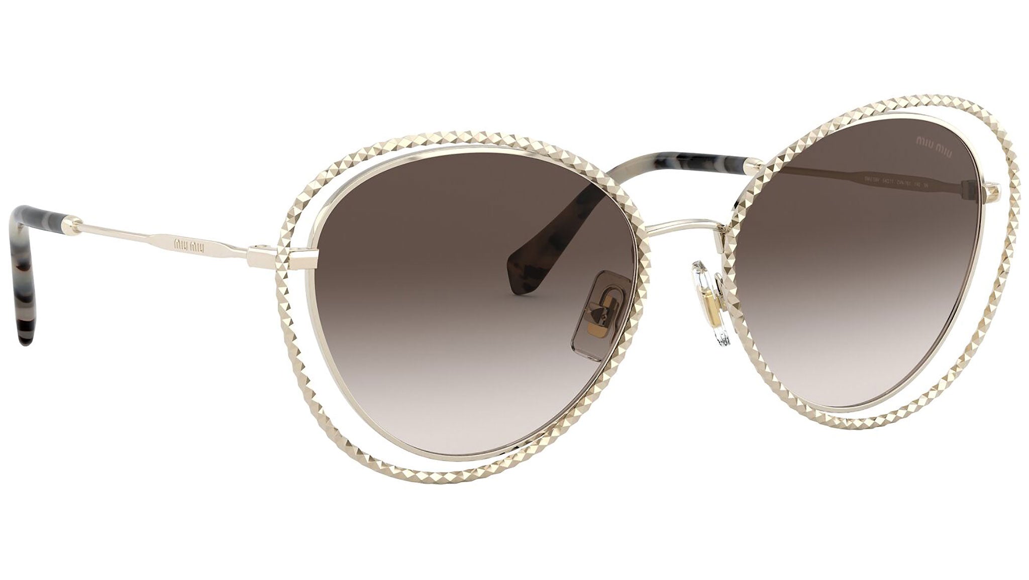 Occhiali da sole Miu Miu modello MU 59VS variante colore ZVN6S1 oro chiaro, con lenti color marrone sfumato. Miu Miu offre creazioni uniche, in cui la costante ricerca stilistica si combina perfettamente con la maestria artigianale della lavorazione. Le silhouette femminili e sinuose delle montature sono espressione di una ricchezza dei dettagli che rispecchia pienamente i codici stilistici e l’indiscusso talento del brand nell’unire il design non convenzionale ad un romanticismo dai rimandi retrò.