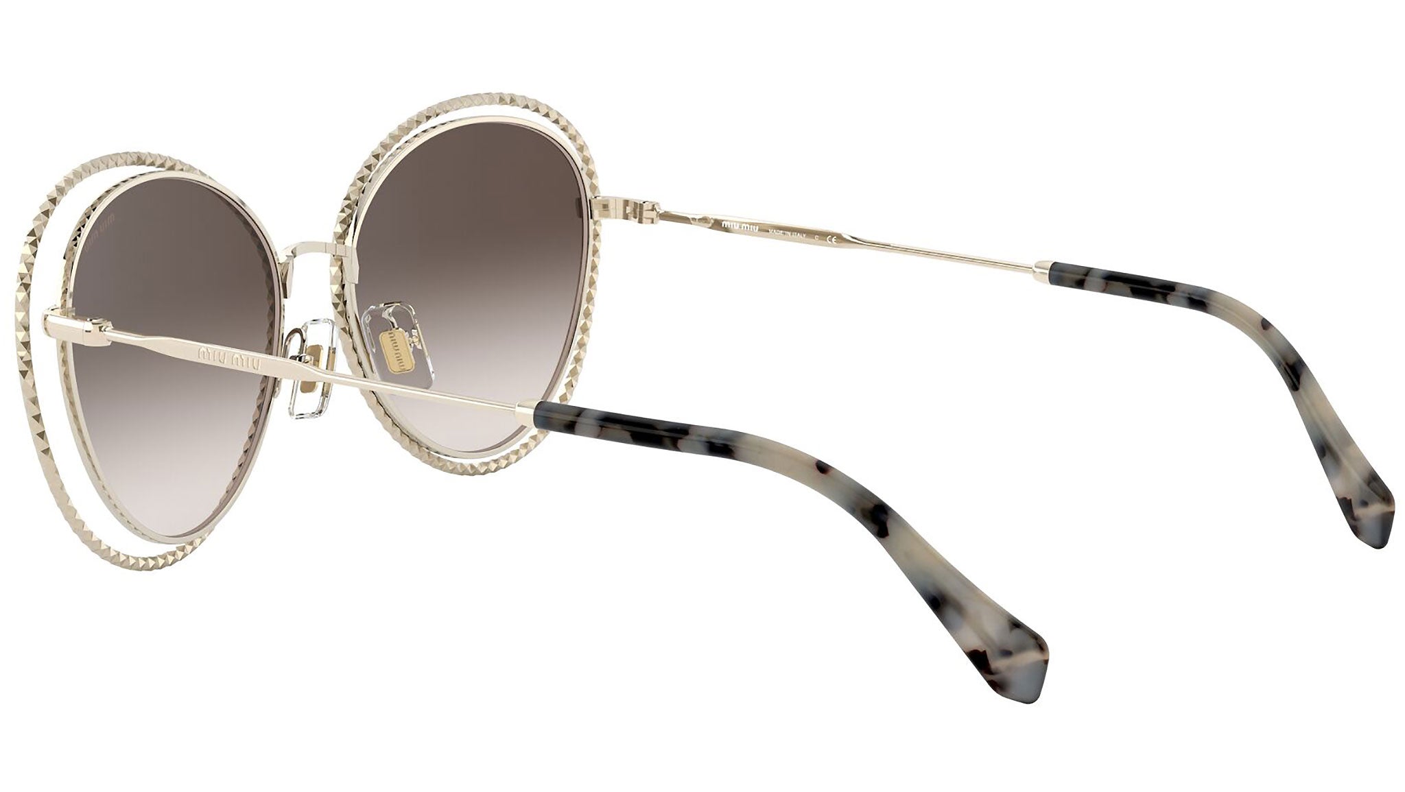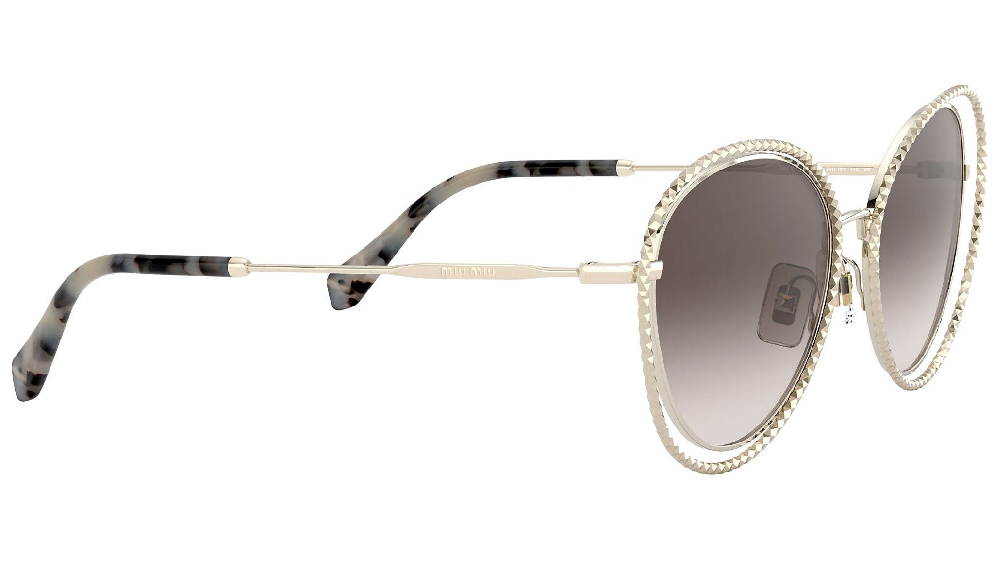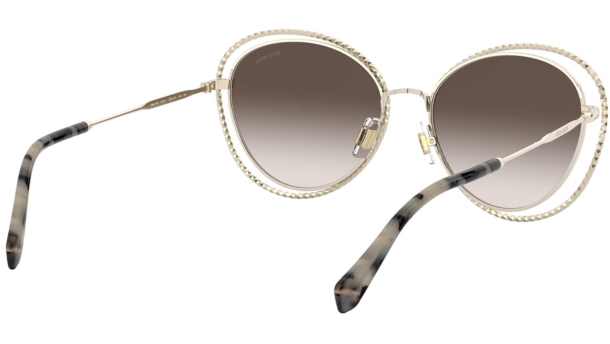 Occhiali da sole Miu Miu modello MU 59VS variante colore ZVN6S1 oro chiaro, con lenti color marrone sfumato. Miu Miu offre creazioni uniche, in cui la costante ricerca stilistica si combina perfettamente con la maestria artigianale della lavorazione. Le silhouette femminili e sinuose delle montature sono espressione di una ricchezza dei dettagli che rispecchia pienamente i codici stilistici e l’indiscusso talento del brand nell’unire il design non convenzionale ad un romanticismo dai rimandi retrò.