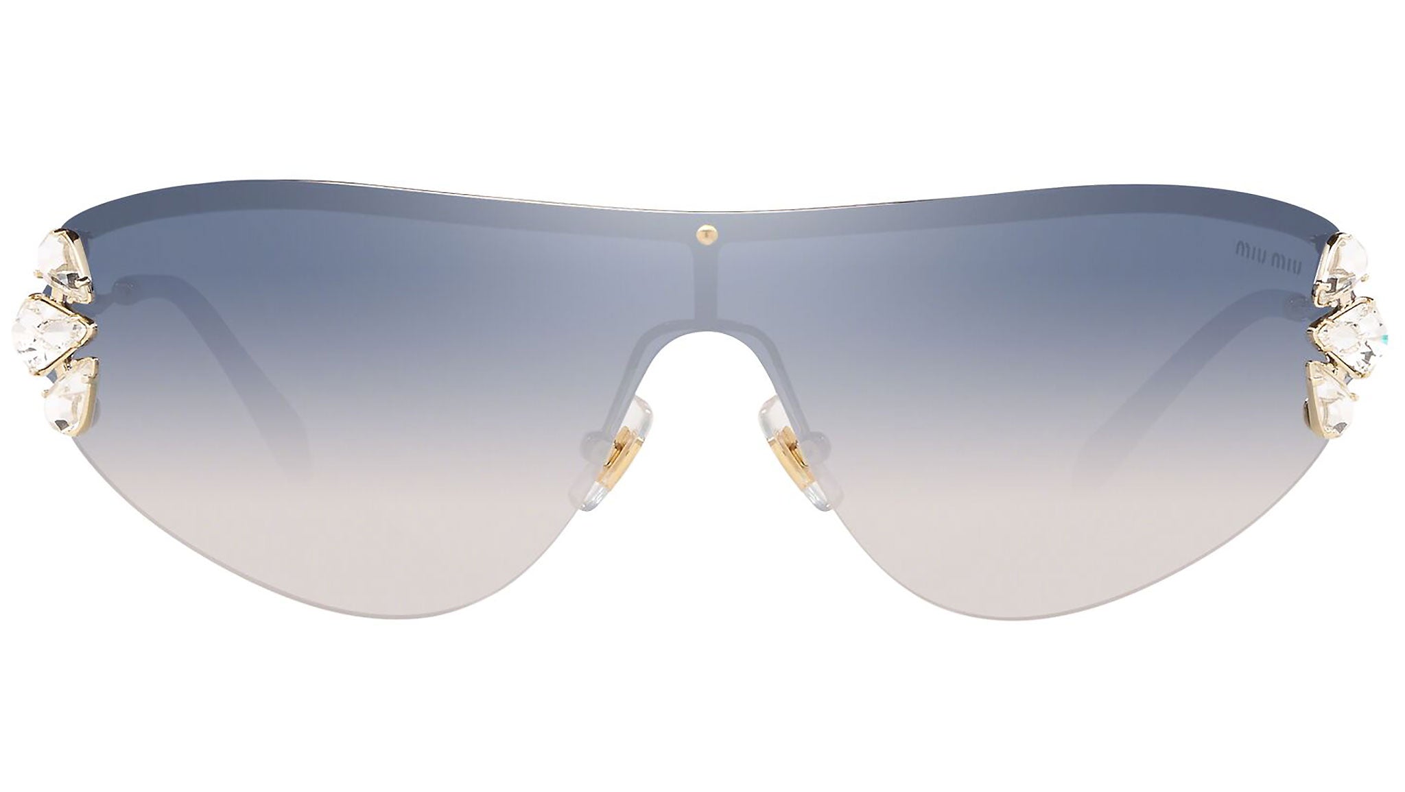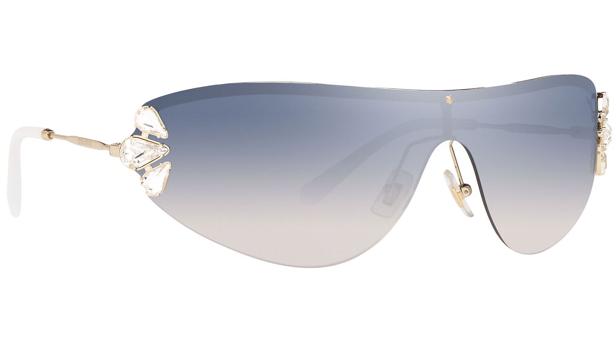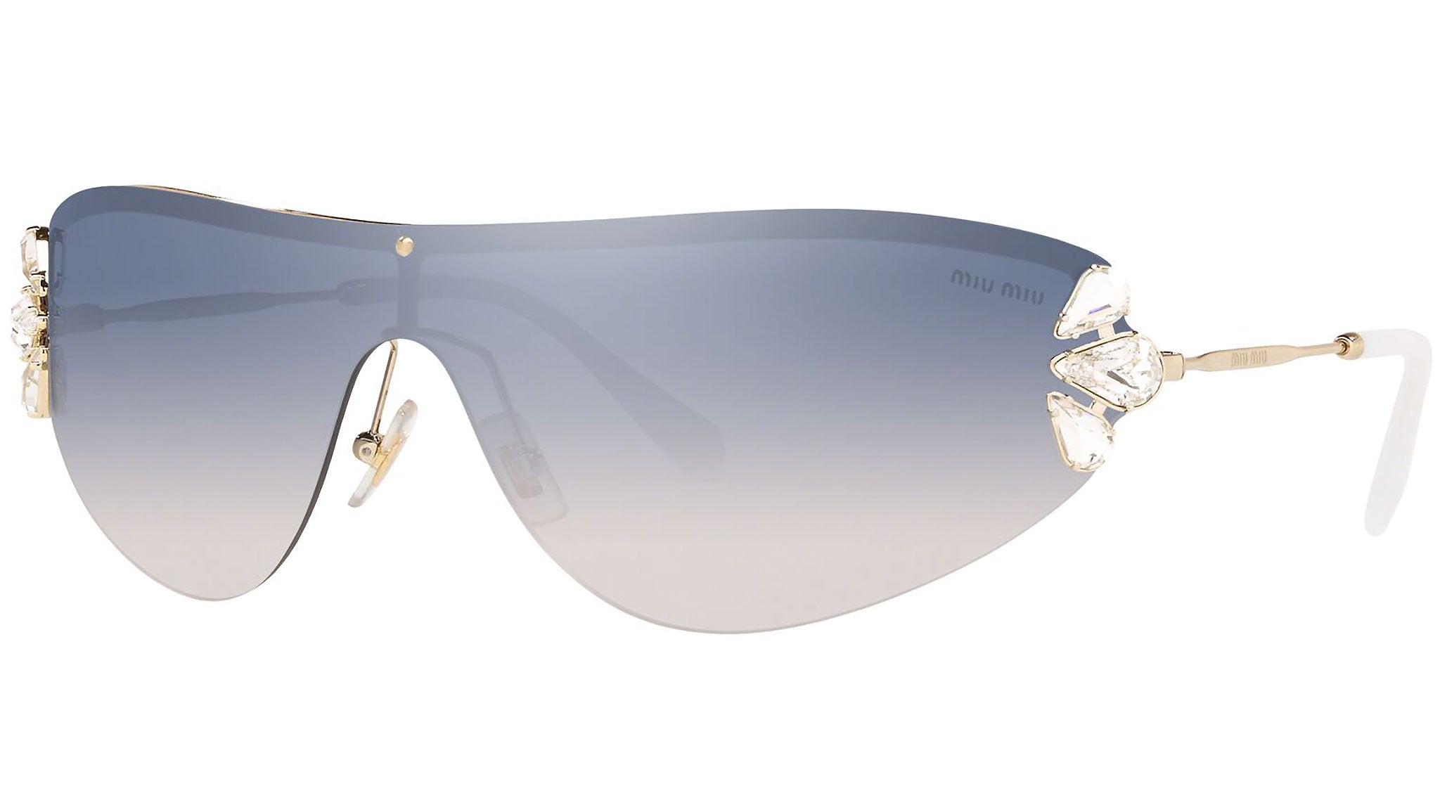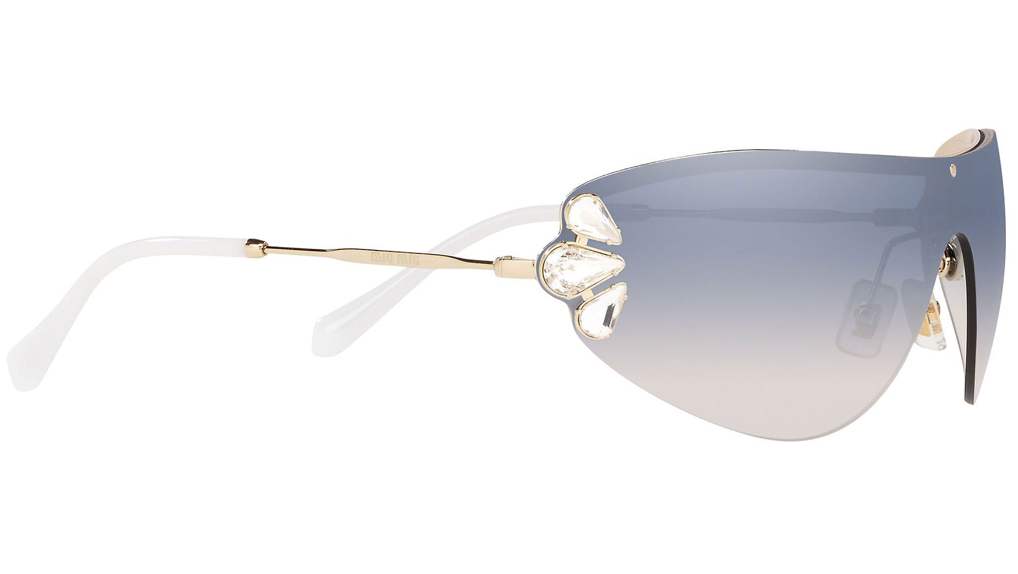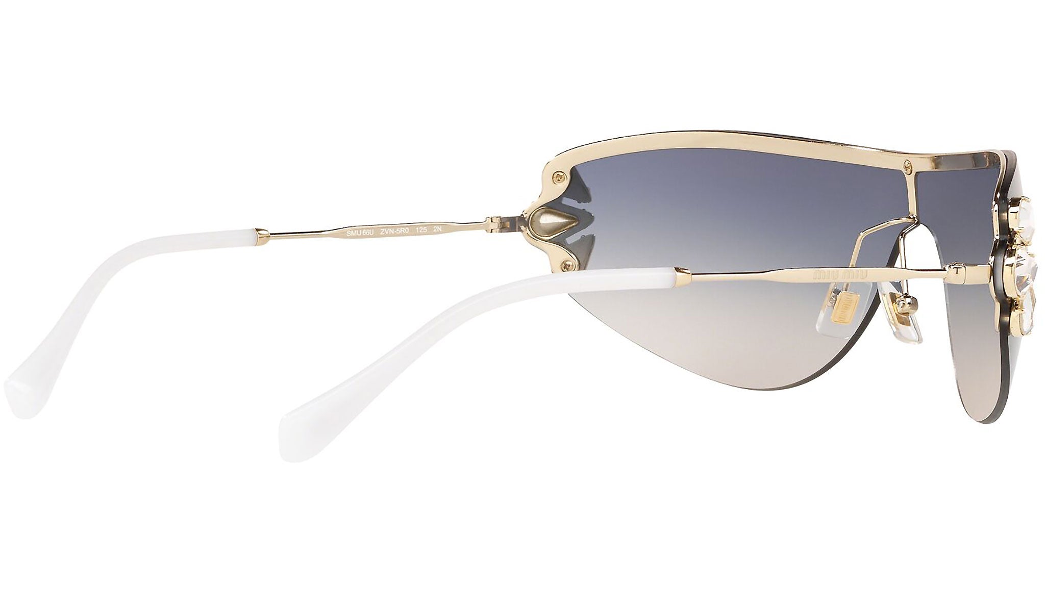 Occhiali da sole Miu Miu modello MU 66US variante colore ZVN5R0 oro chiaro, con lenti color blu sfumato argento a specchio. Miu Miu offre creazioni uniche, in cui la costante ricerca stilistica si combina perfettamente con la maestria artigianale della lavorazione. Le silhouette femminili e sinuose delle montature sono espressione di una ricchezza dei dettagli che rispecchia pienamente i codici stilistici e l’indiscusso talento del brand nell’unire il design non convenzionale ad un romanticismo dai rimandi retrò.