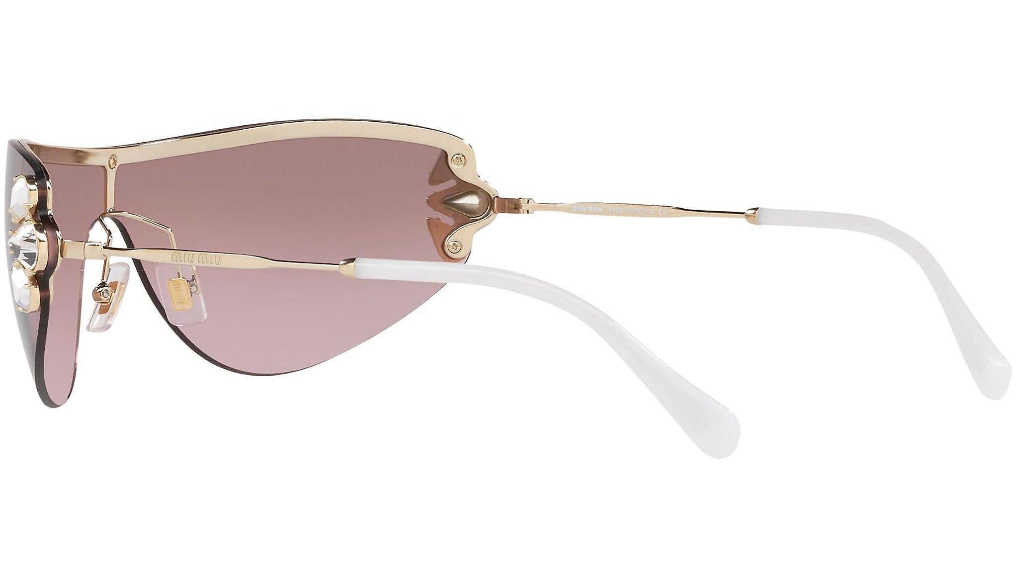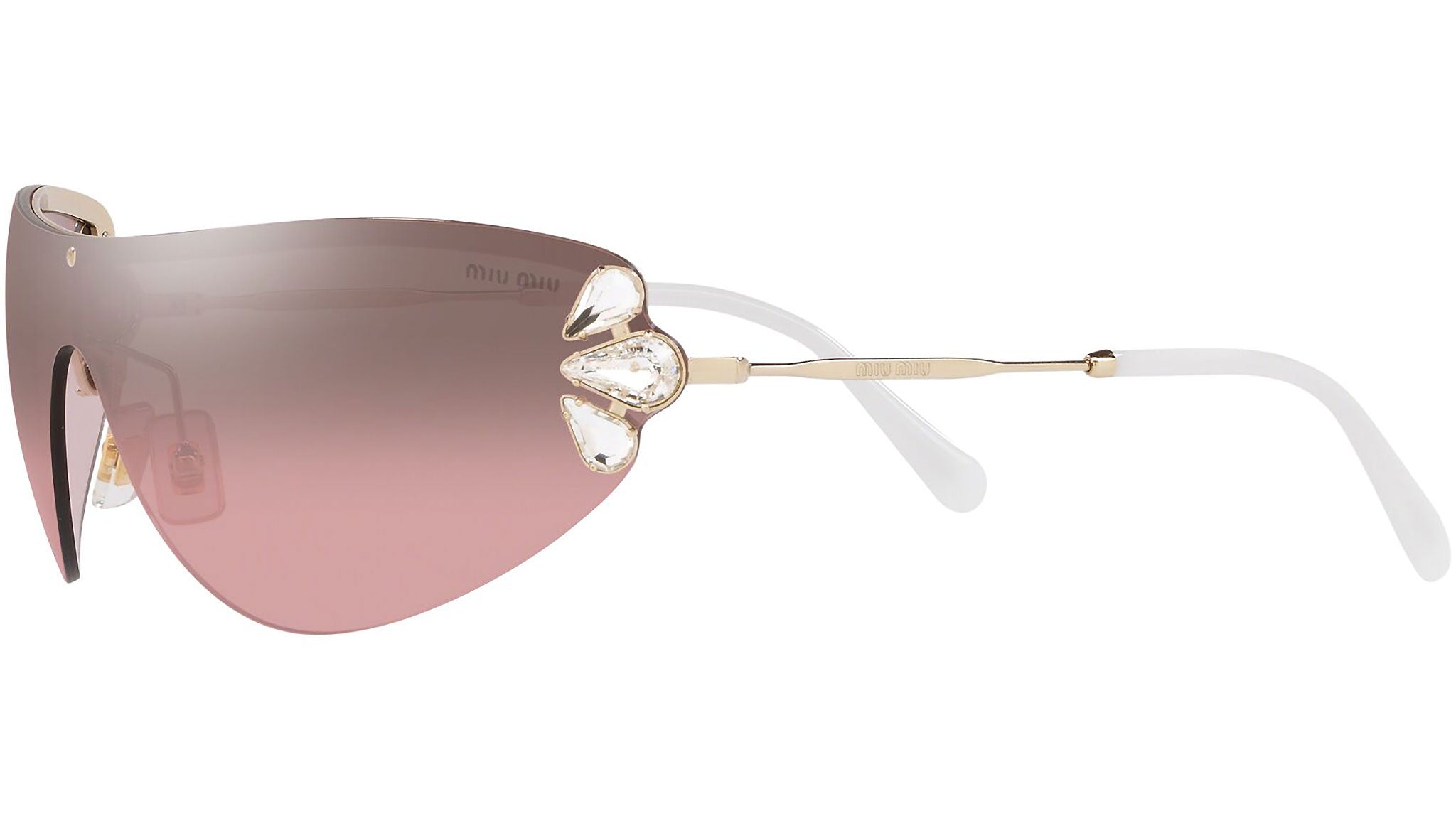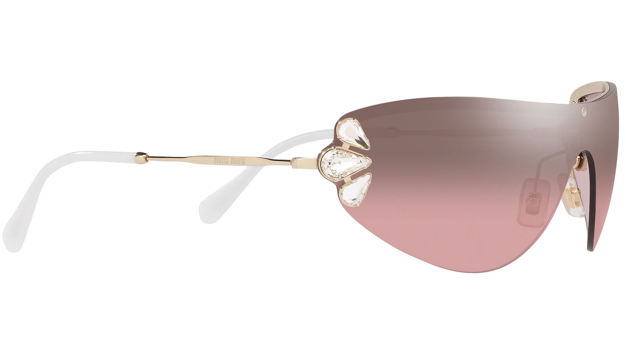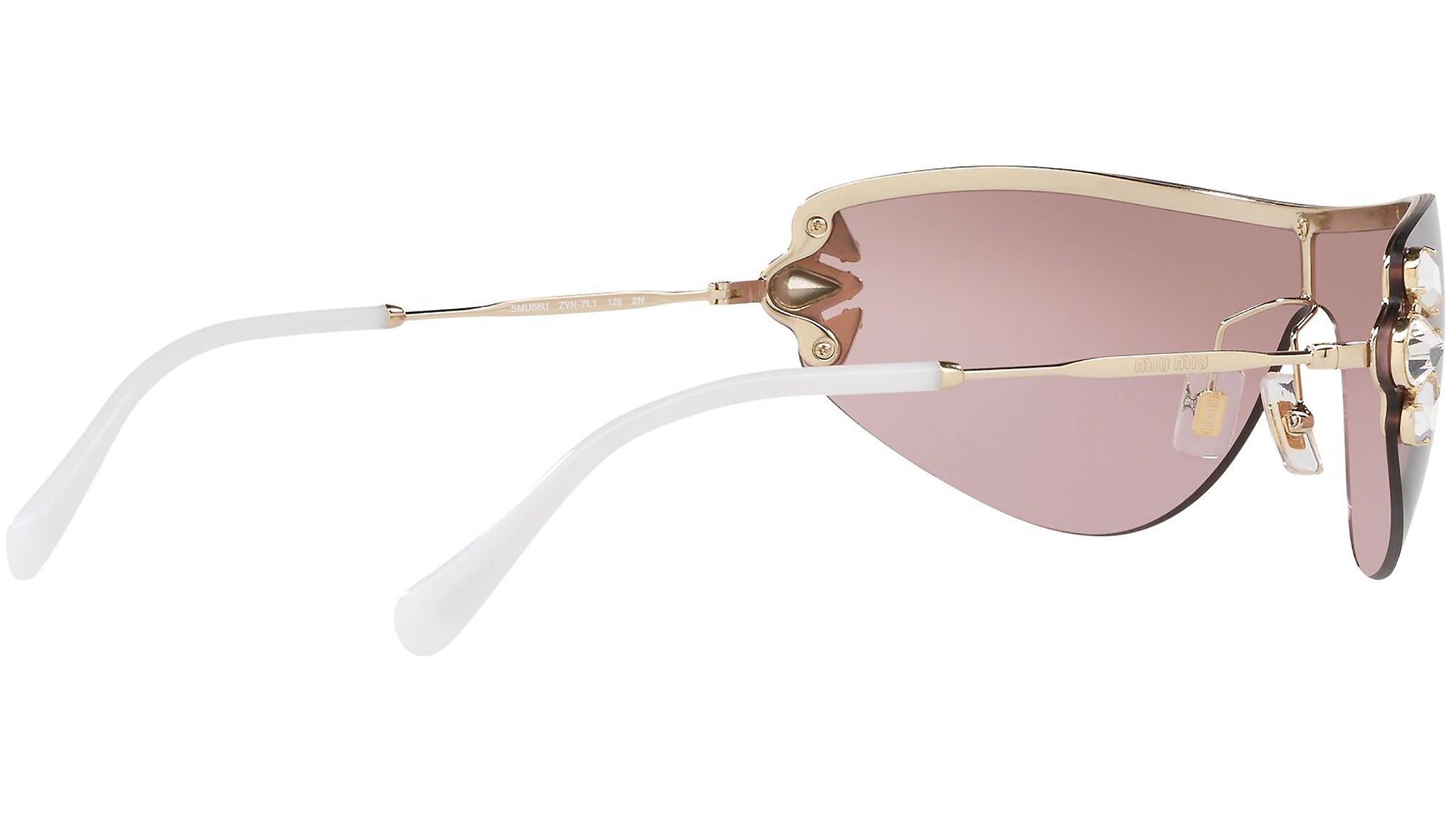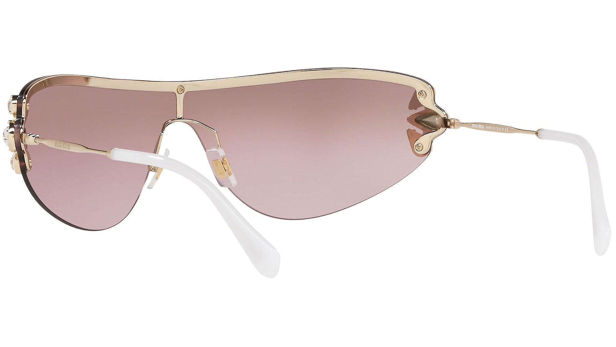 Occhiali da sole Miu Miu modello MU 66US variante colore ZVN7L1 oro chiaro, con lenti color rosa sfumato argento a specchio. Miu Miu offre creazioni uniche, in cui la costante ricerca stilistica si combina perfettamente con la maestria artigianale della lavorazione. Le silhouette femminili e sinuose delle montature sono espressione di una ricchezza dei dettagli che rispecchia pienamente i codici stilistici e l’indiscusso talento del brand nell’unire il design non convenzionale ad un romanticismo dai rimandi retrò.