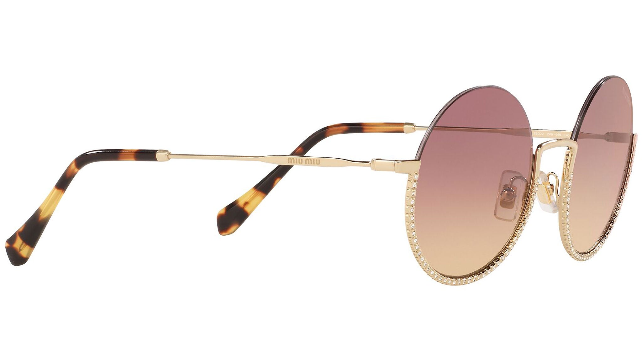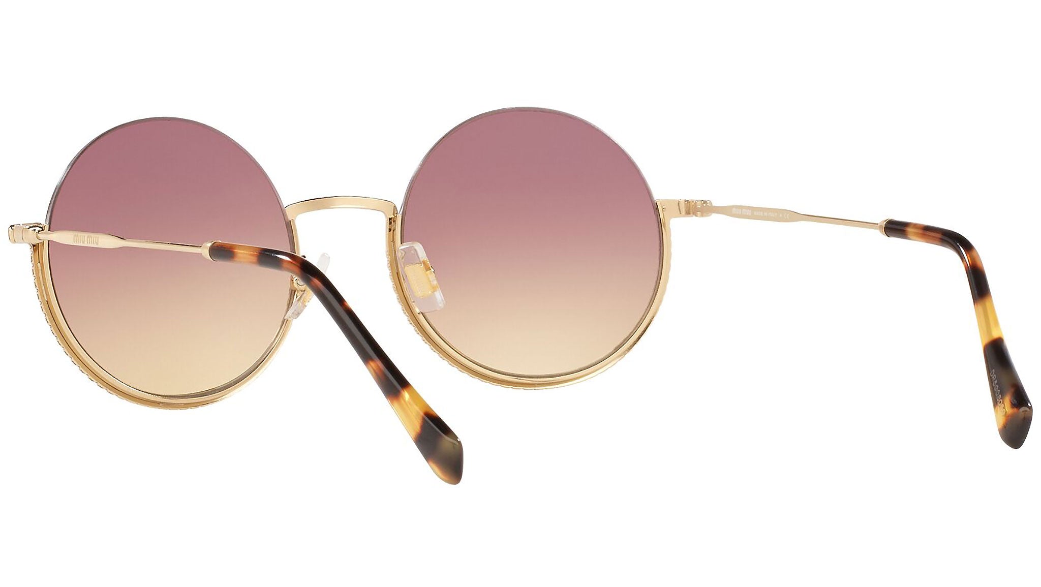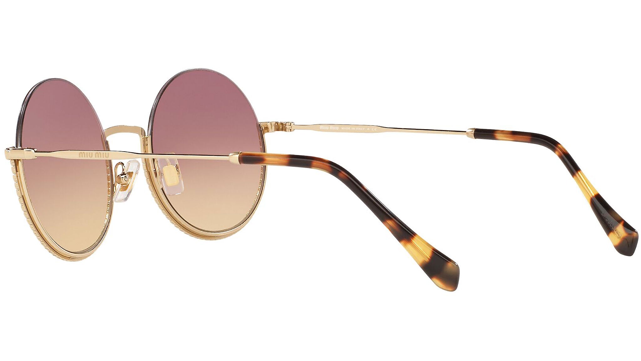 Occhiali da sole Miu Miu modello MU 69US variante colore ZVN09B oro chiaro, con lenti color giallo sfumato viola. Miu Miu offre creazioni uniche, in cui la costante ricerca stilistica si combina perfettamente con la maestria artigianale della lavorazione. Le silhouette femminili e sinuose delle montature sono espressione di una ricchezza dei dettagli che rispecchia pienamente i codici stilistici e l’indiscusso talento del brand nell’unire il design non convenzionale ad un romanticismo dai rimandi retrò.