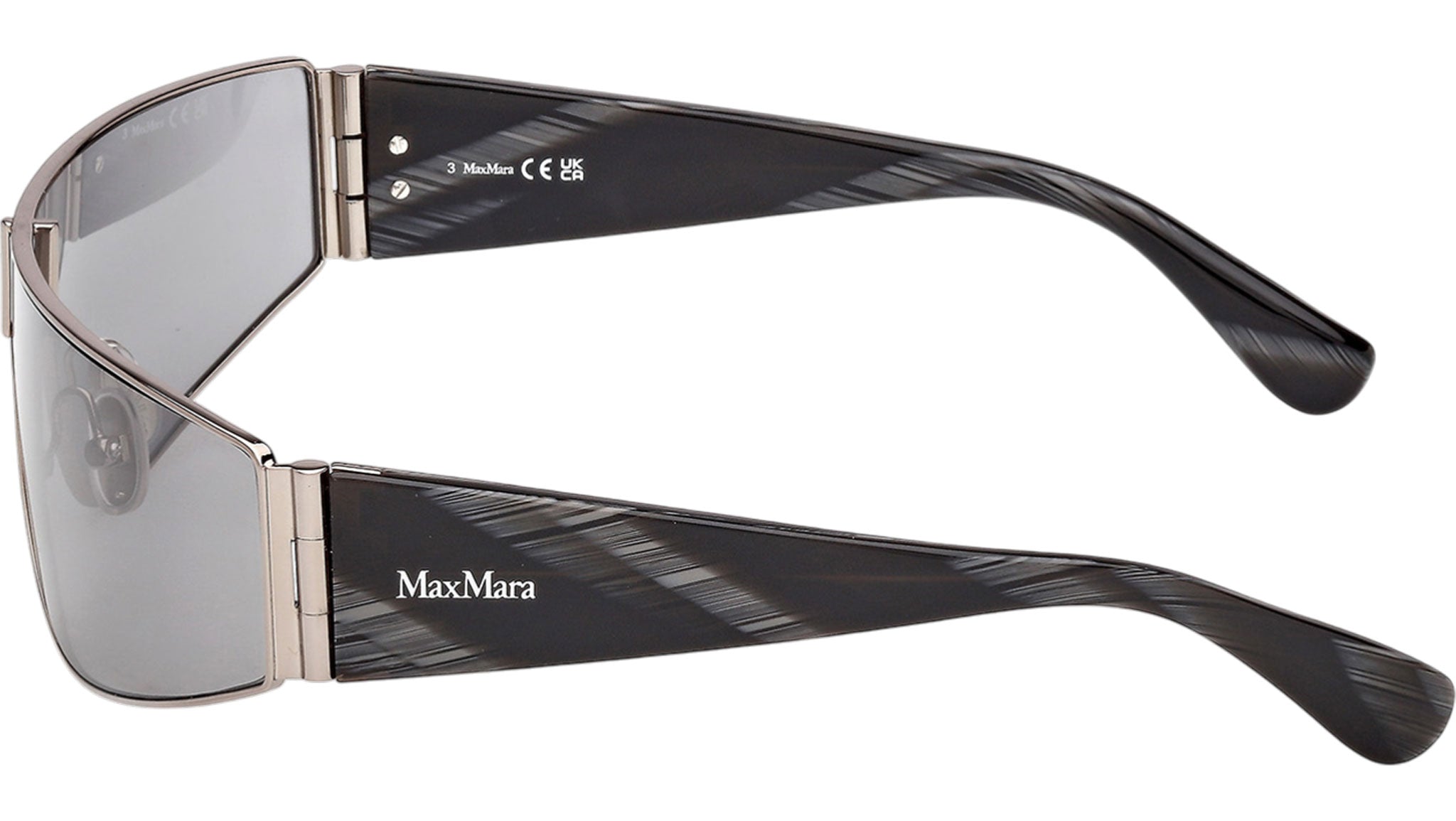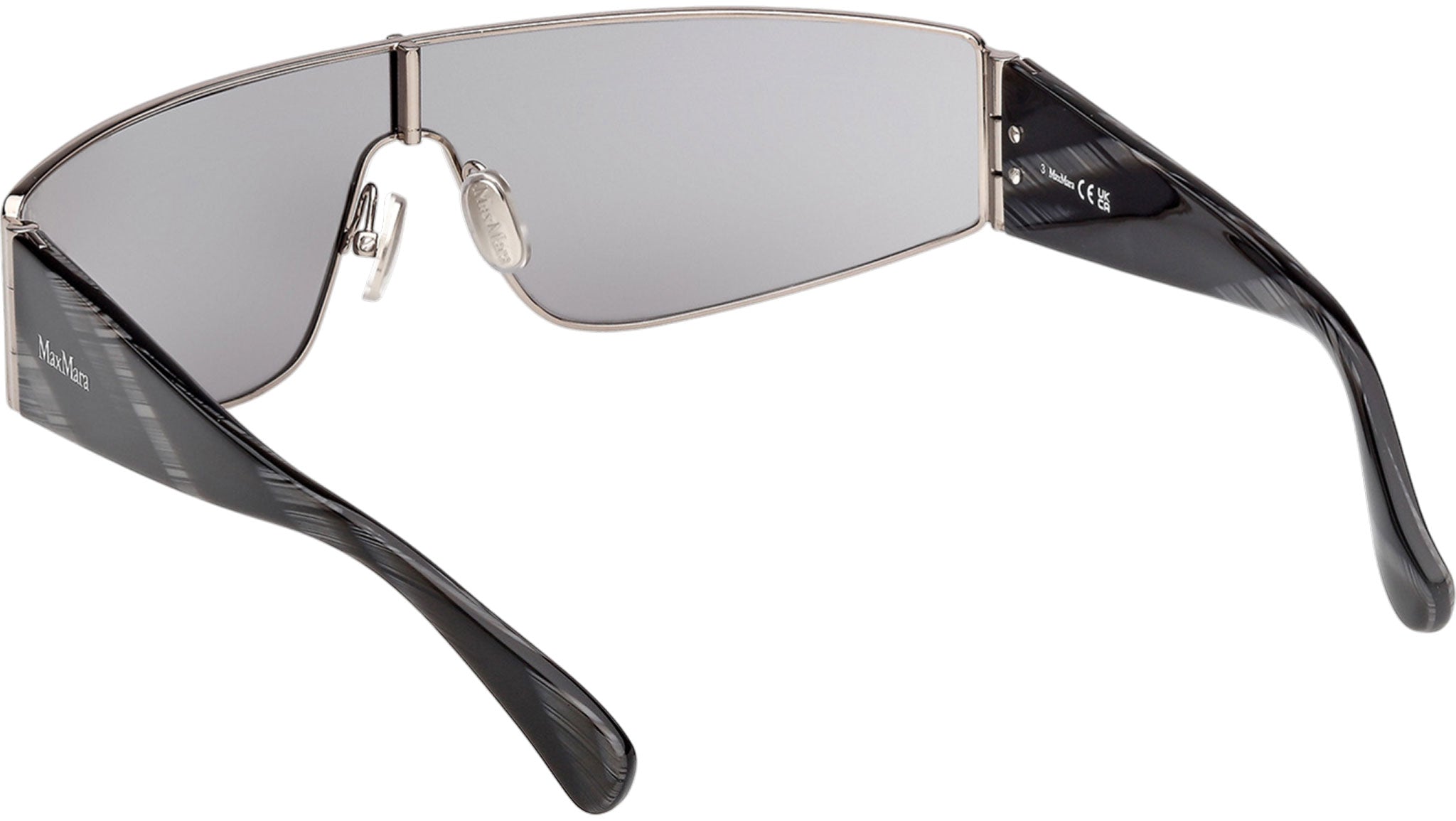 Occhiali da sole Max Mara donna modello Space MM0164 con montatura mascherina full-rim in metallo rutenio chiaro lucido e lenti color grigio fumo. Made in Italy. Codice Brand: MM 0164. Codice colore: 14A. Rivenditore autorizzato Max Mara online. Gli occhiali vengono consegnati con custodia e accessori originali e sono coperti da garanzia standard di 12 mesi del produttore.