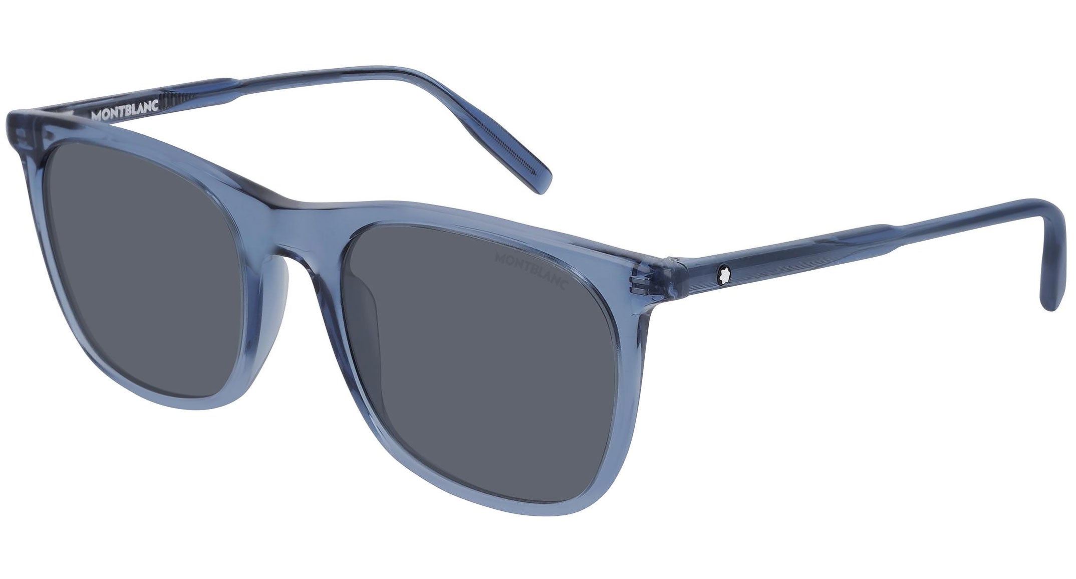 Montblanc sunglasses collection model MB0008S 004 featuring shiny transparent blue frame and grey lens. Montblanc revolutionized the culture of writing with breakthrough innovations. Today, the Maison continues to push boundaries and evolve the expression of fine craftsmanship across each of its product categories: the pinnacle of luxury writing instruments, timepieces, leather goods, accessories, fragrances and eyewear.
