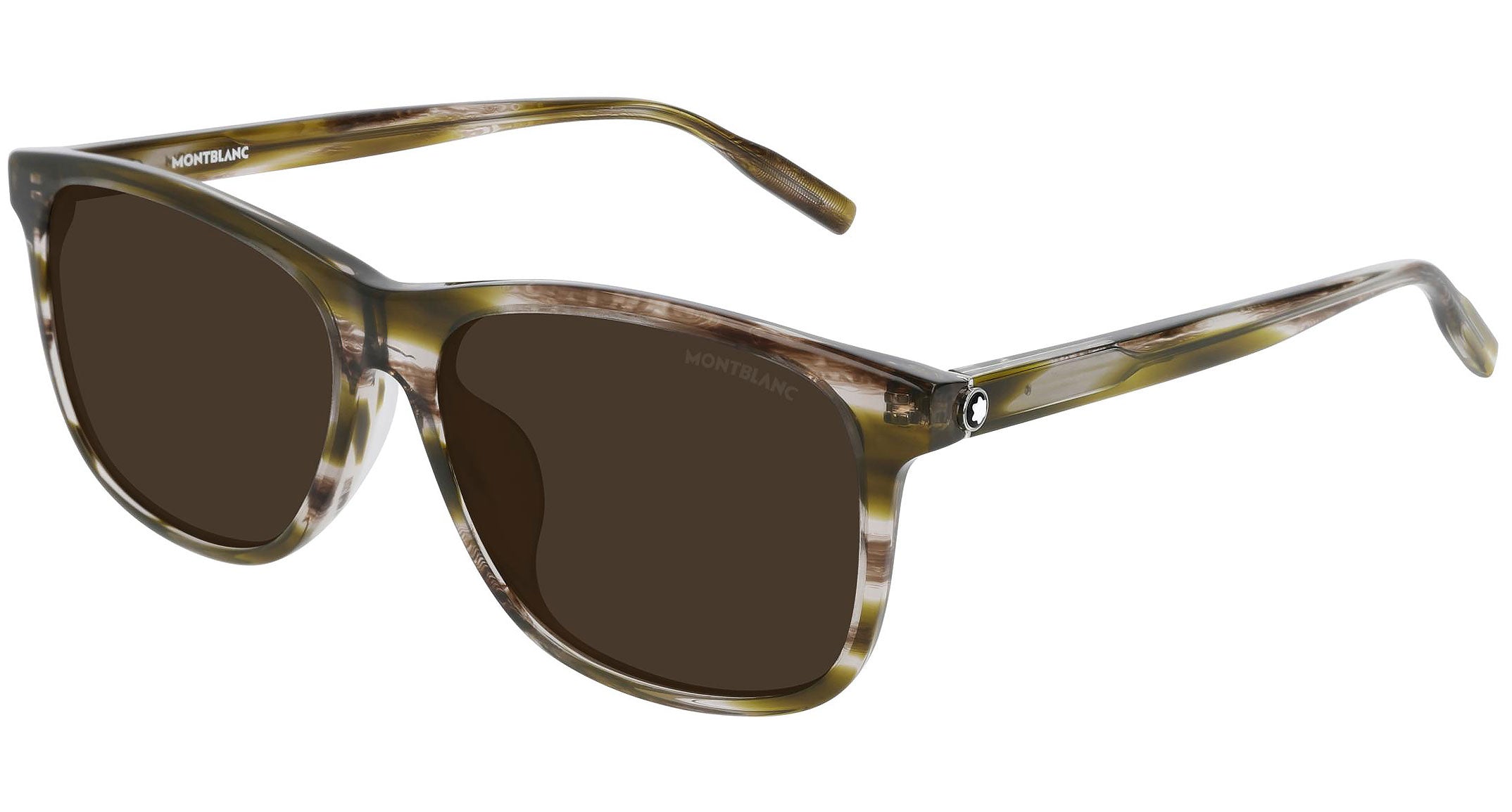 Montblanc sunglasses collection model MB0013SA 002 featuring shiny striped green frame and brown lens. Montblanc revolutionized the culture of writing with breakthrough innovations. Today, the Maison continues to push boundaries and evolve the expression of fine craftsmanship across each of its product categories: the pinnacle of luxury writing instruments, timepieces, leather goods, accessories, fragrances and eyewear.