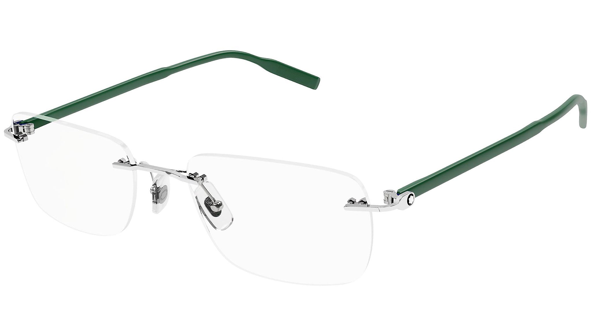 Occhiali da vista Montblanc linea Established modello 0221O, variante colore 004 argento lucido con astine color verde. Nella sua storia, Montblanc ha rivoluzionato la cultura della scrittura, con innovazioni straordinarie. Oggi, la Maison continua a spingersi oltre i confini, progredendo nell'espressione di un artigianato raffinato, in ciascuna delle sue categorie di prodotti: ai vertici negli strumenti di scrittura di lusso, nell'orologeria, nella pelletteria, nei profumi e negli occhiali.