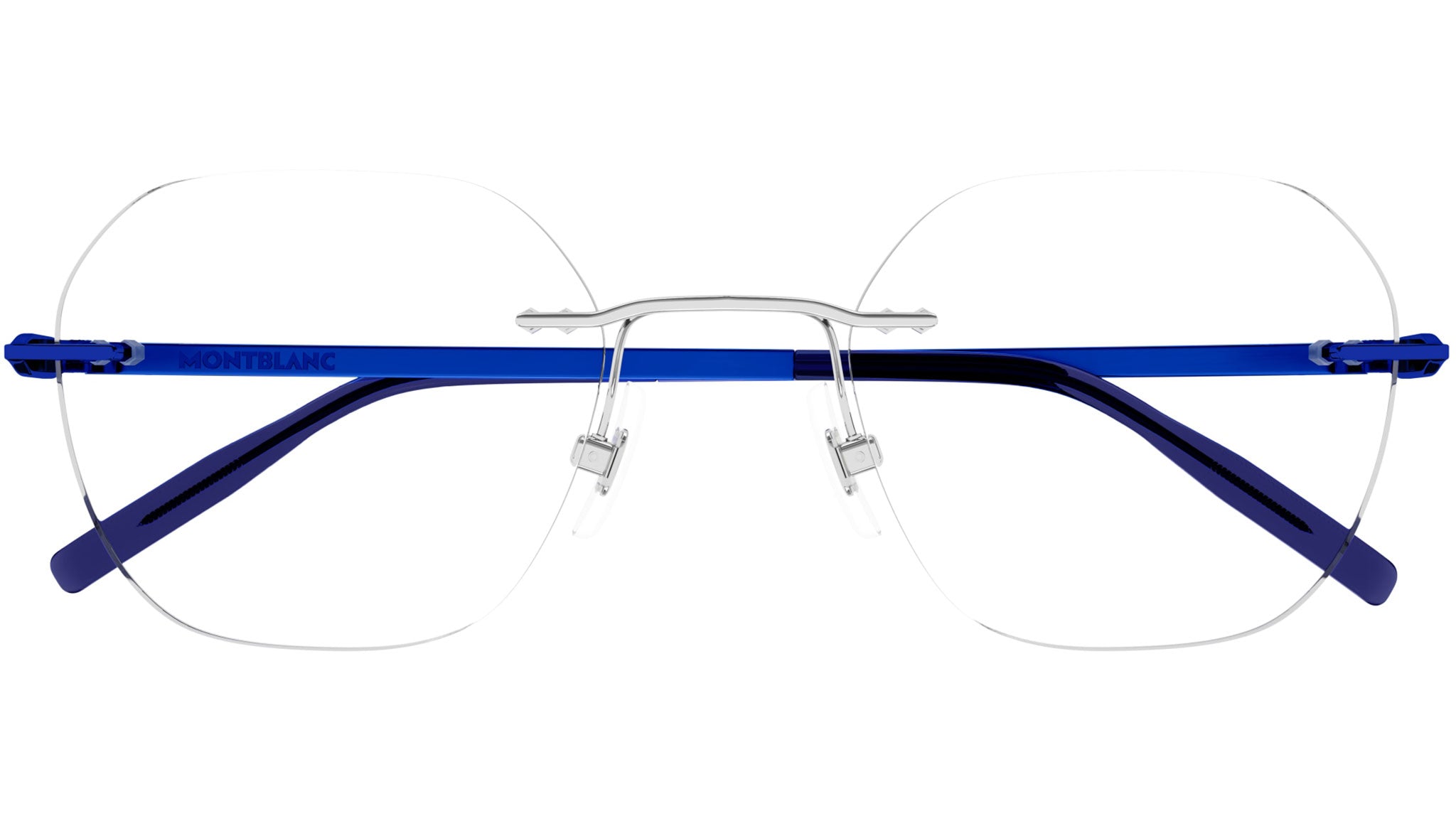 Occhiali da vista Monblanc linea Established modello MB0282O variante colore 008 argento lucido con astine color lenti demo.