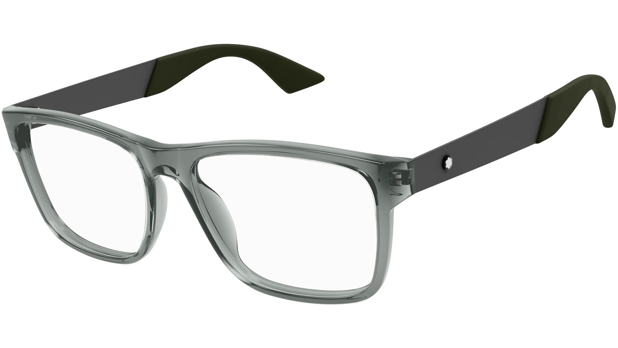 Occhiali da vista Montblanc modello MB0300O rectangle linea Extreme in acetato riciclato, codice colore 003 grigio trasparente lucido con aste color rutenio e lenti demo.