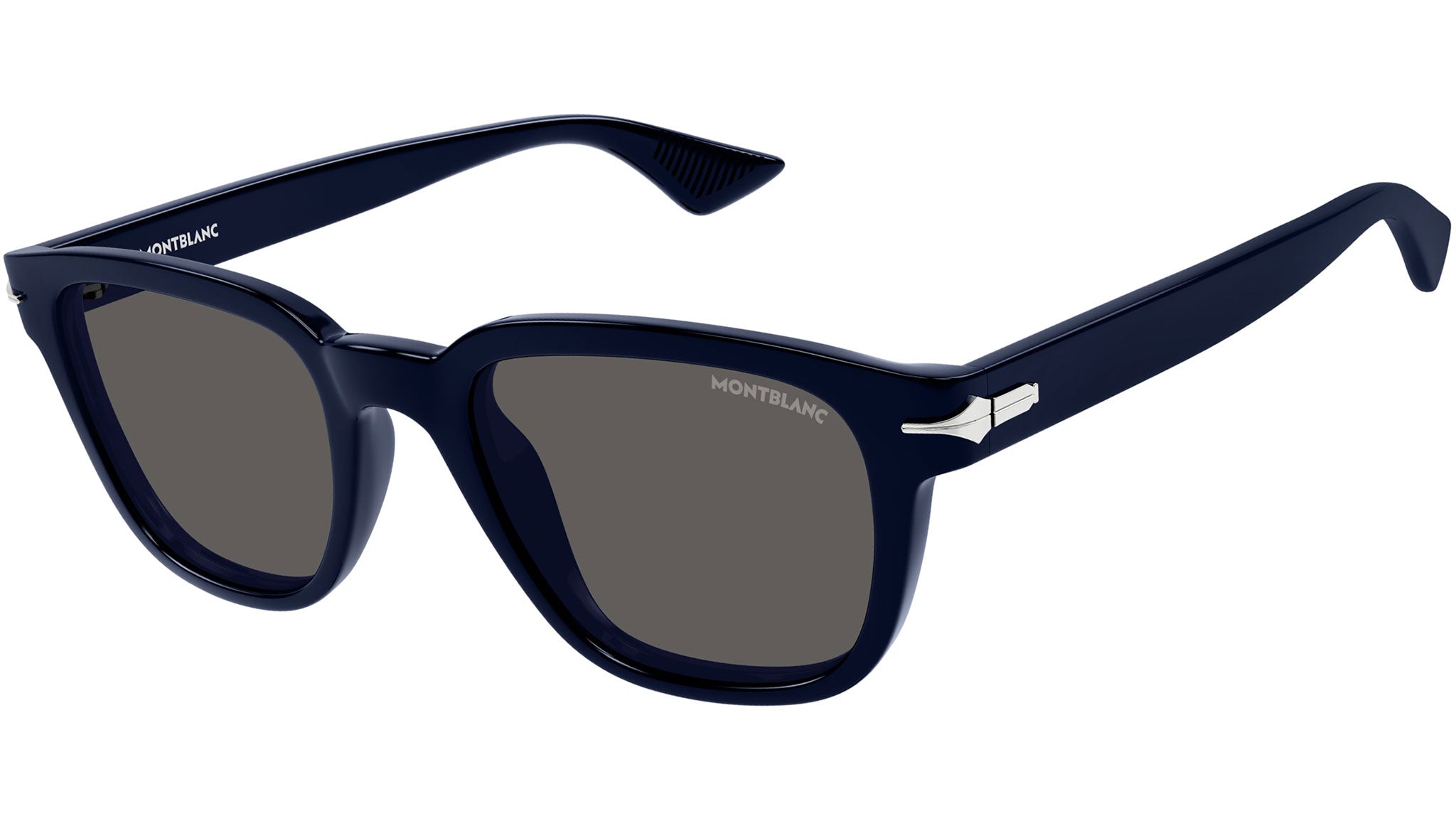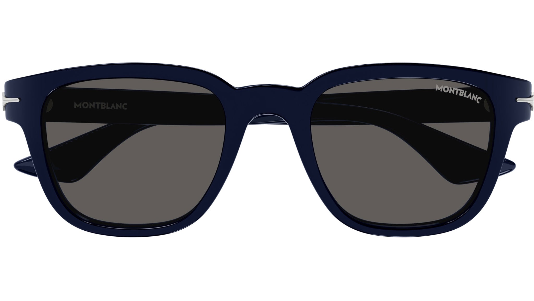 Occhiali da sole Montblanc modello MB0302S rectangle linea Nib in acetato riciclato, codice colore 004 blu lucido tinta unita con aste color blu e lenti color grigio tinta unita.