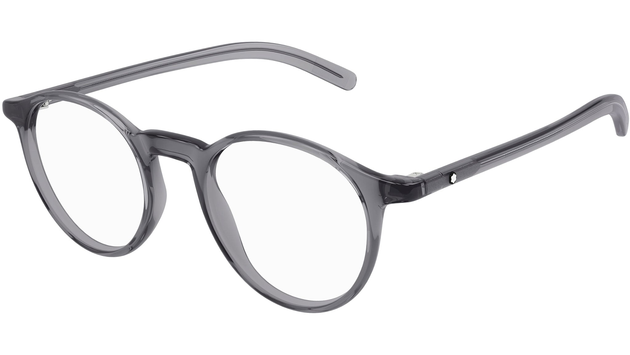 Occhiali da vista Montblanc modello MB0329O linea Snowcap forma panto in acetato iniettato riciclato, colore grigio trasparente lucido con aste color grigio e lenti demo.