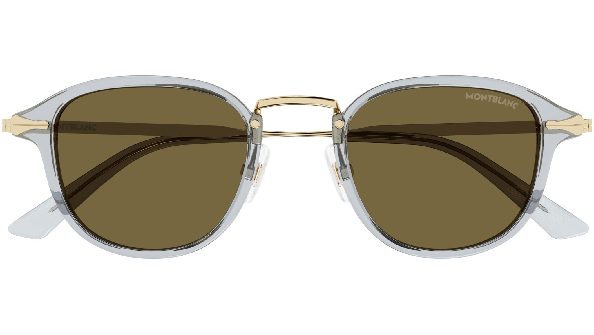 Occhiali da sole Montblanc modello MB0336S linea Nib forma panto in iniettato, codice colore 003 grigio chiaro trasparente con aste color oro e lenti color verde kaki tinta unita.