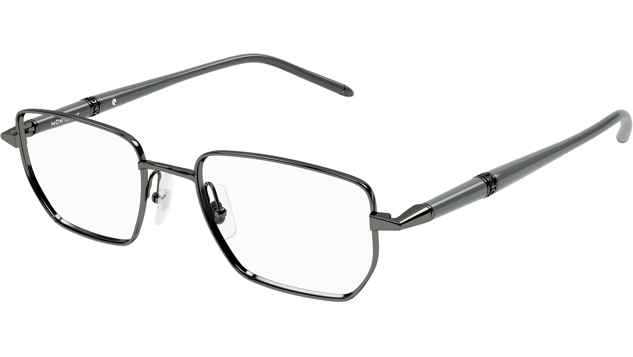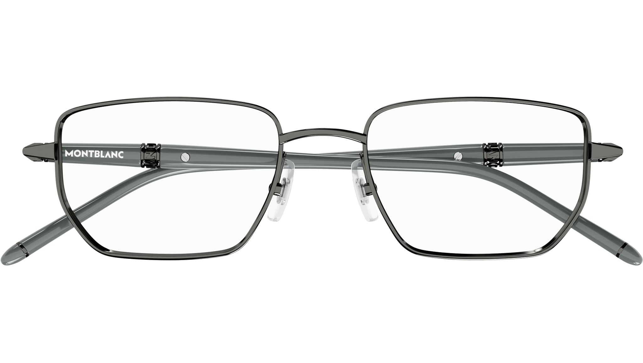 Occhiali da vista Montblanc modello MB0347O linea Meisterstück forma rettangolare in metallo, codice colore 006 rutenio scuro lucido con aste color grigio e lenti demo.